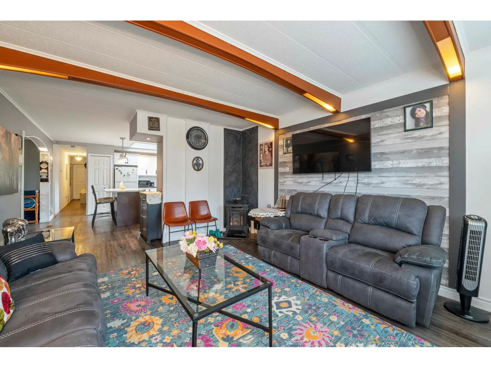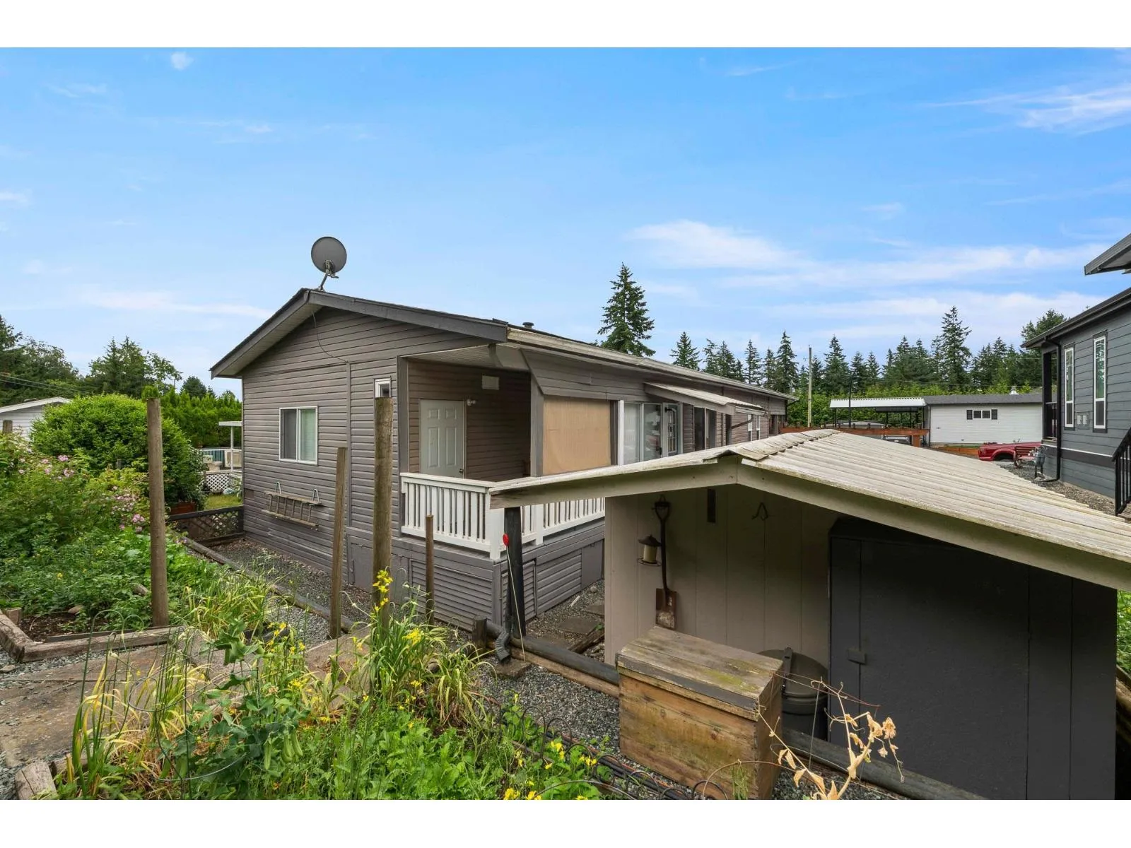 Perfect Pioneer 55+ Park. This mid-hilltop home offers a blend of modern updates & natural surroundings, making it a perfect retreat. Located across from a park, it features a new pitched roof added in 2021 and durable vinyl siding for minimal upkeep. The updated kitchen with a skylight invites abundant natural light, and laminate flooring adds a sleek touch throughout. The primary bedroom has an ensuite door to a spacious main bath. For gardening enthusiasts, the tiered gardens are inviting. Enjoy the outdoors on the cozy covered porch & a large open deck. Low-maintenance yard backs onto greenspace, offering privacy. With ample parking & allowance for 2 pets without size restrictions, this property is full of possibilities. Co-op Fee just $510/mnth. (id:27476)