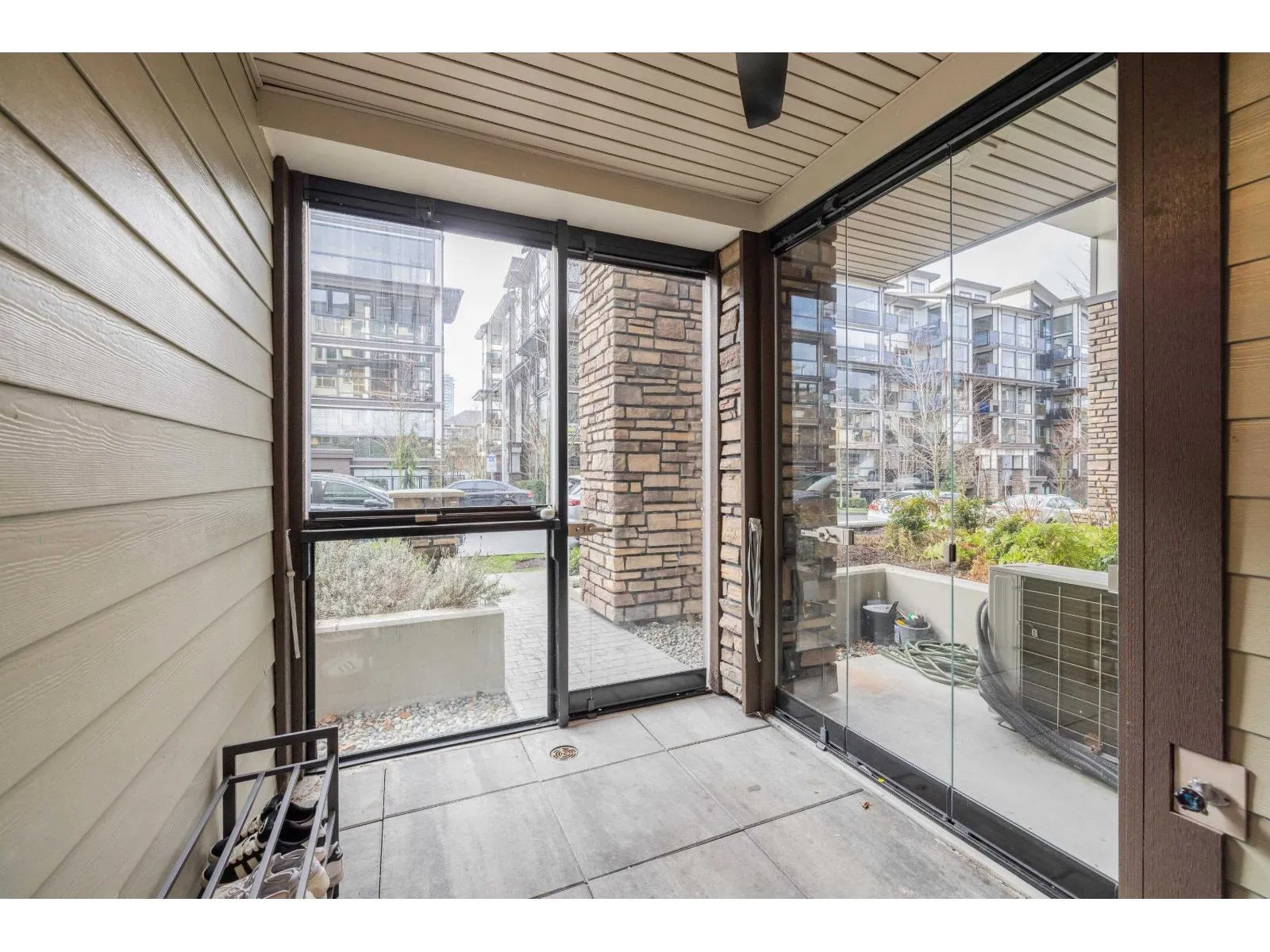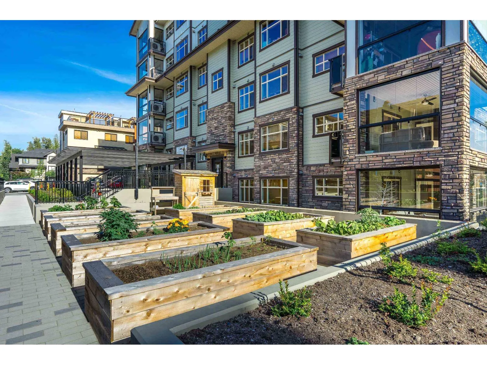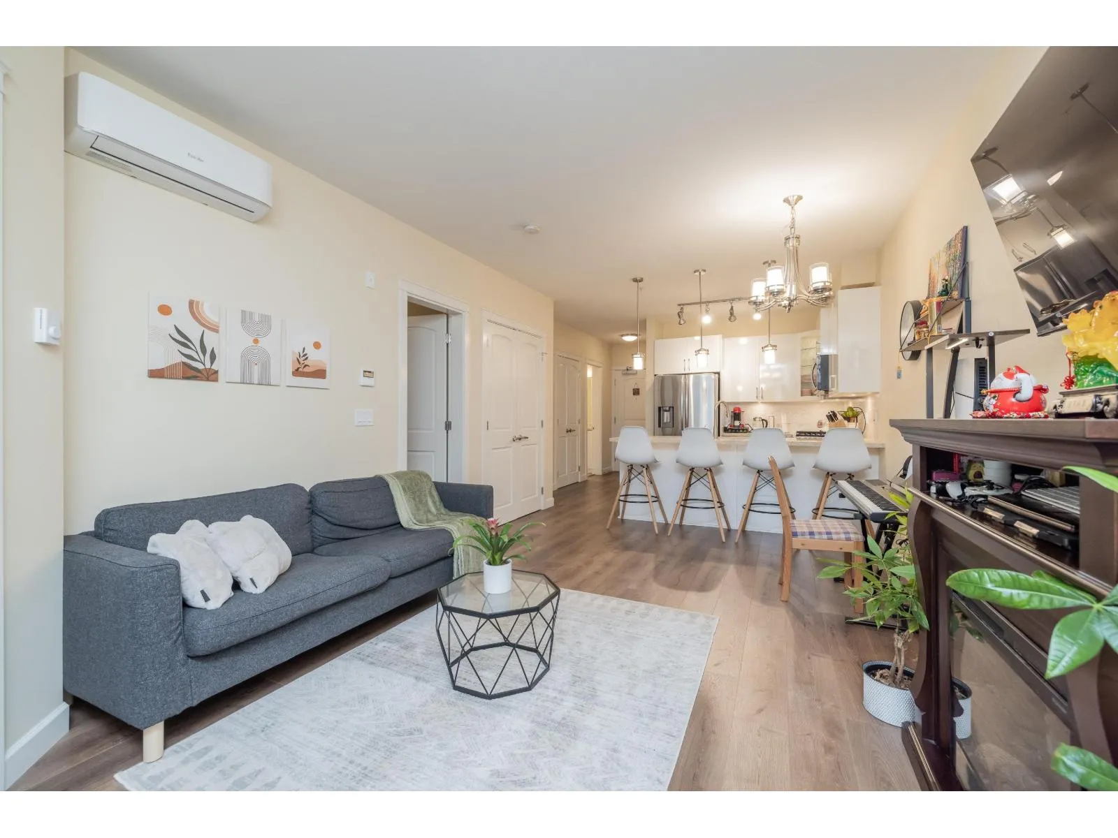 Welcome to Yorkson Park! This 2 bed + flex home offers modern style and smart function in a quality-built, only 4-year-old building. The gourmet kitchen features quartz counters, stainless appliances, and a gas range. Enjoy year-round comfort with A/C, an electric fireplace, and heated bathroom floors. The flex space is ideal for a home office or extra storage. An enclosed solarium expands your living area and overlooks the quiet courtyard. Bonus: 2 parking stalls + secure storage. Steps to shops, restaurants, Carvolth Exchange, and quick Hwy 1 access. (id:27476)