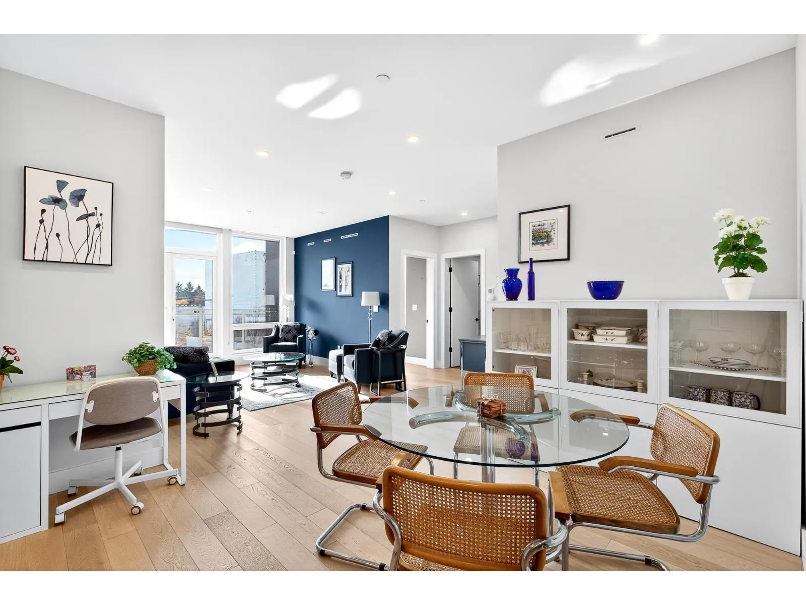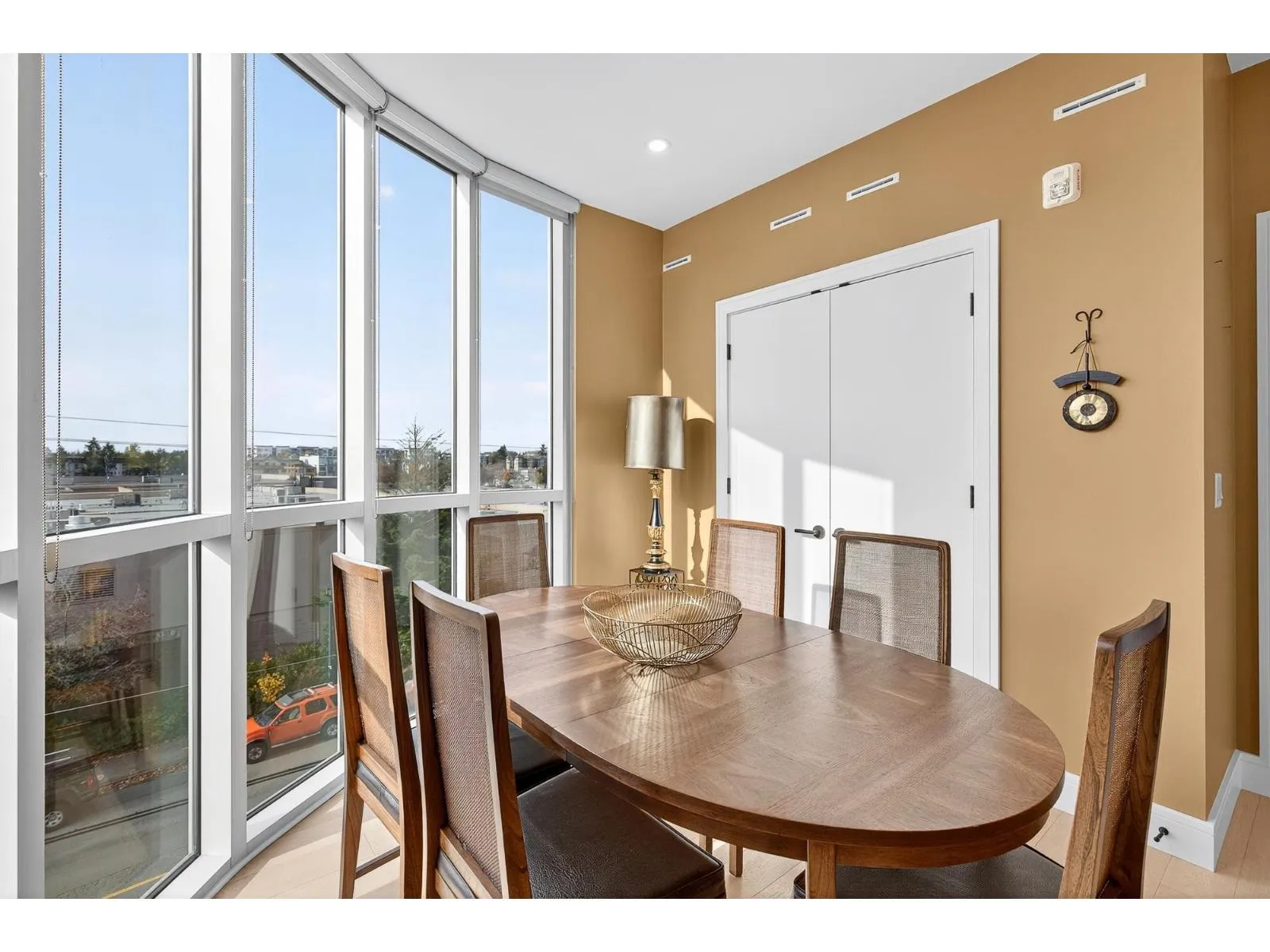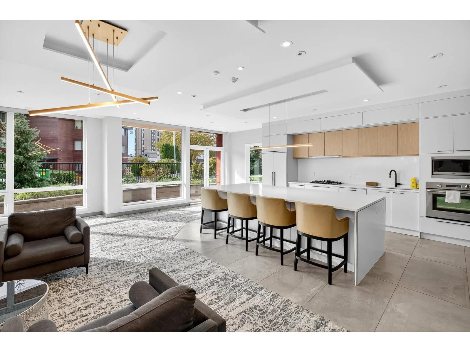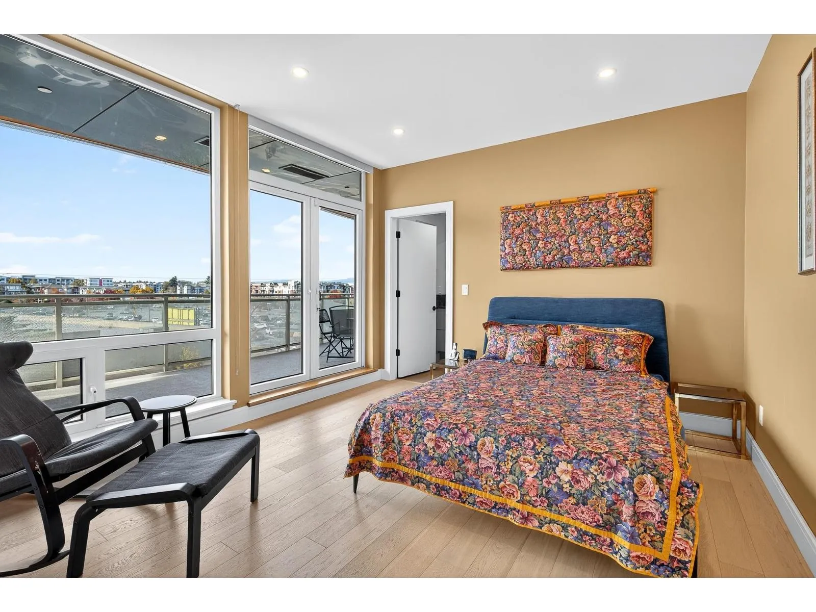This stunning, wide, 2-bedroom home offers a bright and airy layout with soaring floor-to-ceiling windows. Step out onto your expansive private deck and take in the architectural beauty of this uniquely curved, modern building. Inside, you'll find high-end features throughout, including ducted heating and cooling, low-carbon Mass Timber construction, and premium finishes like a built-in high-end appliance package, Caesarstone countertops, and 3/4" solid oak hardwood flooring. Thoughtful details such as floor drains in the bathrooms and laundry area, German-engineered windows and sound-insulated interior walls enhance comfort and functionality. Walk to shopping, restaurants and recreation. 2 large decks front deck is 349 sq. ft. Open House Sunday February 15, 2:00pm-4:00pm (id:27476)