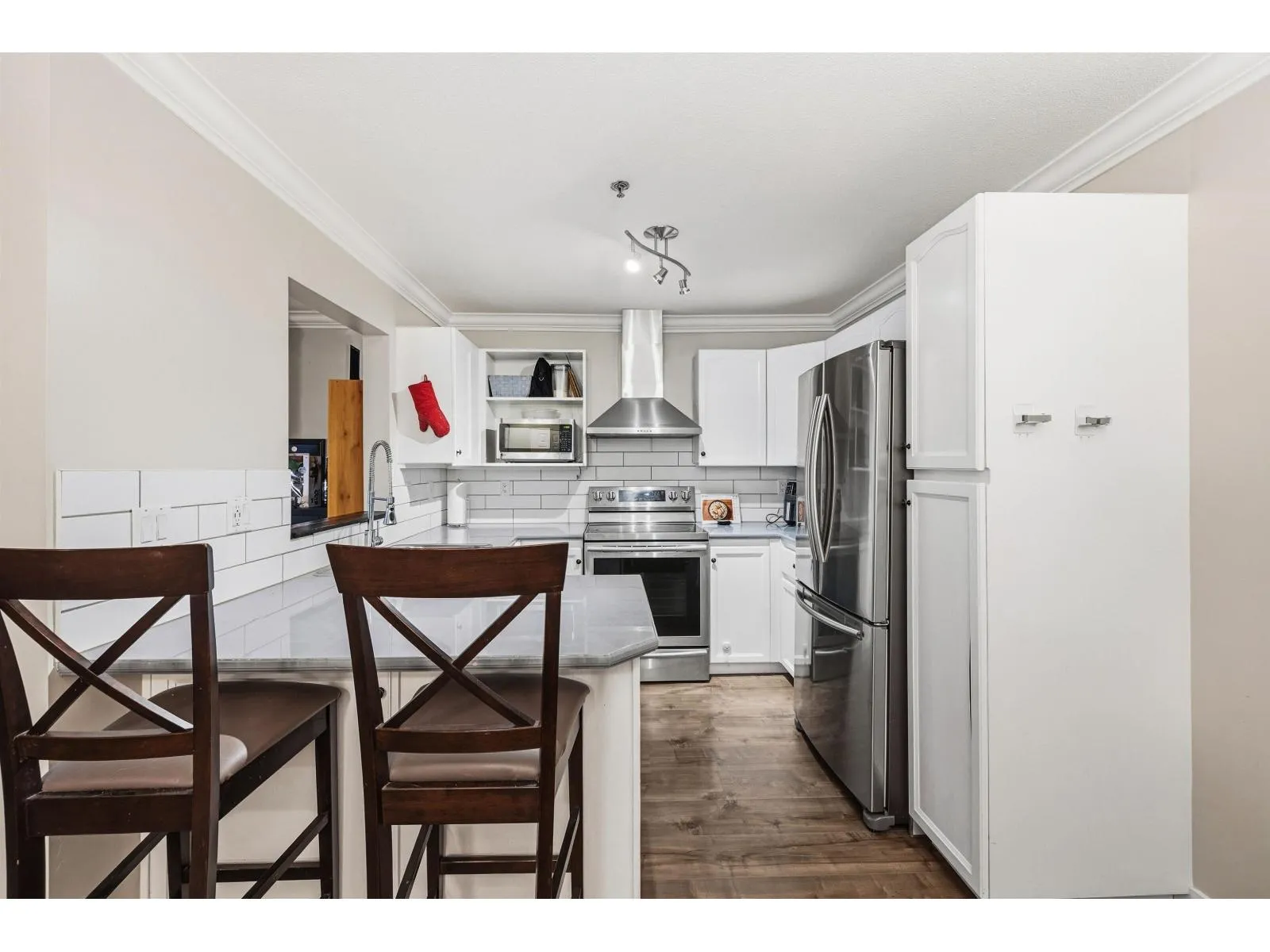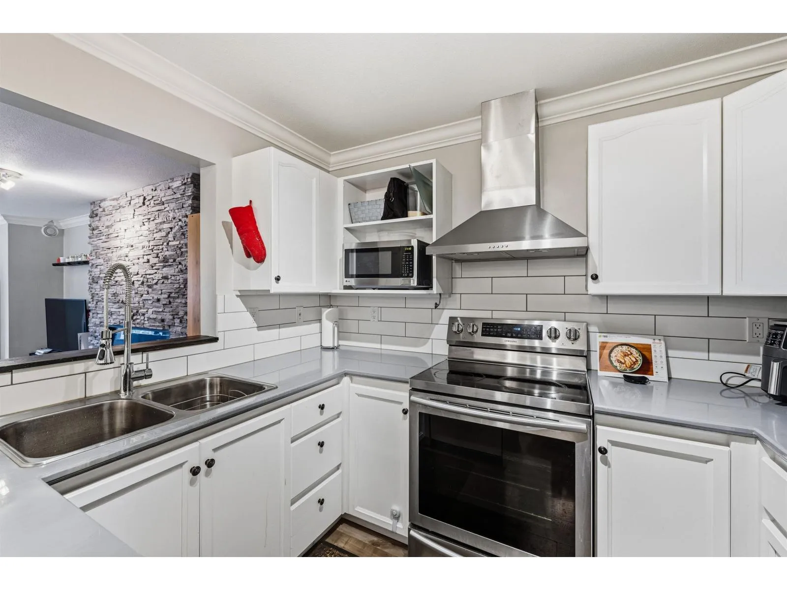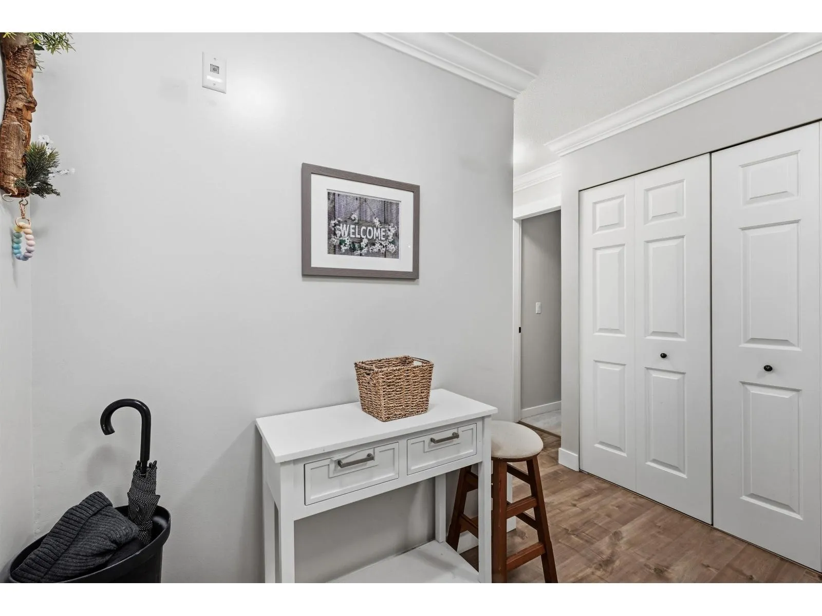 Prime location! This beautifully updated 1,087 sq ft, 2 bed, 2 bath home is just steps from everything Langley has to offer. Restaurants, Willowbrook Mall, transit, and the future SkyTrain are all within two blocks of your front door. A welcoming foyer opens into an inviting living area highlighted by a striking stone fireplace. Extensively renovated in 2020, the home features laminate flooring, designer paint colours, an updated kitchen, and elegant crown mouldings throughout. The generous primary bedroom boasts a feature wall, barn door to walk-through closet leading to ensuite. Relax and unwind on the south-facing covered patio, perfect for summer evenings. Complete with in-suite laundry, pet-friendly living, and two parking stalls, storage on the same floor. An exceptional opportunity! (id:27476)