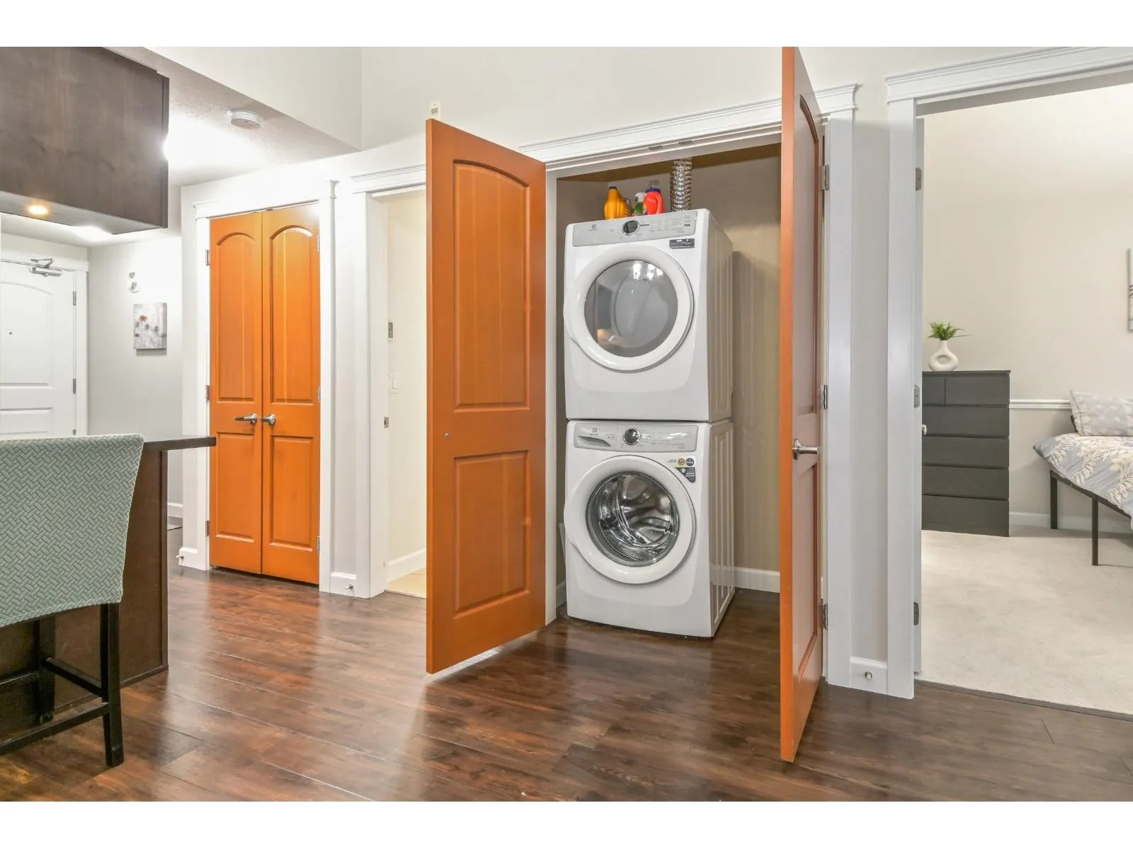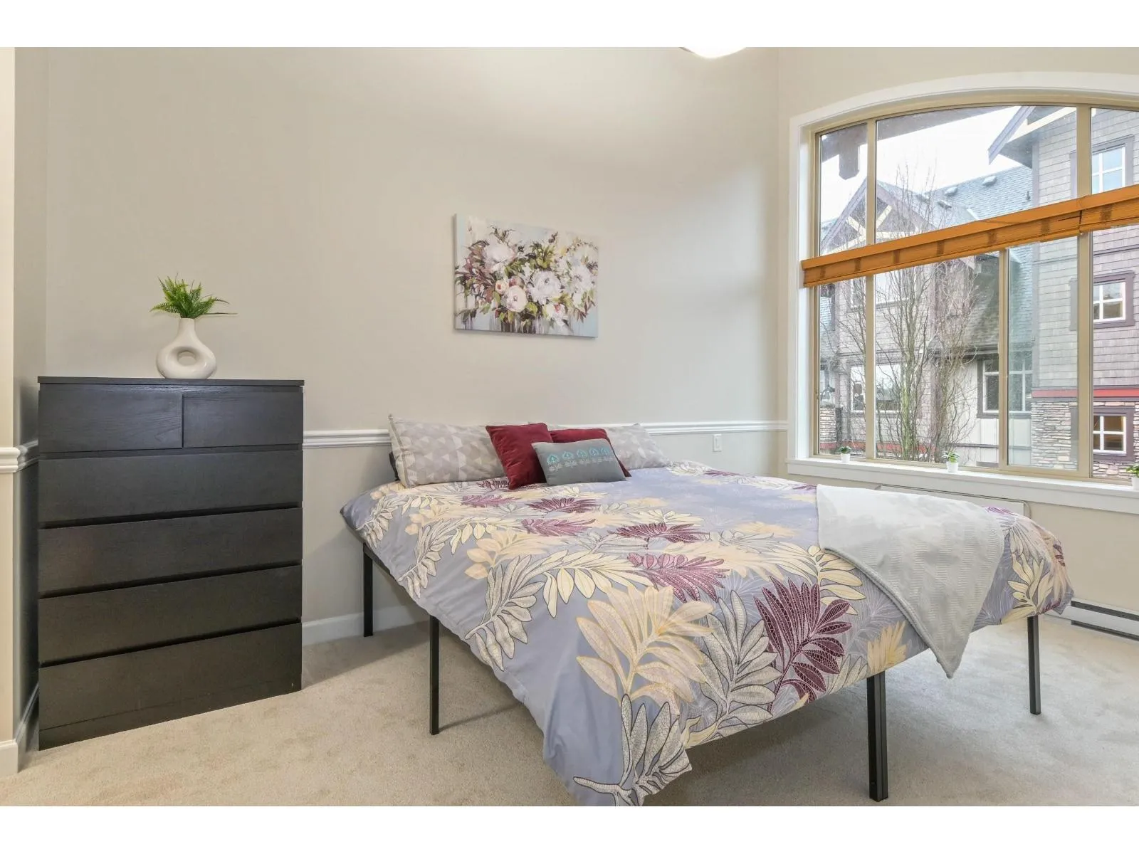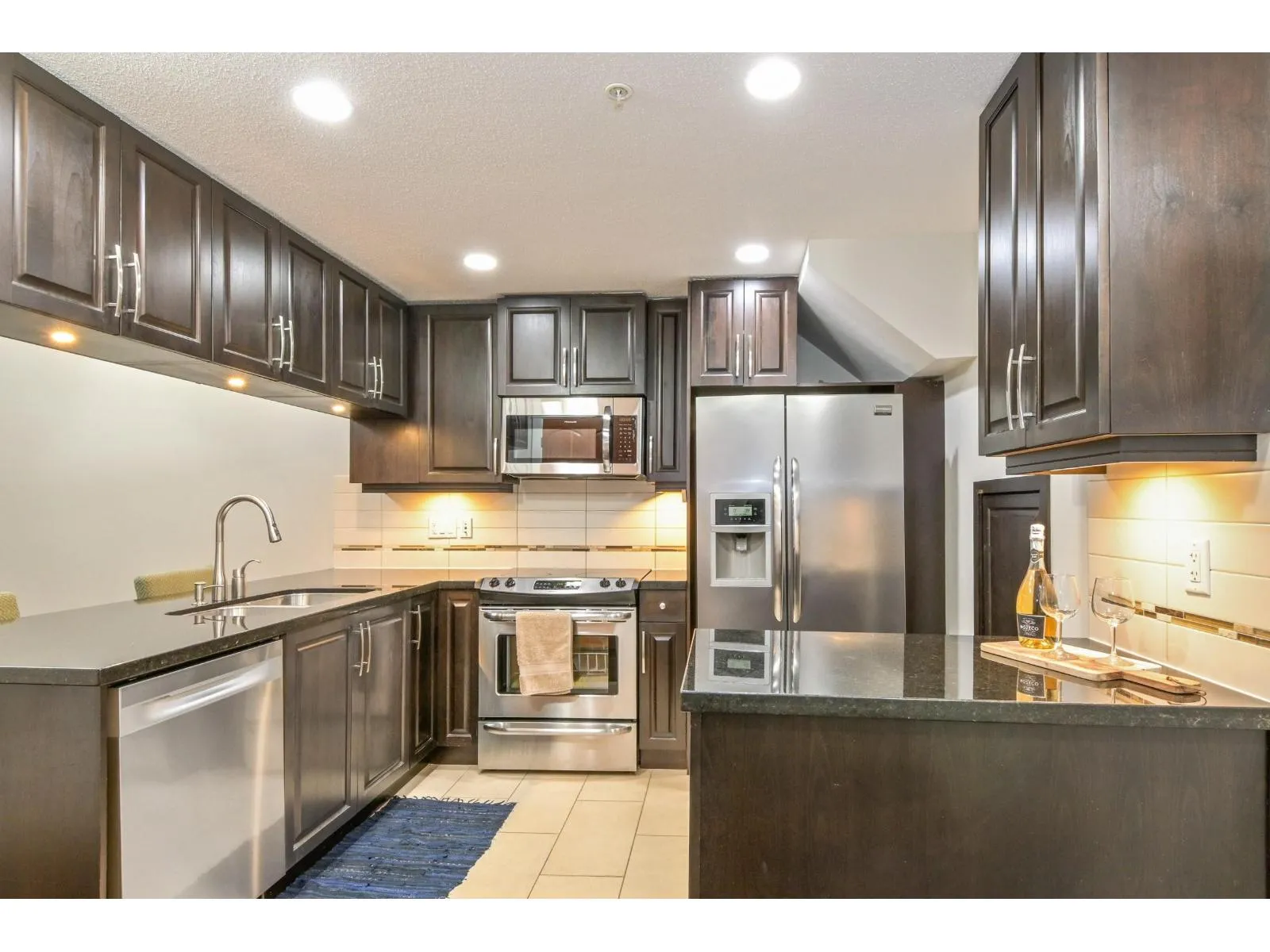 Top floor two-level junior 3 bedroom 2 bath offering townhouse style living. Features a large balcony with mountain views, granite counter tops, self closing cabinetry, new microwave and dishwasher, new carpets, and fresh paint throughout. A/C units in both primary bedrooms that provide move-in ready comfort. The upper level primary bedroom includes an ensuite with double sinks, soaker tub, walk in shower, heated floors, and a walk in closet with built in shelving, and in-suite storage. Includes two parking stalls and storage locker with electrical out for EV charging potential. The building amenities include a gym and a party room. (id:27476)