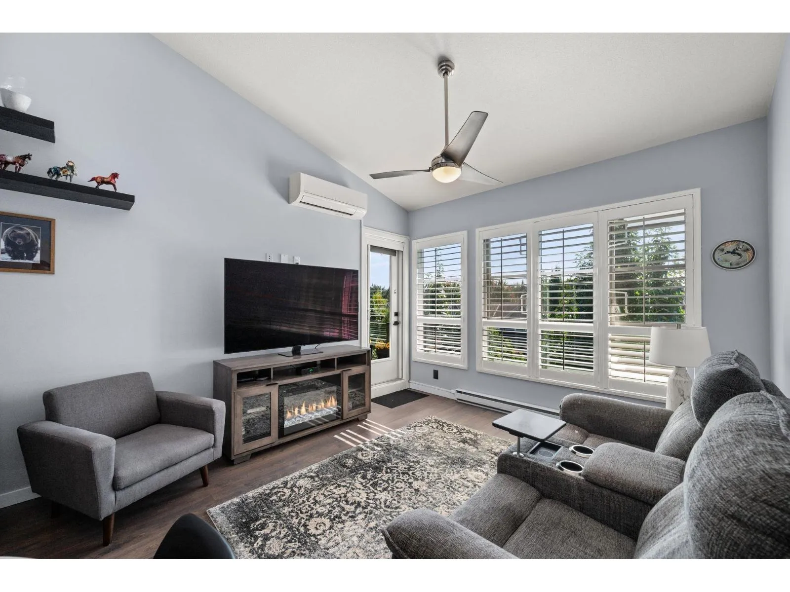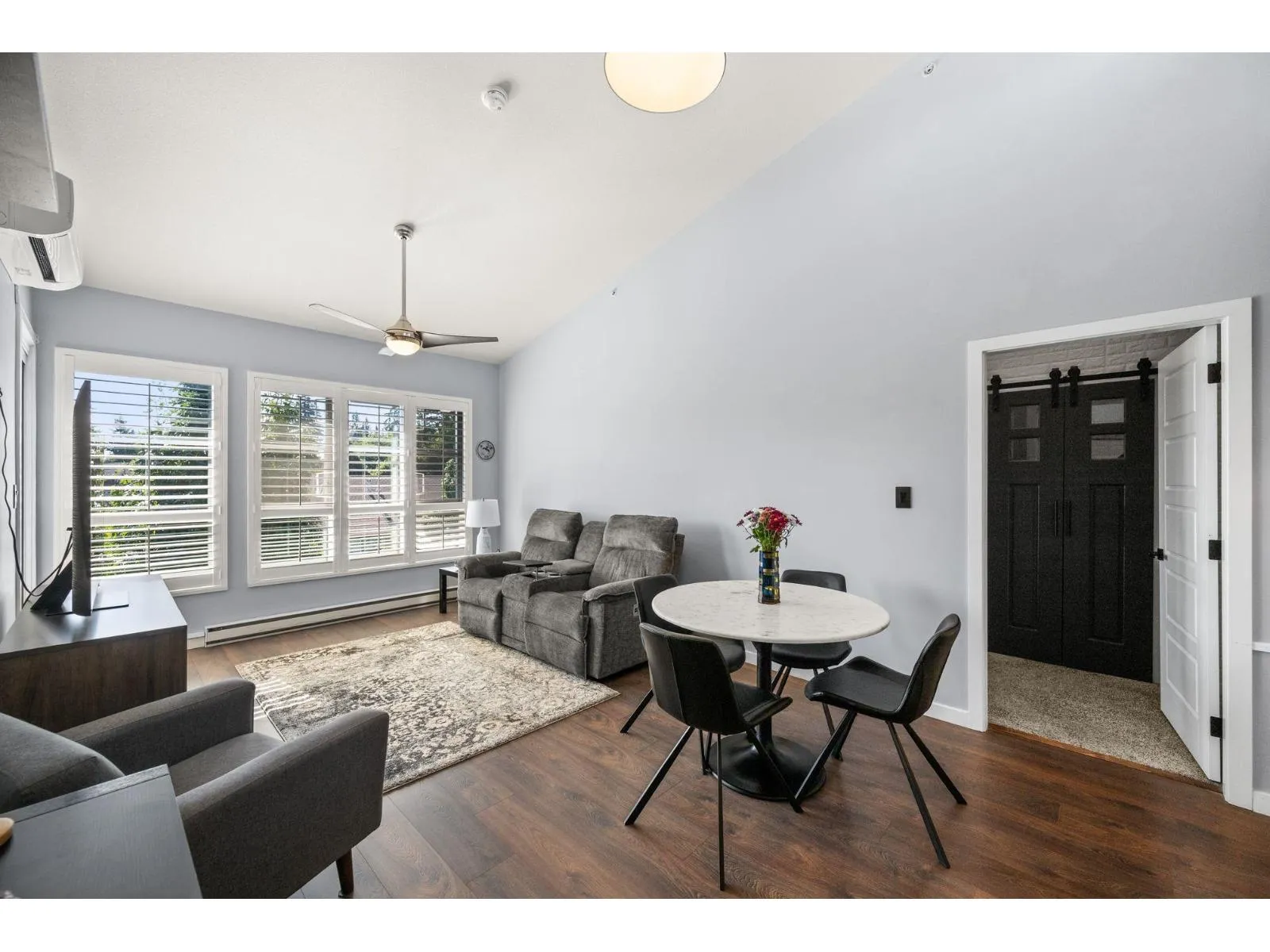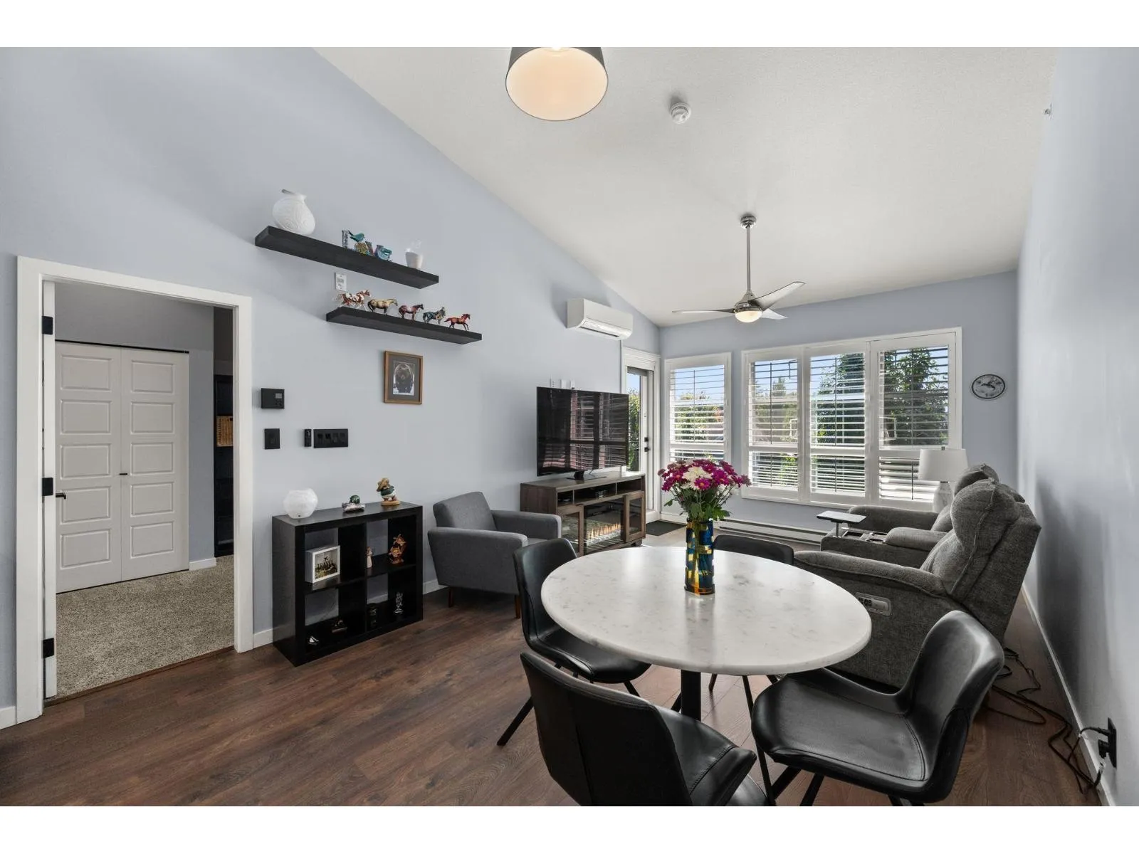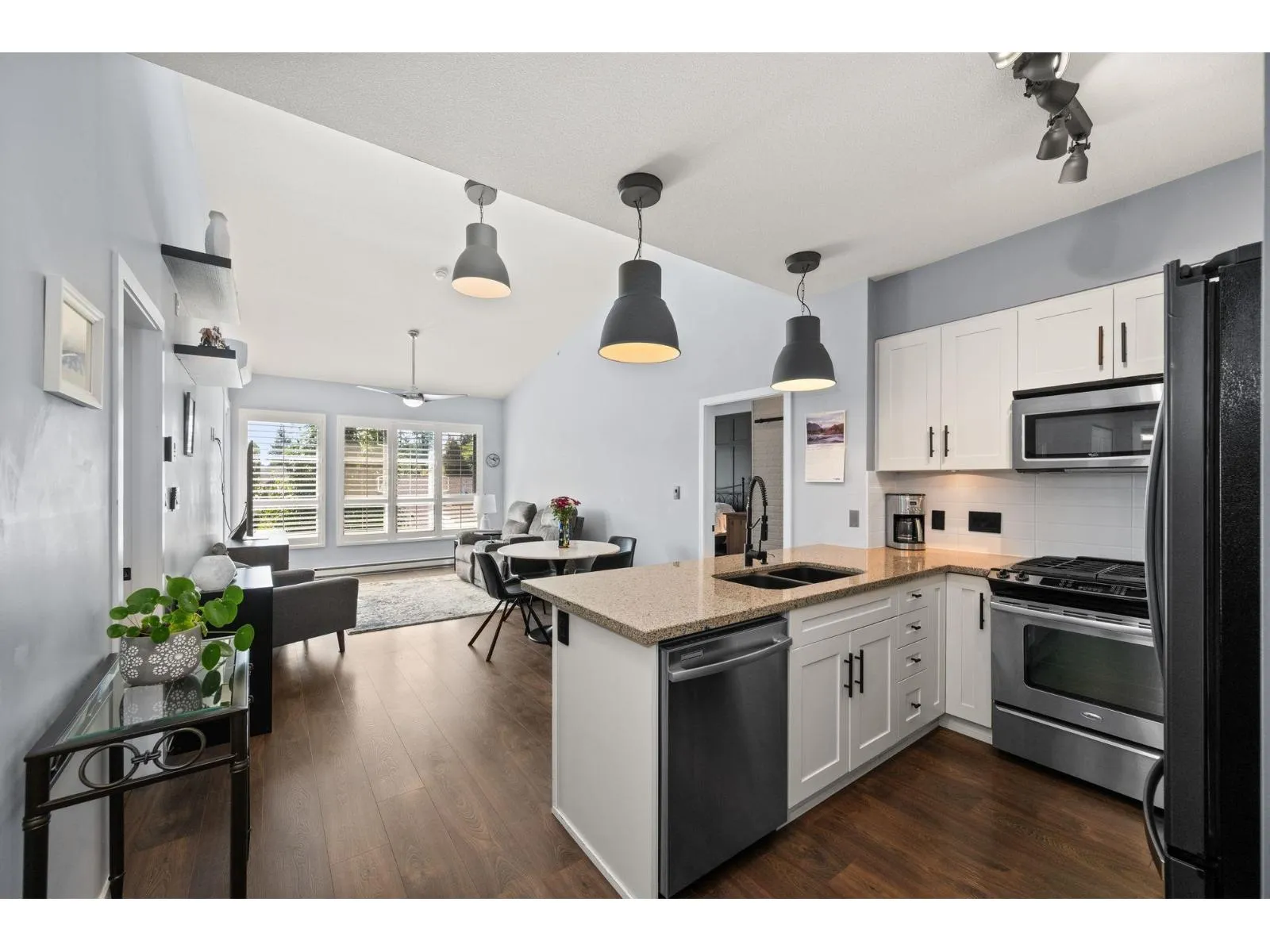 TOP FLOOR, VAULTED CEILINGS! Beautifully bright and sunny south exposure! Downsizer alert! This is the unit that you've been waiting for! Downsize in safety and comfort in this 2BDRM 2 BATH condo, with one occupant needing to be 55+ in age. Up to 13'ft vaulted ceilings! White kitchen cabinetry, S/S appliance package incl gas stove, granite counters. Heated ensuite tile floor in the master bath. 2nd Bdrm with cheater ensuite/main bath. Updated laminate floors and newer carpet in bdrm's. California shutters. Updated paint and lighting throughout. BONUS storage locker on the same floor and 2 side by side parking stalls. Secure bike storage, fitness room and clubhouse included!NEW Heatpump offering A/C! (id:27476)