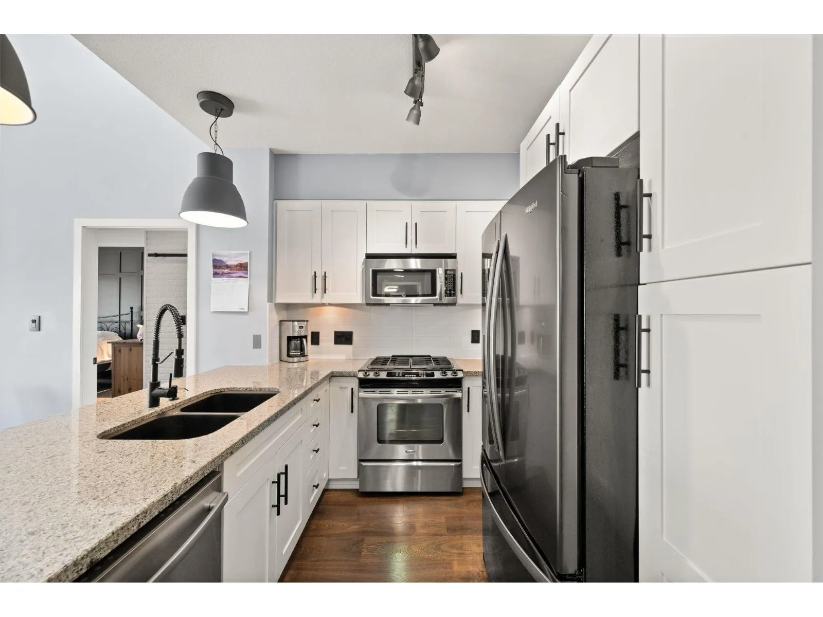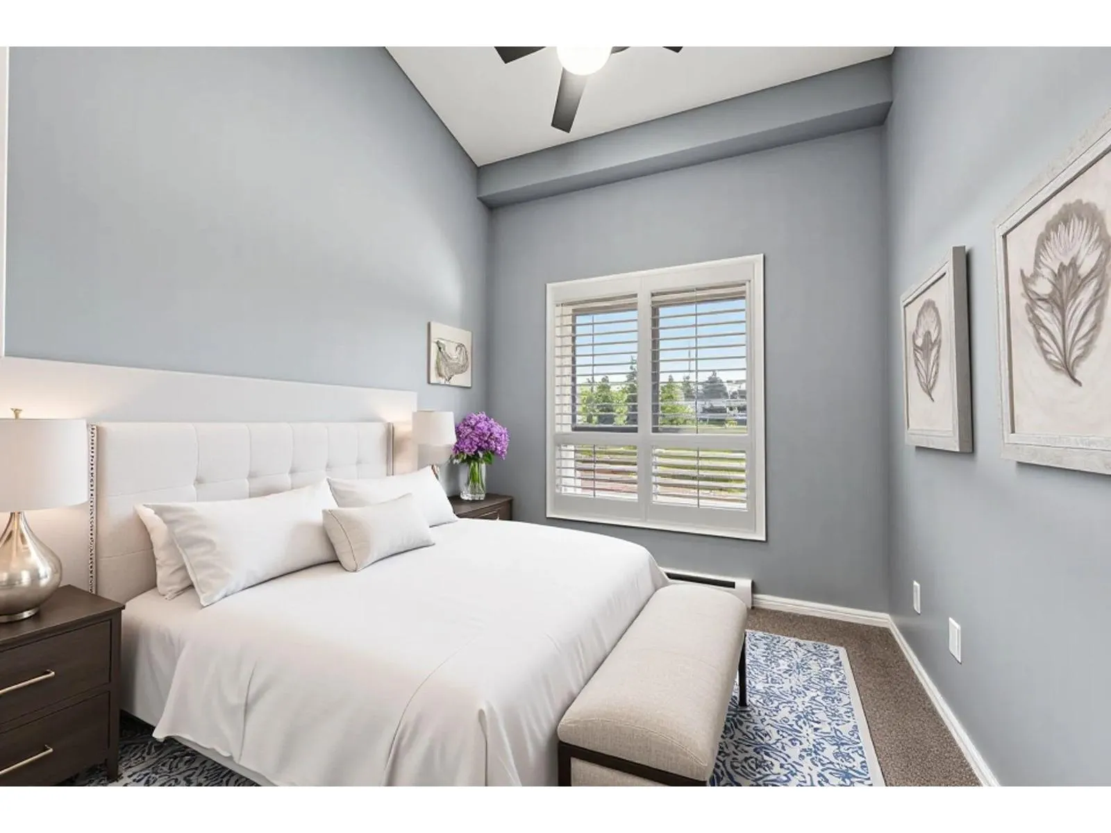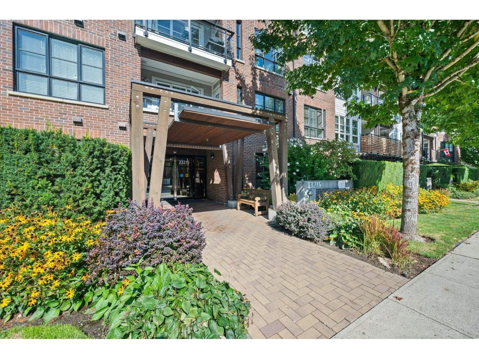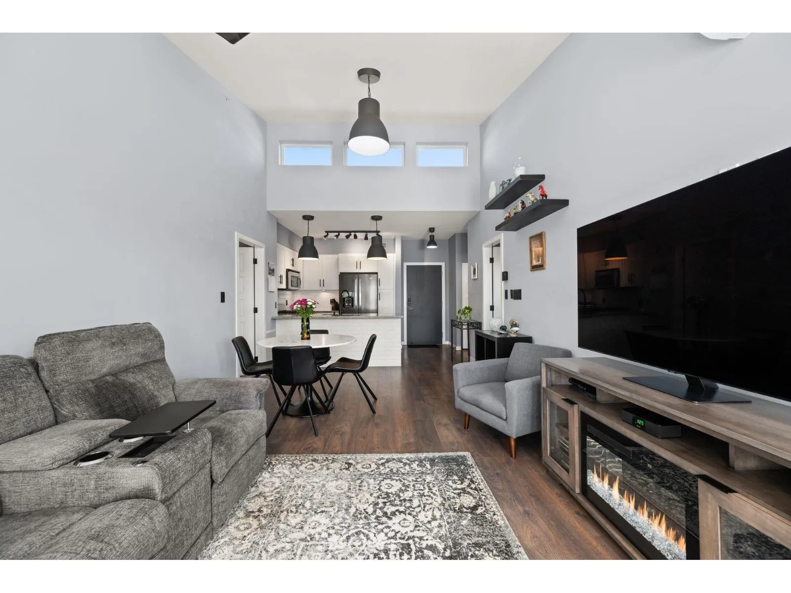 TOP FLOOR, VAULTED CEILINGS! Beautifully bright and sunny south exposure! Downsizer alert! This is the unit that you've been waiting for! Downsize in safety and comfort in this 2BDRM 2 BATH condo, with one occupant needing to be 55+ in age. Up to 13'ft vaulted ceilings! White kitchen cabinetry, S/S appliance package incl gas stove, granite counters. Heated ensuite tile floor in the master bath. 2nd Bdrm with cheater ensuite/main bath. Updated laminate floors and newer carpet in bdrm's. California shutters. Updated paint and lighting throughout. BONUS storage locker on the same floor and 2 side by side parking stalls. Secure bike storage, fitness room and clubhouse included!NEW Heatpump offering A/C! (id:27476)