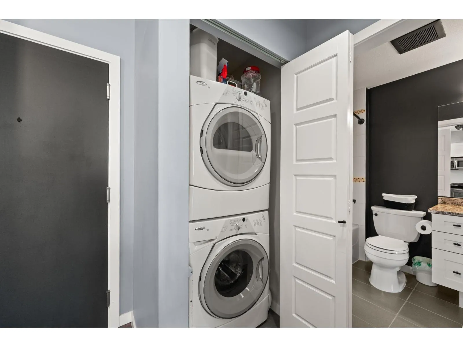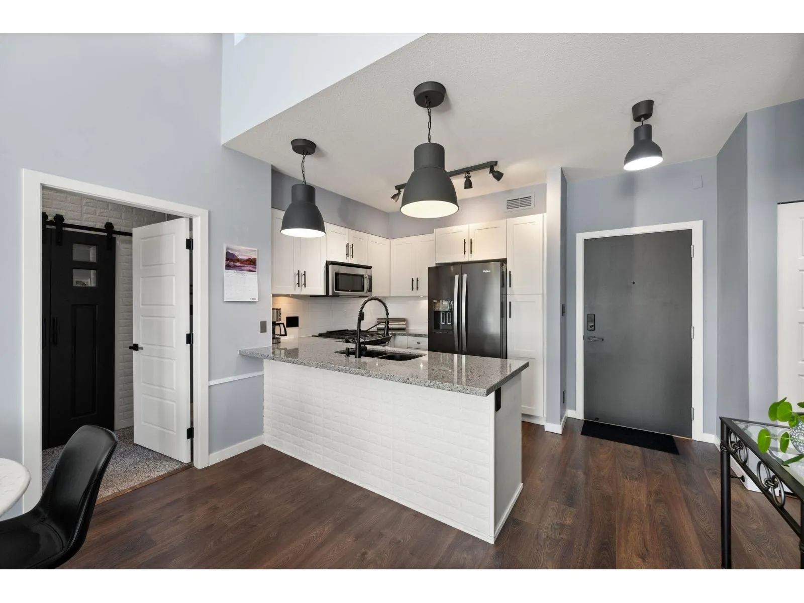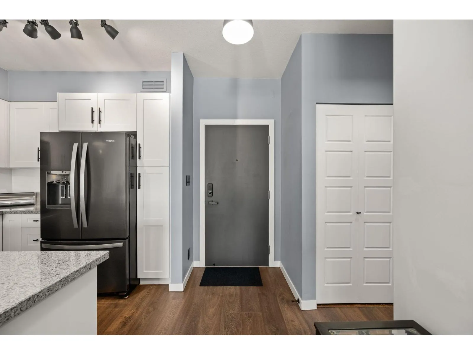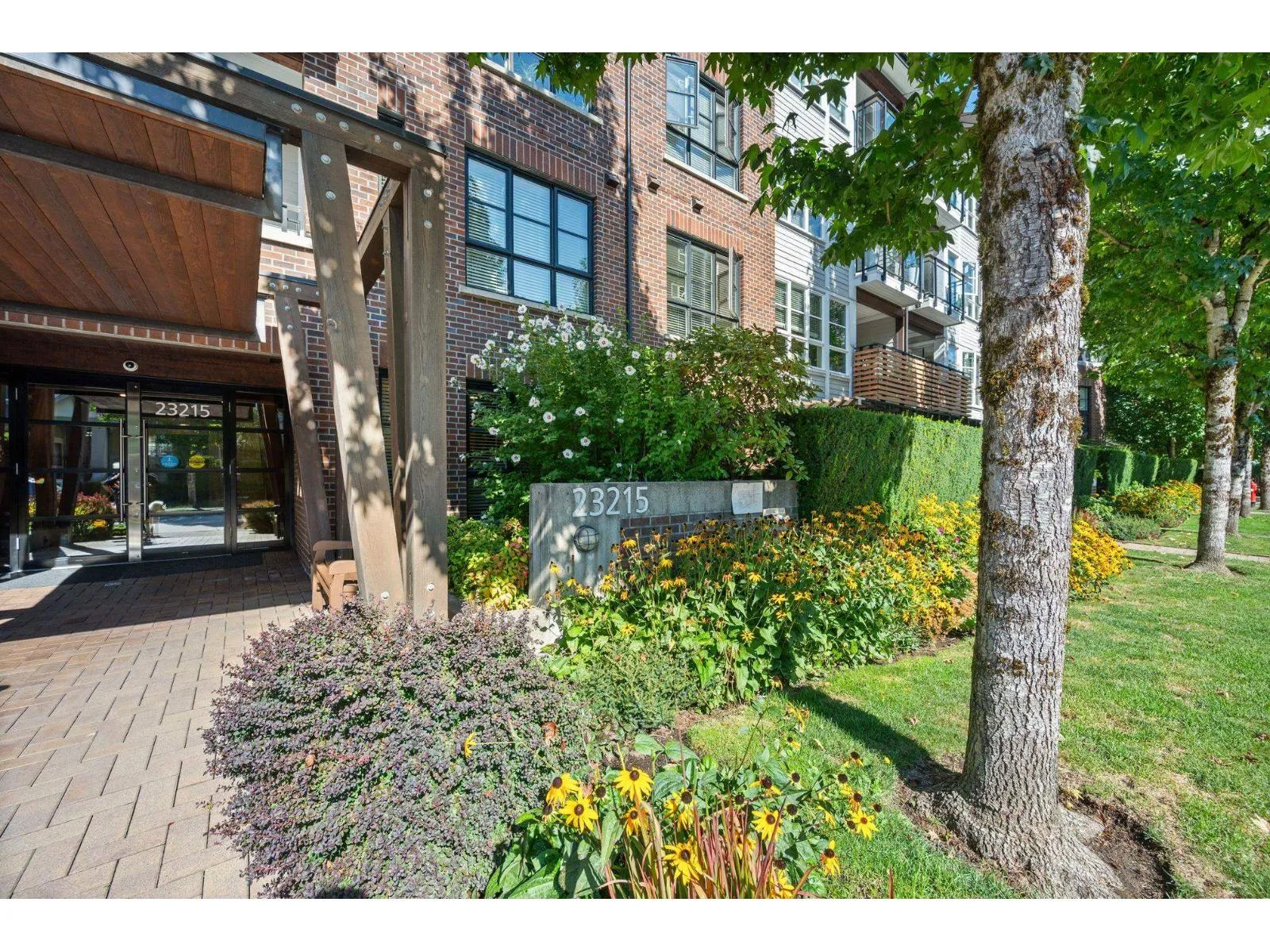 TOP FLOOR, VAULTED CEILINGS! Beautifully bright and sunny south exposure! Downsizer alert! This is the unit that you've been waiting for! Downsize in safety and comfort in this 2BDRM 2 BATH condo, with one occupant needing to be 55+ in age. Up to 13'ft vaulted ceilings! White kitchen cabinetry, S/S appliance package incl gas stove, granite counters. Heated ensuite tile floor in the master bath. 2nd Bdrm with cheater ensuite/main bath. Updated laminate floors and newer carpet in bdrm's. California shutters. Updated paint and lighting throughout. BONUS storage locker on the same floor and 2 side by side parking stalls. Secure bike storage, fitness room and clubhouse included!NEW Heatpump offering A/C! (id:27476)