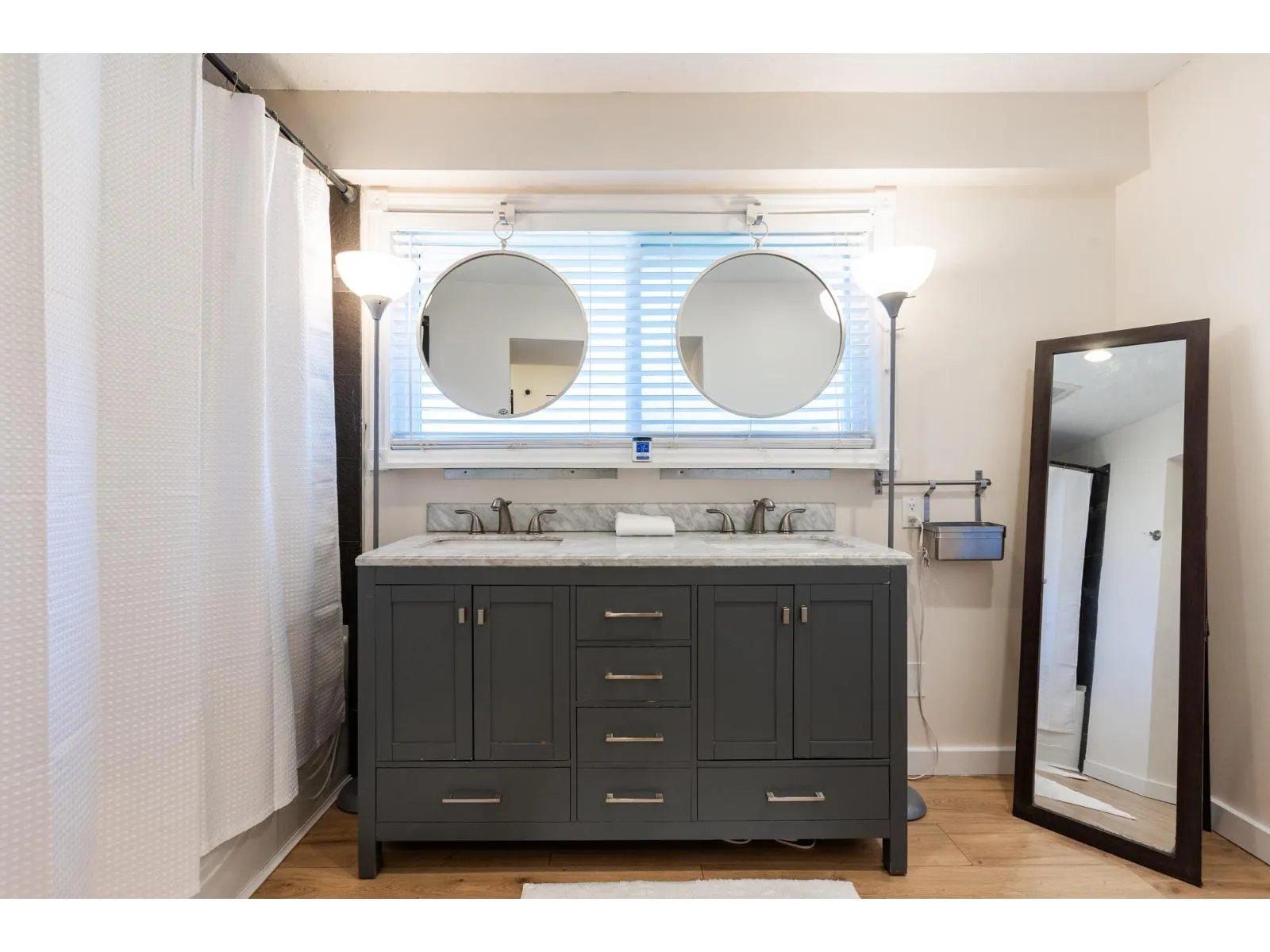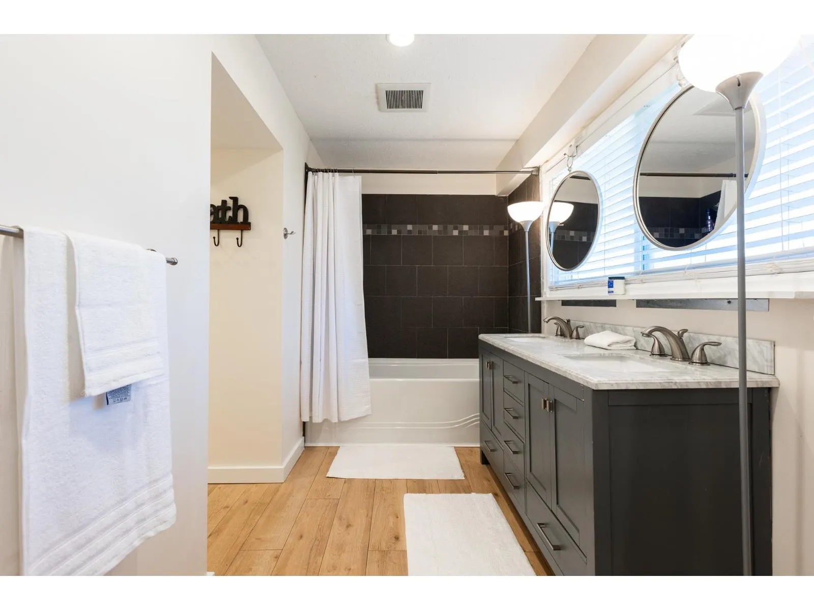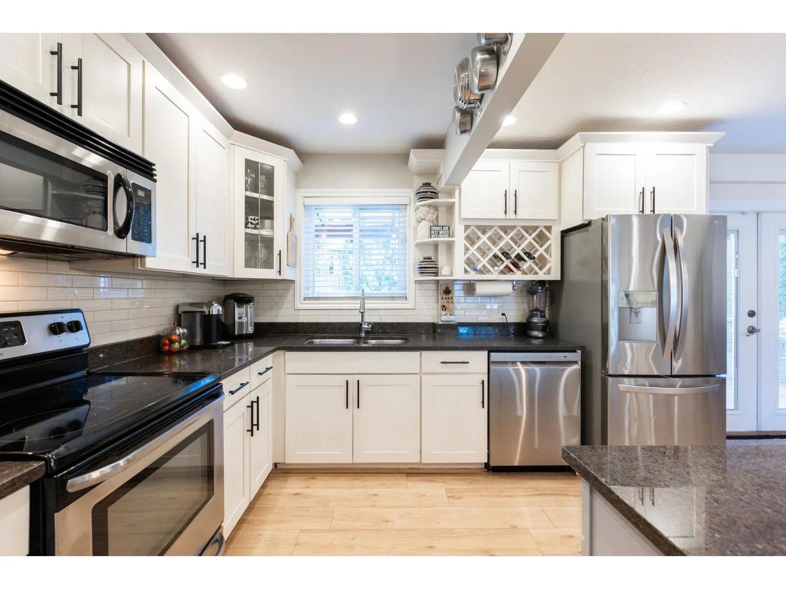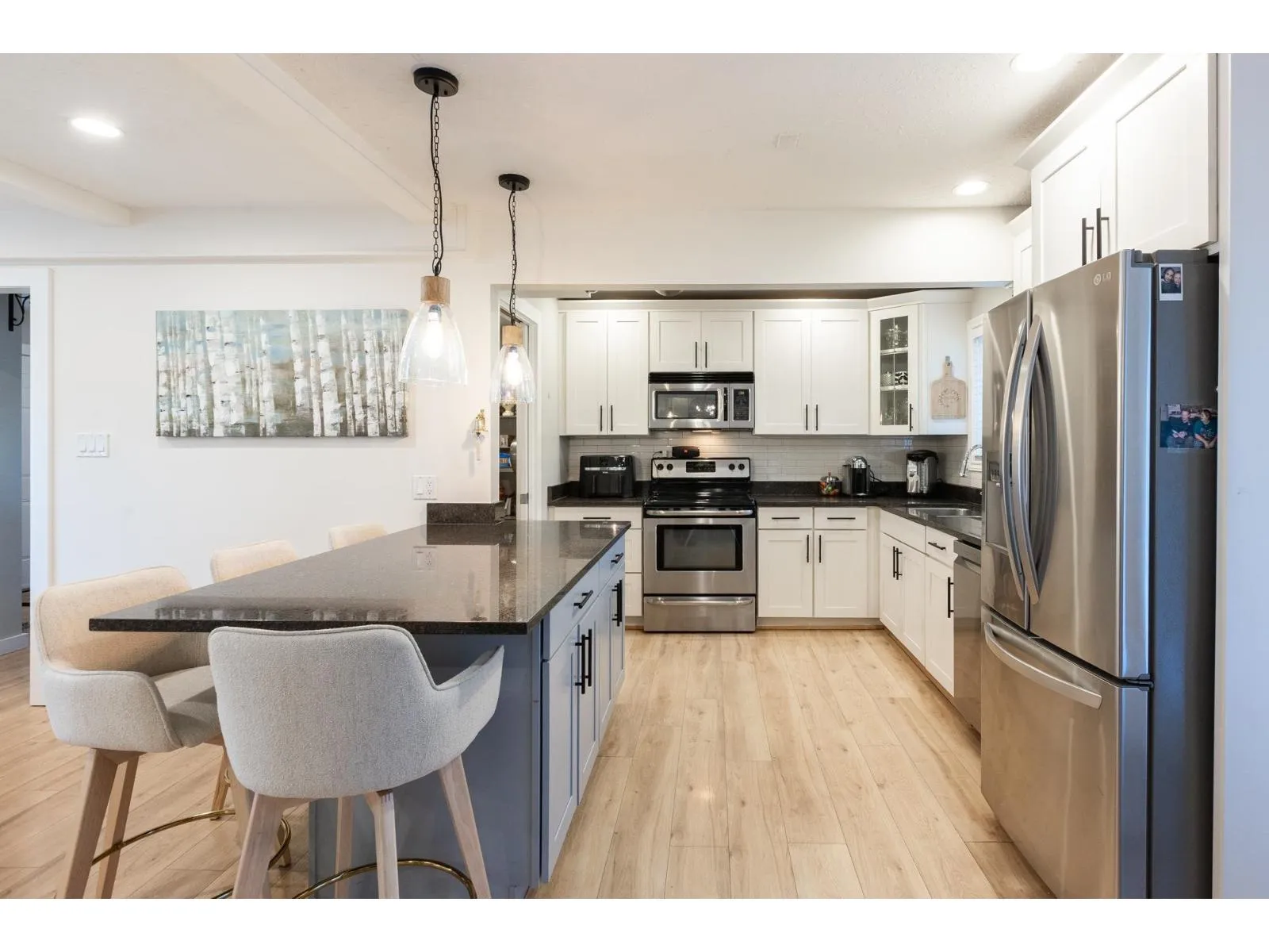 Great floor-plan in this BEAUTIFULLY UPDATED 4 bed + den, 3 bath home with KITCHEN ON MAIN FLOOR! New Hardie siding, HW on demand, updated windows, flooring, moldings, and paint! Slider off the main leads to a newly fenced backyard with large covered patio, gas BBQ hook- up, large shop and still plenty of room for the kids! White shaker cabinets in kitchen w new hardware, quartz countertops, heated flooring, SS appliances & walk-in pantry. The coziest wood fireplace w heated floors in living room w large bay window. Spacious primary up enjoys double windows + skylight, 3 closets & ensuite along with 3 more bedrooms, large family/rec room and 2nd wood fireplace. Updated garage doors, large concrete pad in front of shed + so much more! Steps to Penzer Park! (id:27476)
