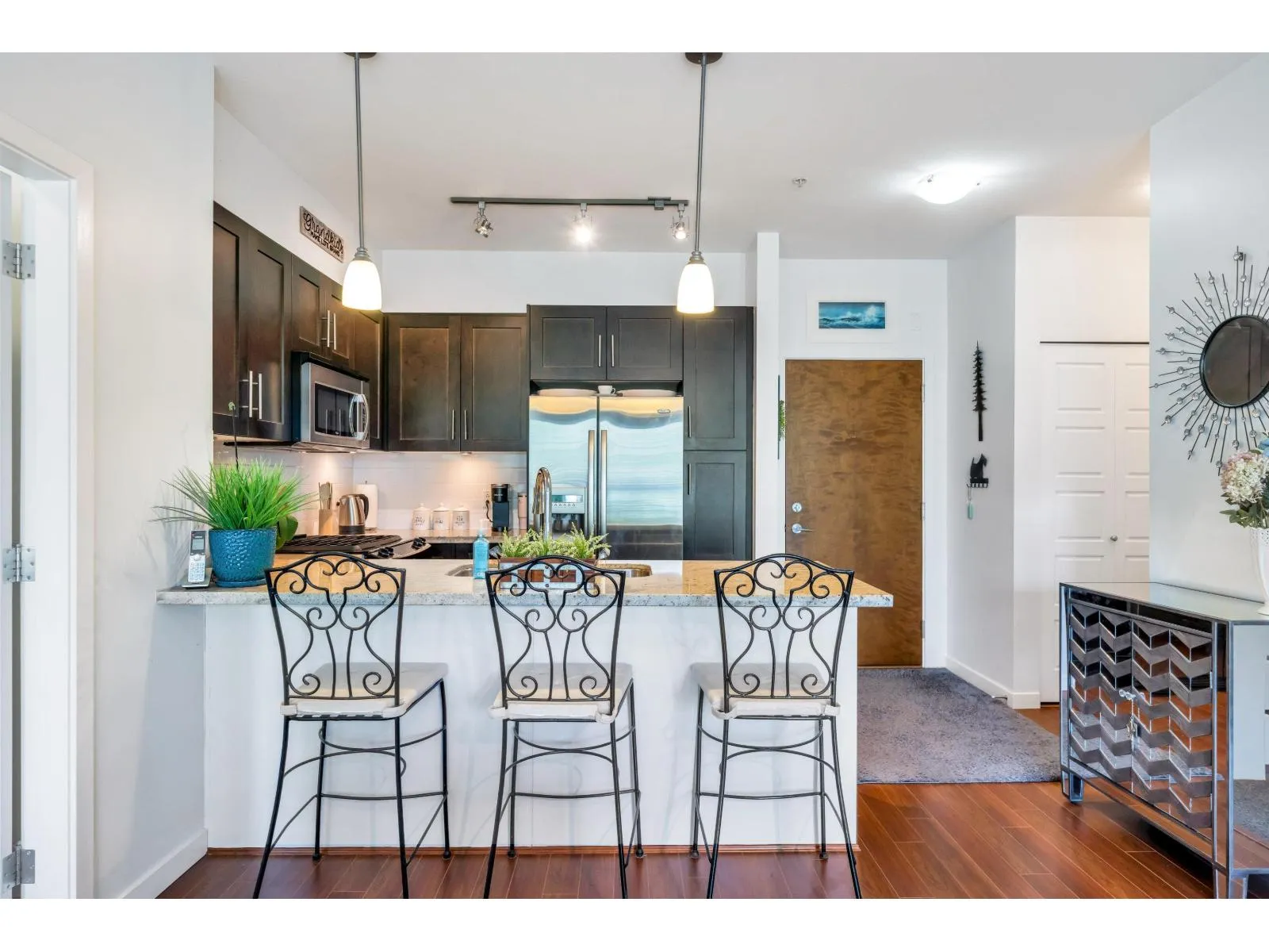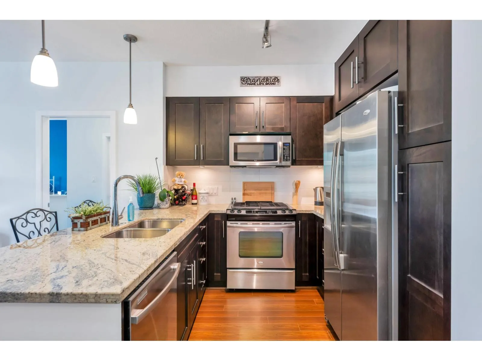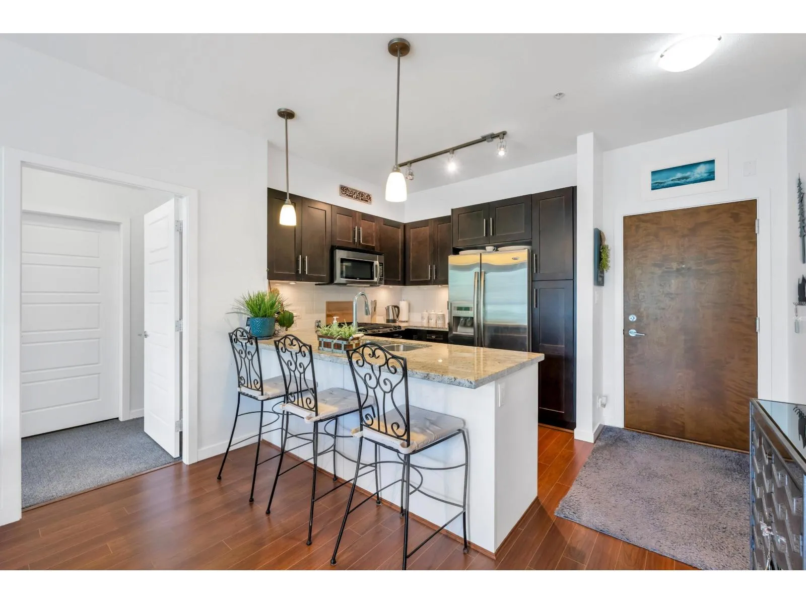 Welcome to Waterfront at Bedford Landing, a sought-after 55+ community in the heart of Fort Langley. Steps to Historic Fort Langley, river trails, cafés, shops, and restaurants. This beautifully maintained home offers nearly 900 sq ft with 2 bedrooms and 2 bathrooms, thoughtfully designed with bedrooms on opposite sides for privacy. The kitchen features granite countertops, stainless steel appliances including a gas stove, and a dining area for entertaining. Updates include fresh paint and newer carpeting. Spacious primary bedroom with walk-in closet and ensuite with heated tile floors. Enjoy a bright south-facing balcony, same-floor storage locker, and 2 underground parking stalls near the elevator. (id:27476)