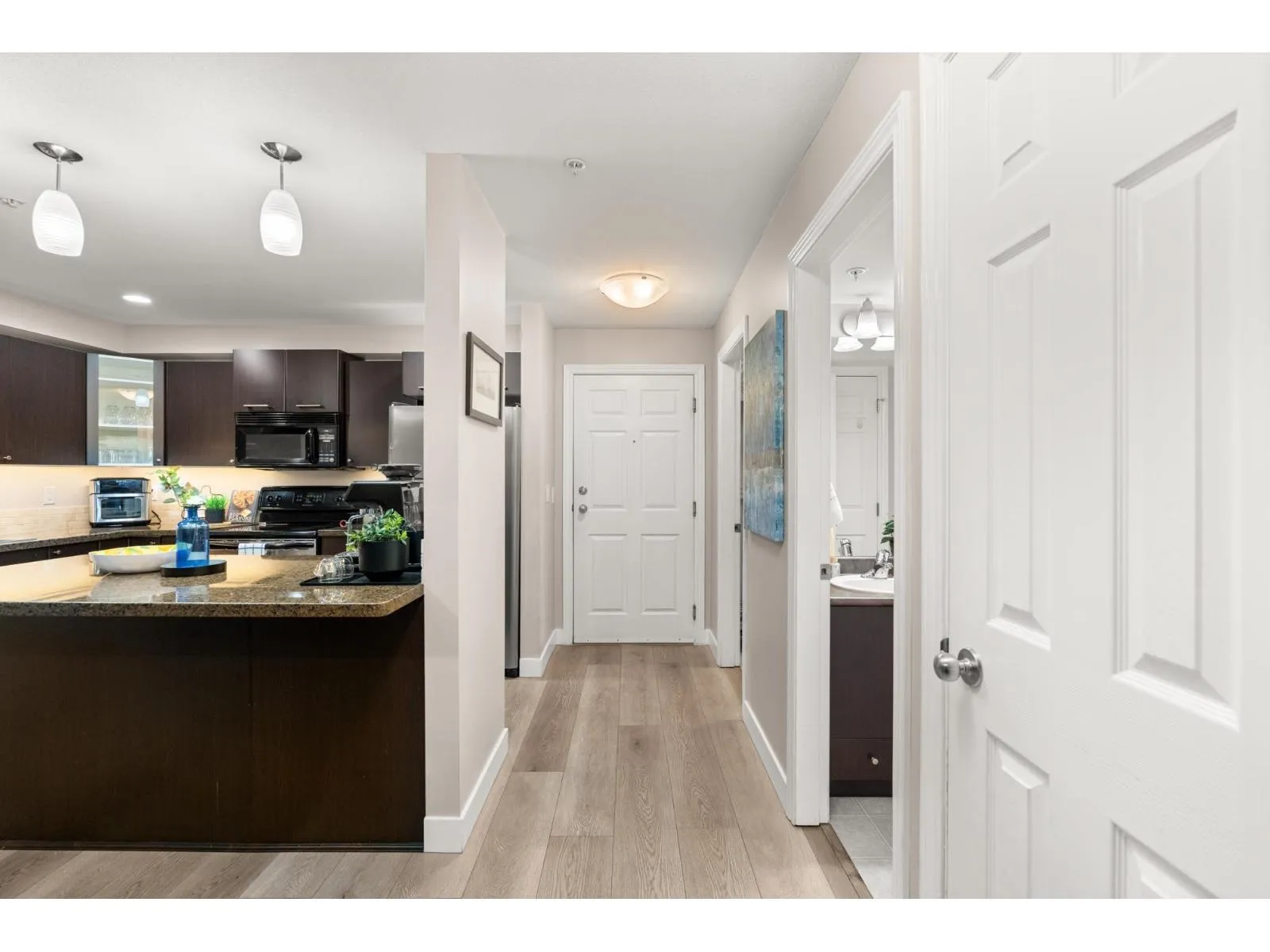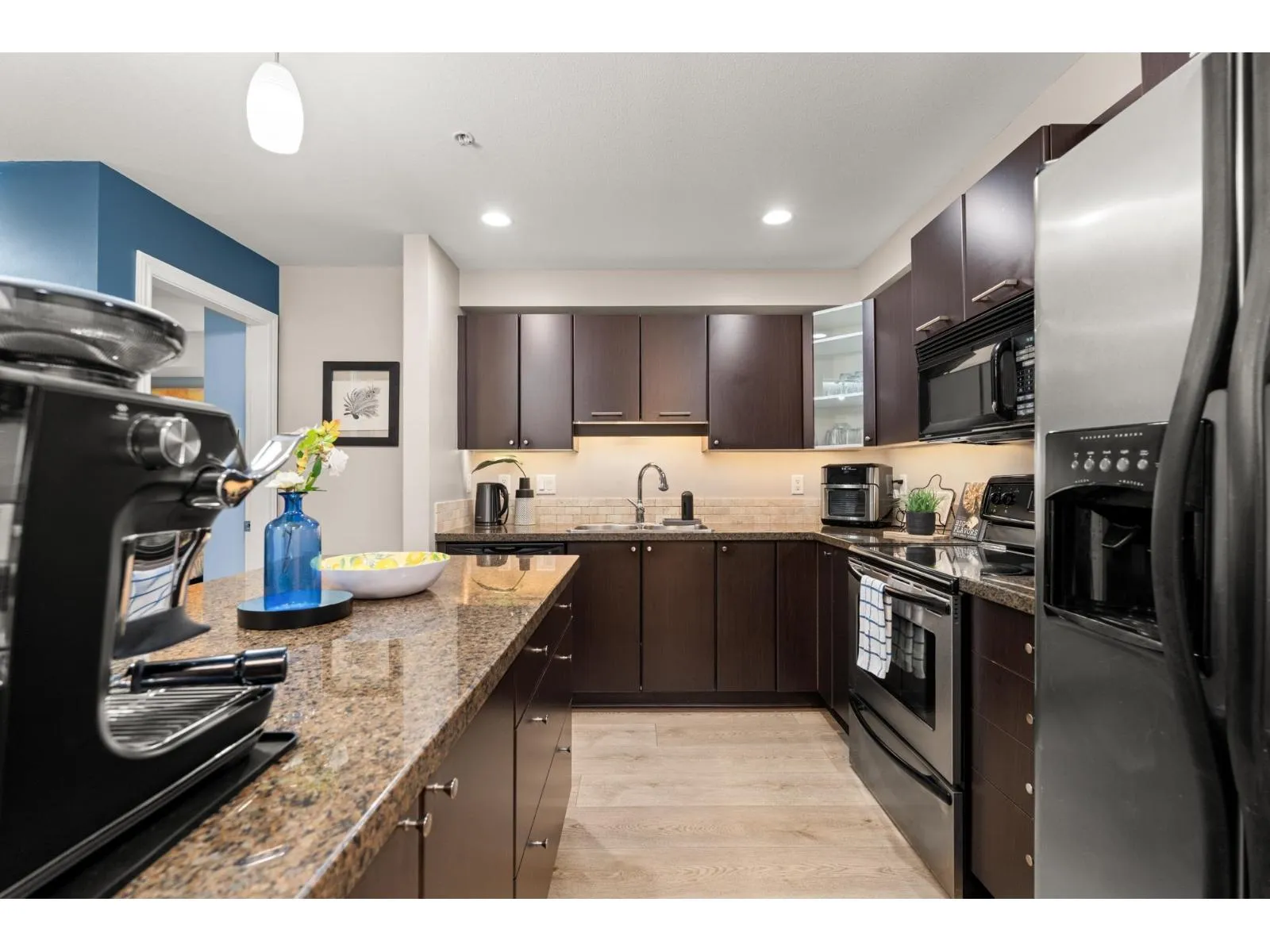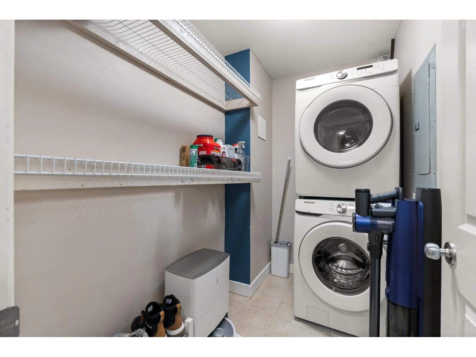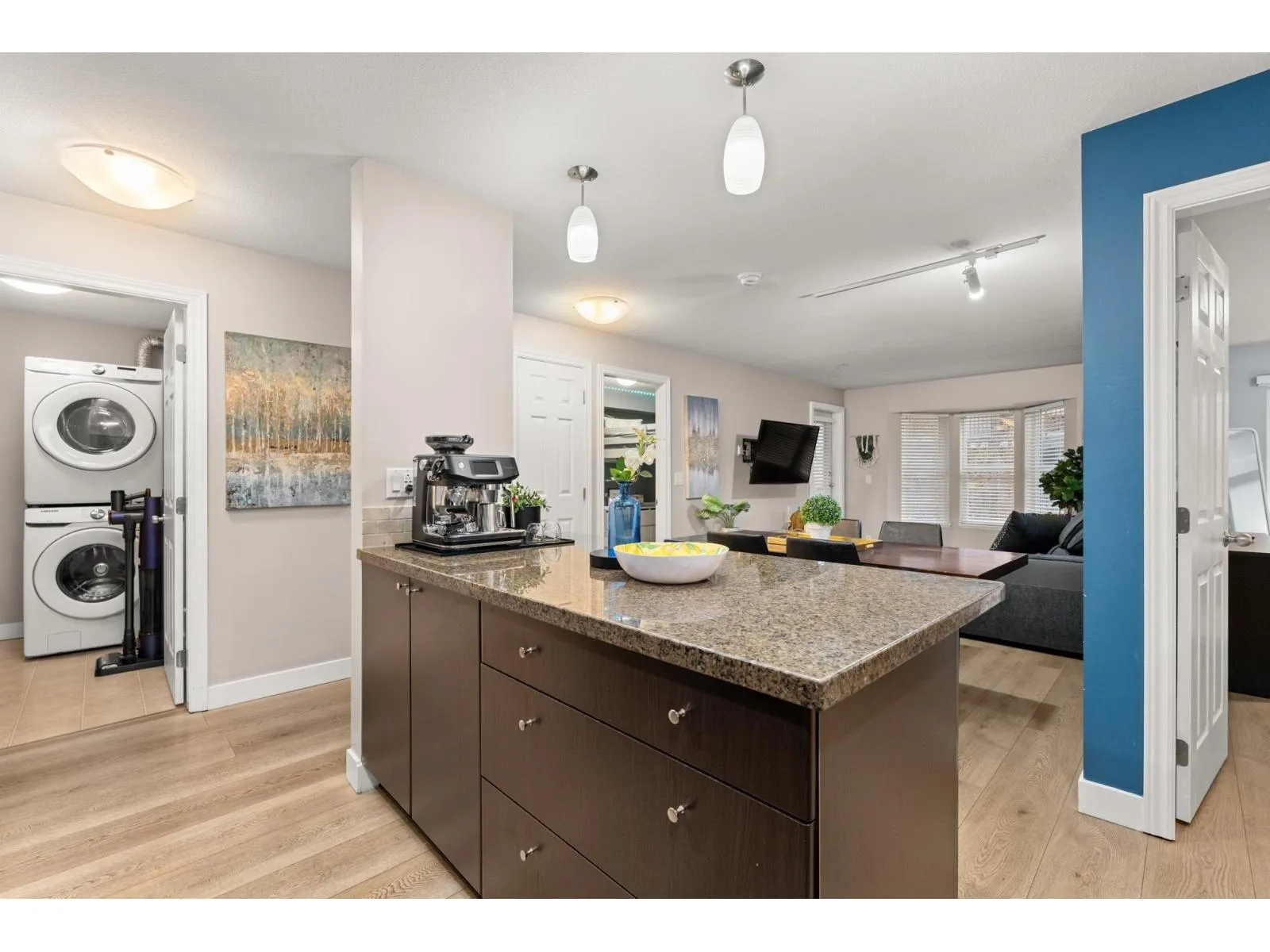 Welcome to Brydon Walk! This spacious 2 bed, 2 bath condo offers nearly 900 sq ft of bright, open-concept living in a quiet, private location on the courtyard side of the building. Enjoy vinyl plank flooring throughout, a functional kitchen with large central island, granite countertops, sit-up bar, and stainless steel appliances-perfect for everyday living and entertaining. The oversized primary bedroom easily fits a king-size bed and features a walk-in closet and ensuite. Rare dedicated laundry room with built-in shelving and upgraded Samsung washer/dryer provides abundant storage. One secured parking stall and lots of visitor parking. Professionally managed building with a new roof. Steps to Brydon Park, lagoon, trails, shopping, and the future SkyTrain. Book your private tour today! (id:27476)
