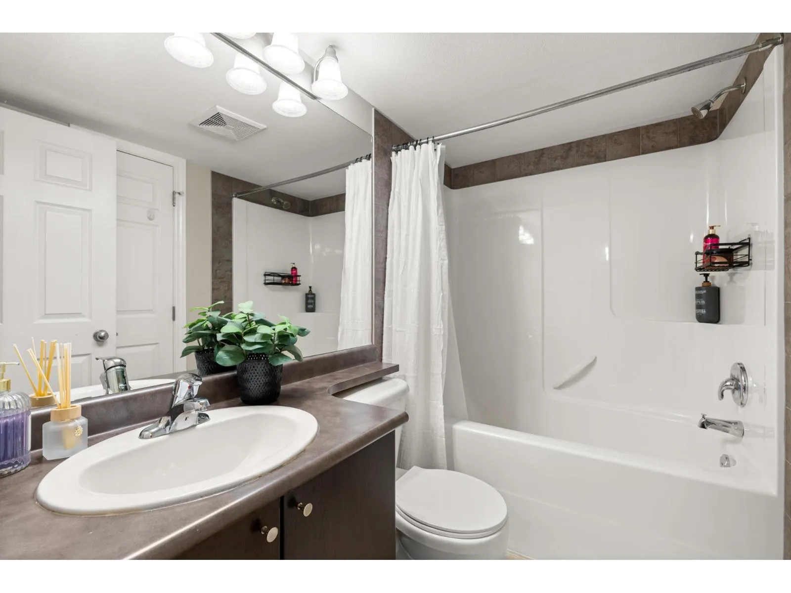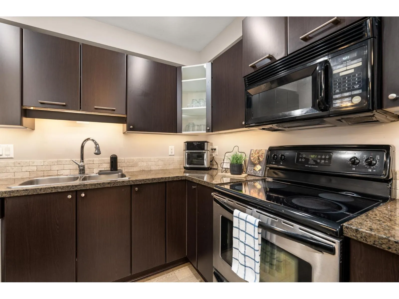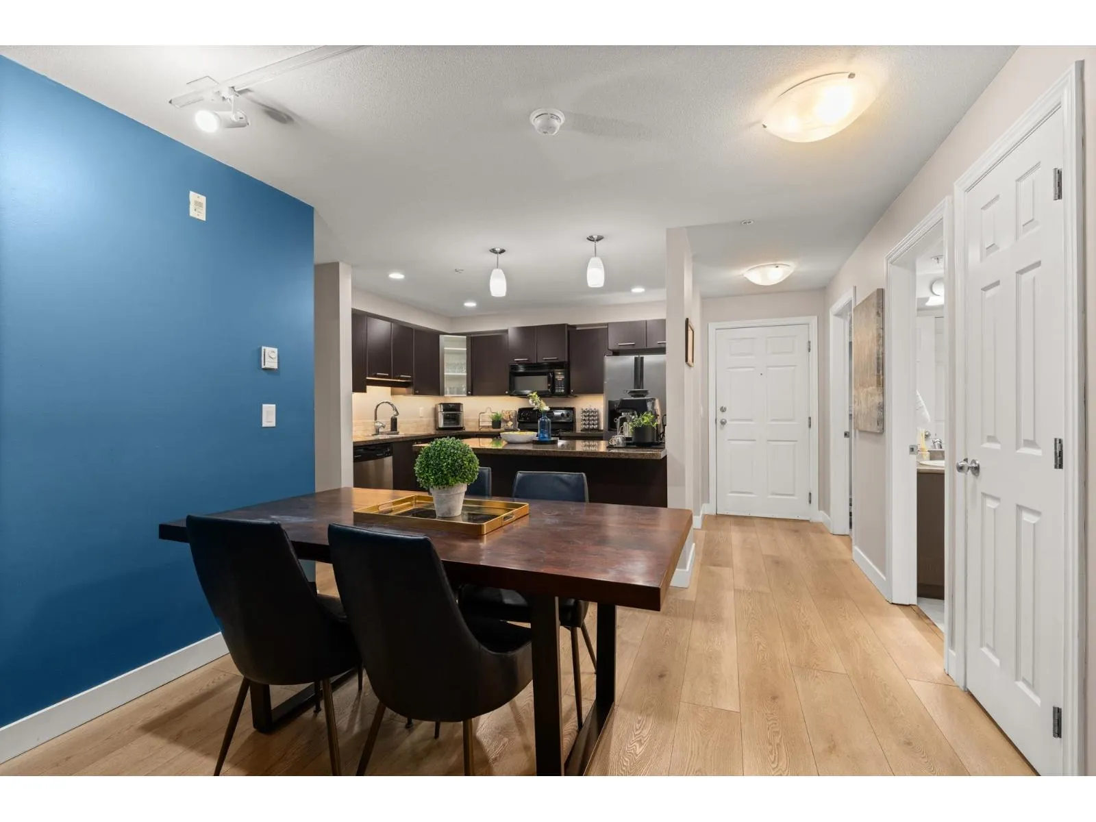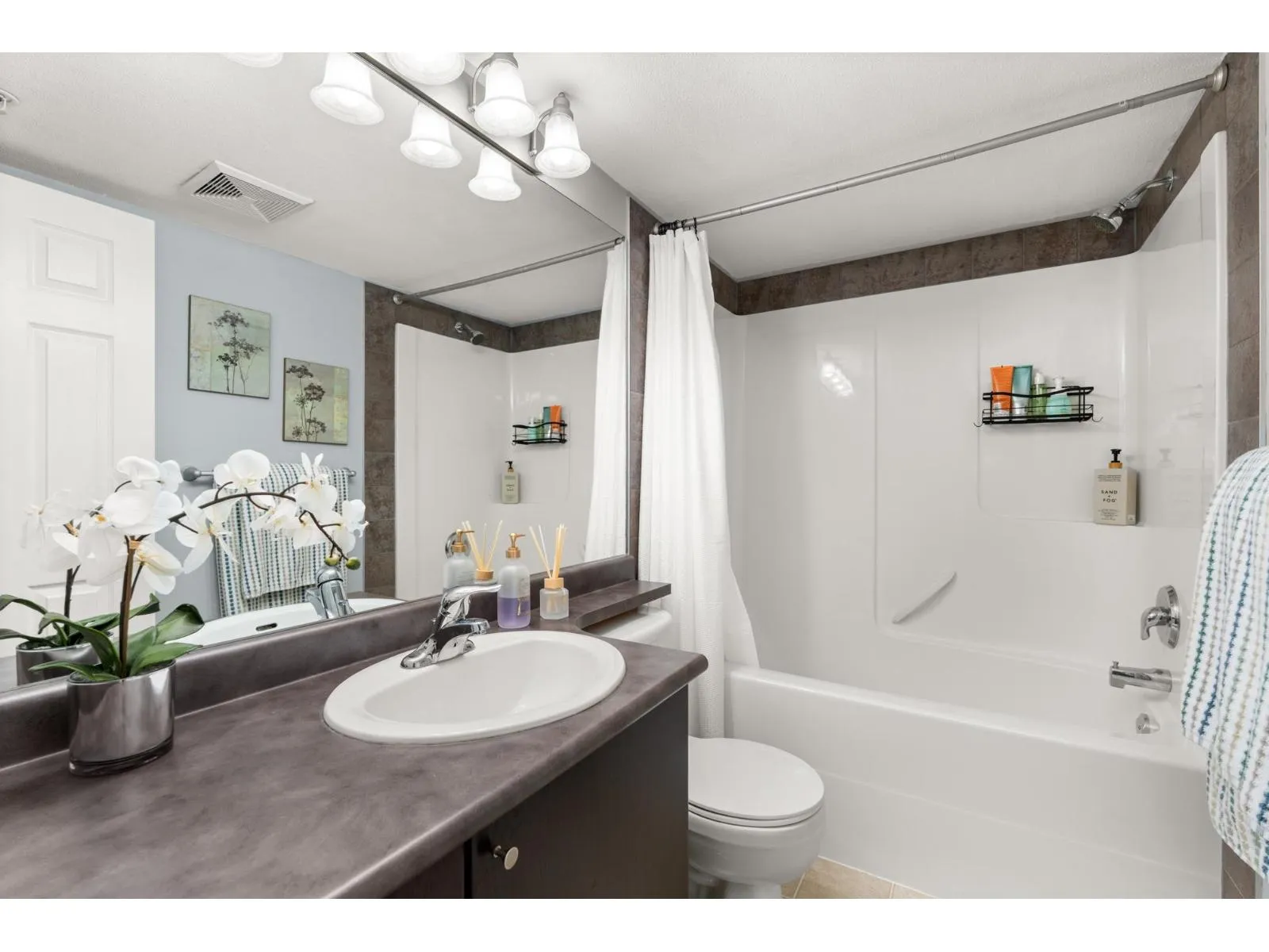 Welcome to Brydon Walk! This spacious 2 bed, 2 bath condo offers nearly 900 sq ft of bright, open-concept living in a quiet, private location on the courtyard side of the building. Enjoy vinyl plank flooring throughout, a functional kitchen with large central island, granite countertops, sit-up bar, and stainless steel appliances-perfect for everyday living and entertaining. The oversized primary bedroom easily fits a king-size bed and features a walk-in closet and ensuite. Rare dedicated laundry room with built-in shelving and upgraded Samsung washer/dryer provides abundant storage. One secured parking stall and lots of visitor parking. Professionally managed building with a new roof. Steps to Brydon Park, lagoon, trails, shopping, and the future SkyTrain. Book your private tour today! (id:27476)