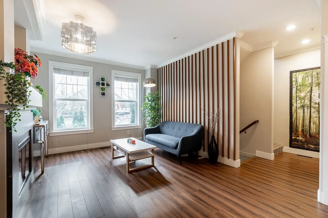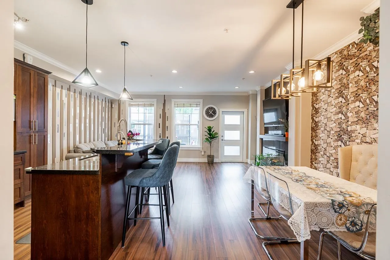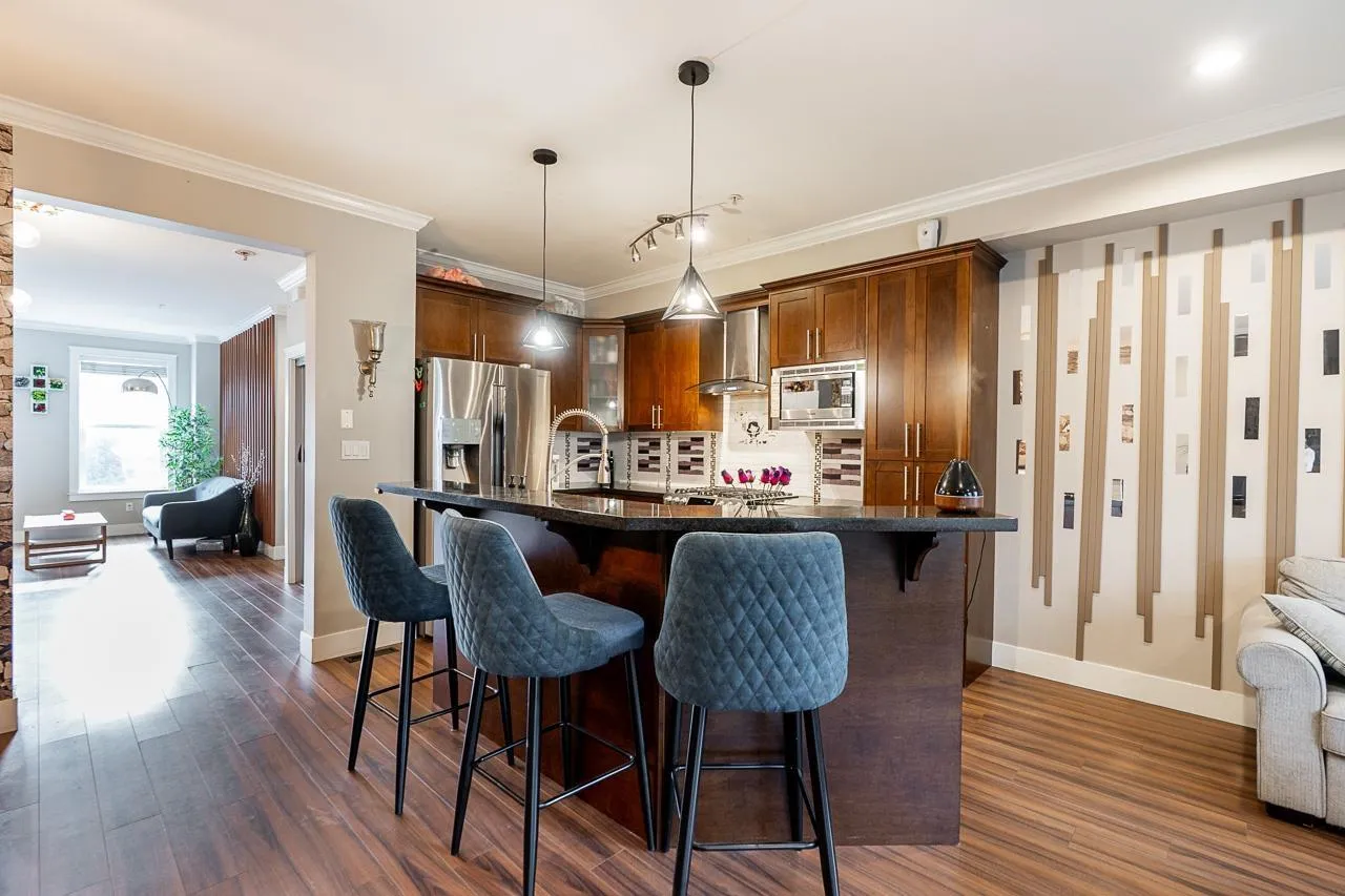 Welcome to Yorkson South-ROW HOME-NO STRATA FEES. This spacious home offers living/dining room a bright main floor, two gas fireplaces, a gourmet kitchen with SS appliances, gas stove, eating bar, powder room, & a covered balcony perfect for BBQs. Details include crown moulding, elegant flooring, granite countertops throughout, designer lighting, and large windows. Upstairs offers side-by-side laundry, two generously sized bedrooms with a full bathroom, & a stunning primary suite with a walk-in closet & spa-like ensuite featuring double sinks & dual shower heads. The basement includes a large REC room with a 3-piece bathroom. Complete with a side-by-side double garage, two additional parking spaces, a fenced yard. Walking distance to schools, shops, parks. (id:27476)