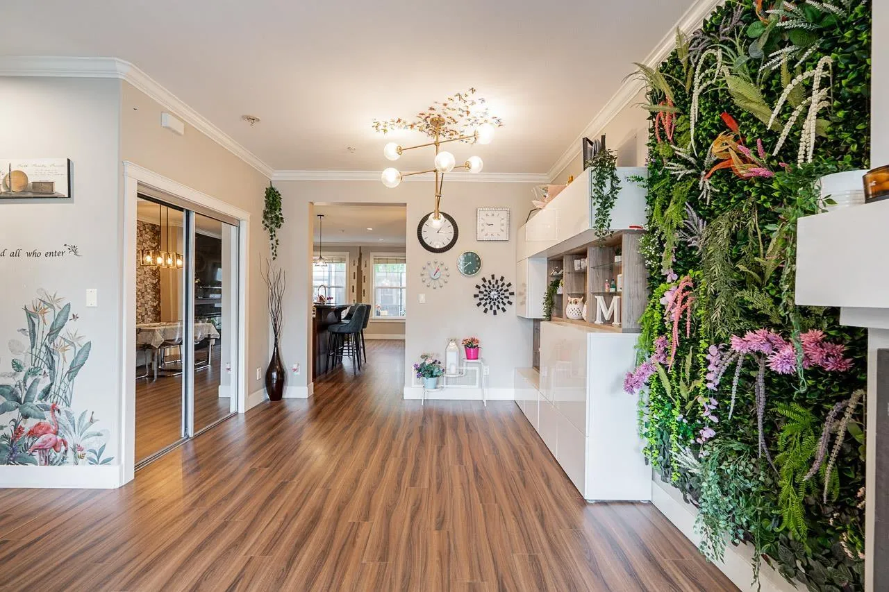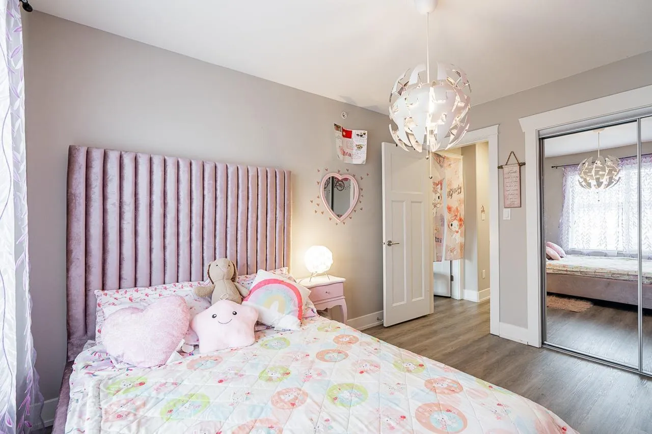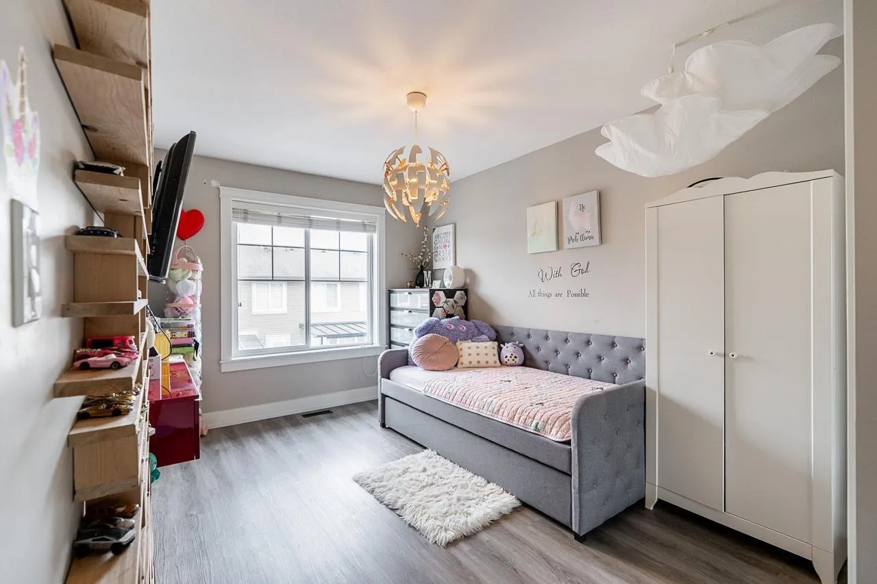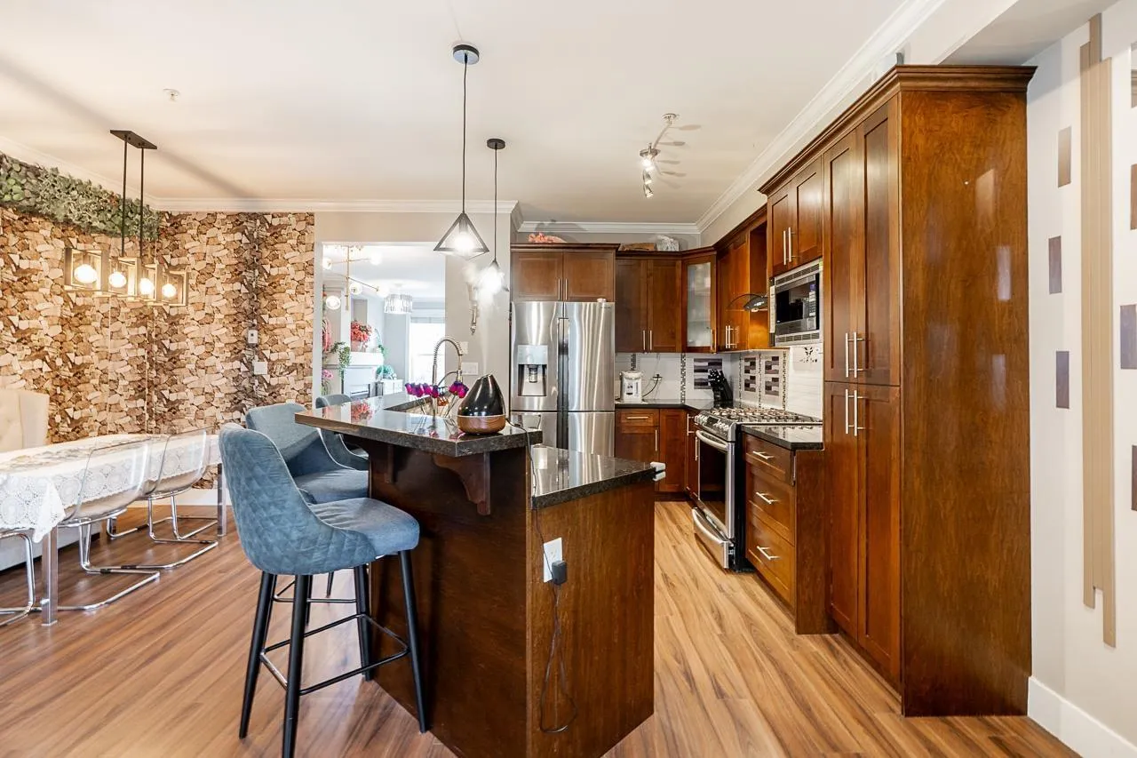 Welcome to Yorkson South-ROW HOME-NO STRATA FEES. This spacious home offers living/dining room a bright main floor, two gas fireplaces, a gourmet kitchen with SS appliances, gas stove, eating bar, powder room, & a covered balcony perfect for BBQs. Details include crown moulding, elegant flooring, granite countertops throughout, designer lighting, and large windows. Upstairs offers side-by-side laundry, two generously sized bedrooms with a full bathroom, & a stunning primary suite with a walk-in closet & spa-like ensuite featuring double sinks & dual shower heads. The basement includes a large REC room with a 3-piece bathroom. Complete with a side-by-side double garage, two additional parking spaces, a fenced yard. Walking distance to schools, shops, parks. (id:27476)