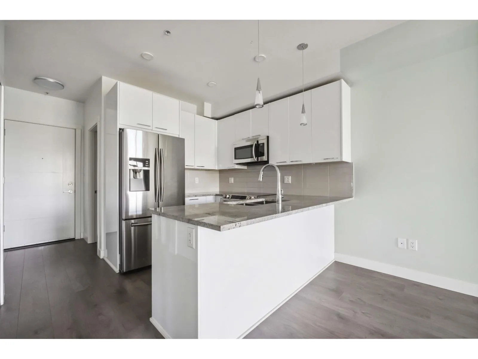 This bright 2-bed, 2-bath home offers modern finishes, open-concept living, and oversized windows that fill the space with natural light. Enjoy a private balcony with mountain views, a sleek kitchen with quartz countertops, and in-suite laundry for convenience. Located steps from shopping, dining, schools, and the future SkyTrain station, this unit offers unbeatable accessibility. With secure parking, pet-friendly policies, and a vibrant neighborhood, it's the perfect blend of comfort, style, and investment potential. (id:27476)