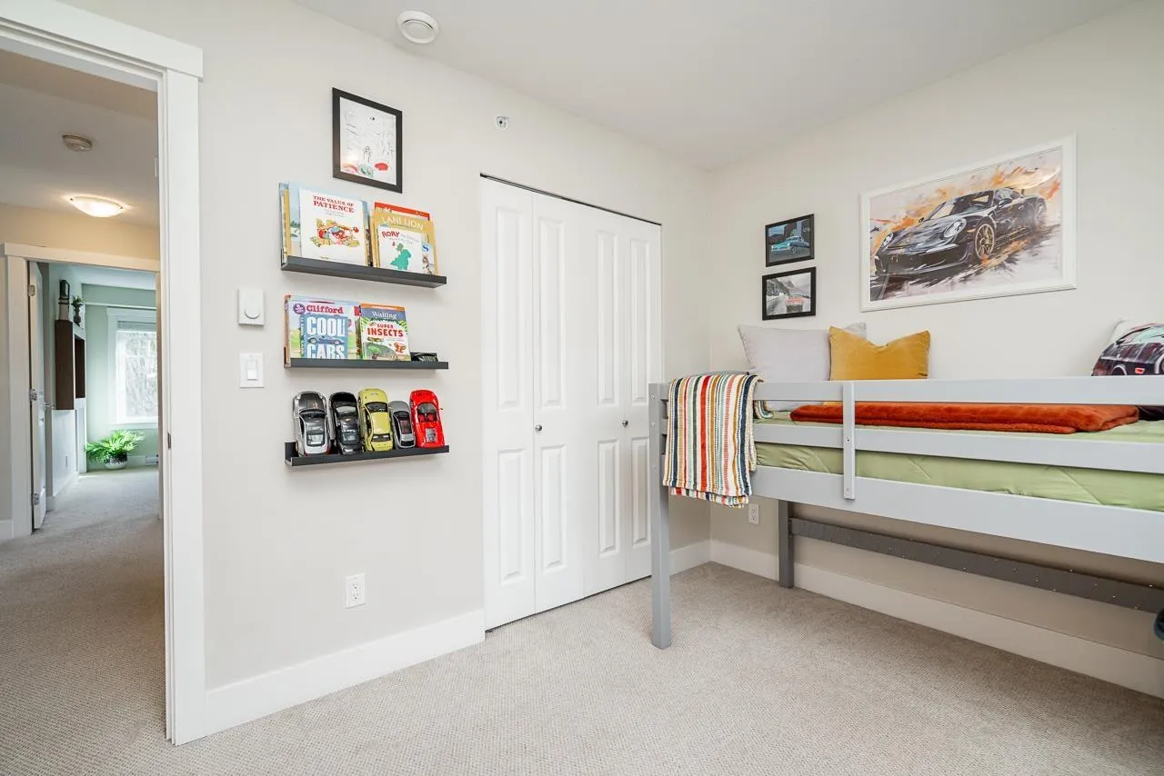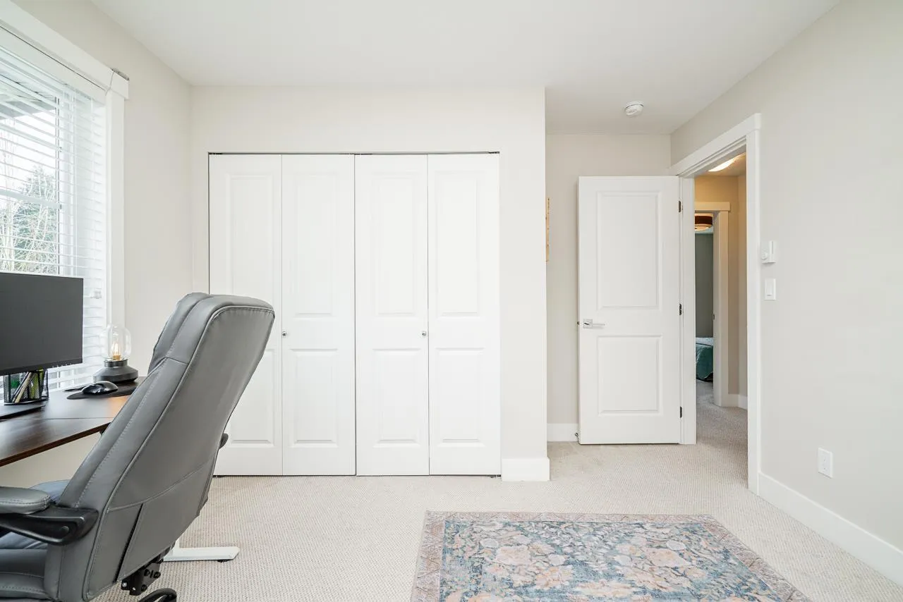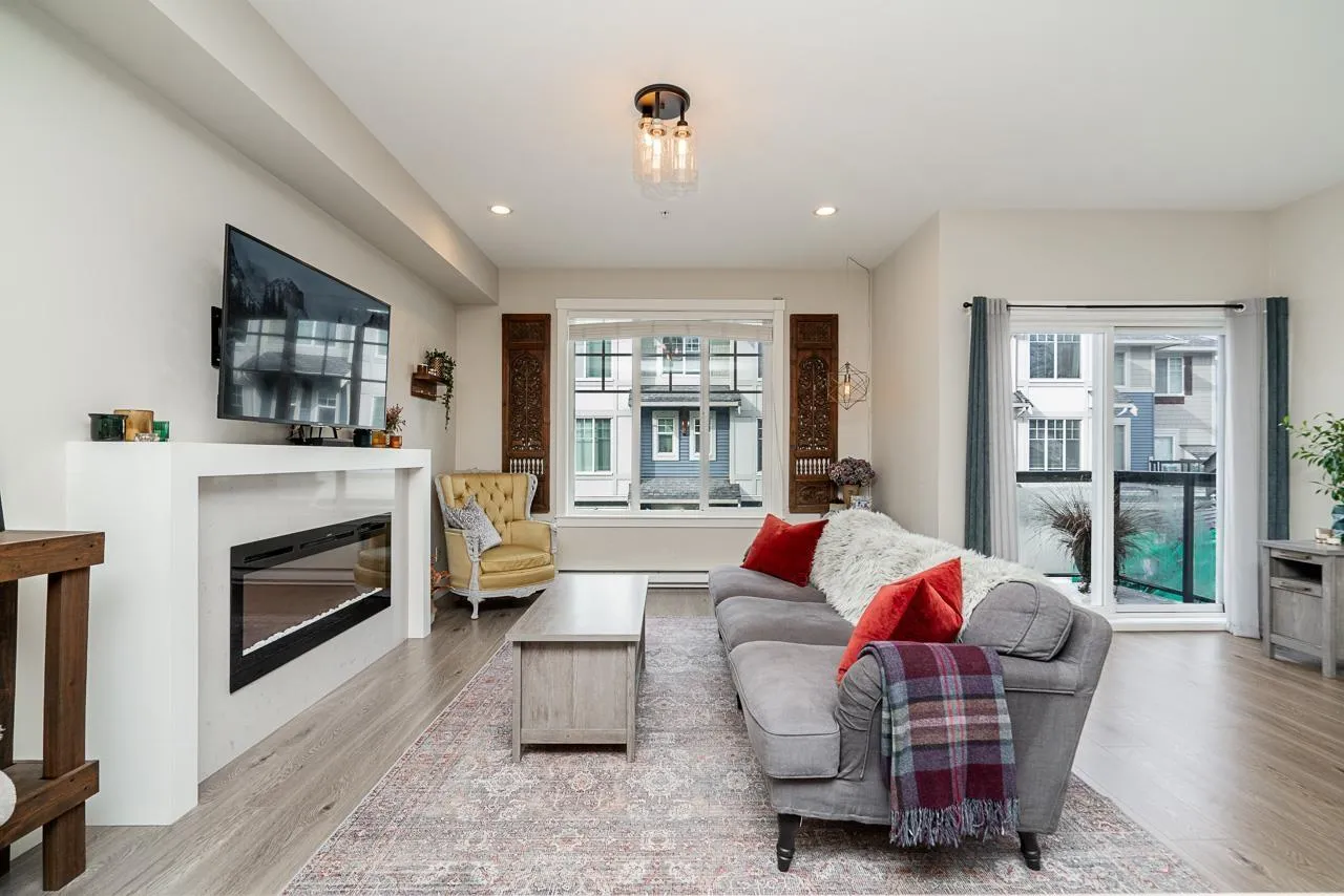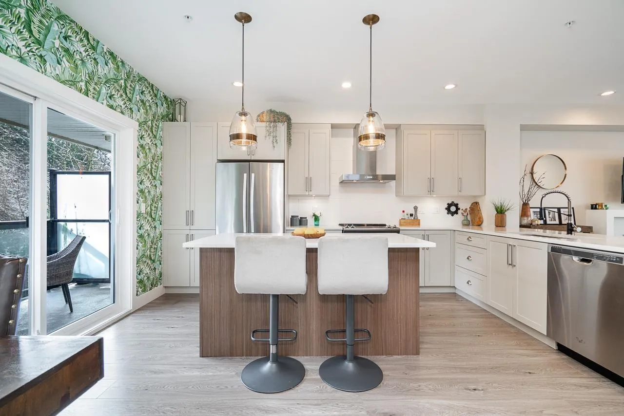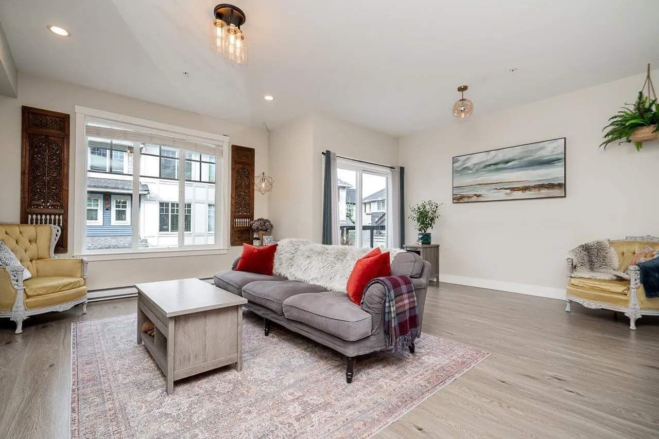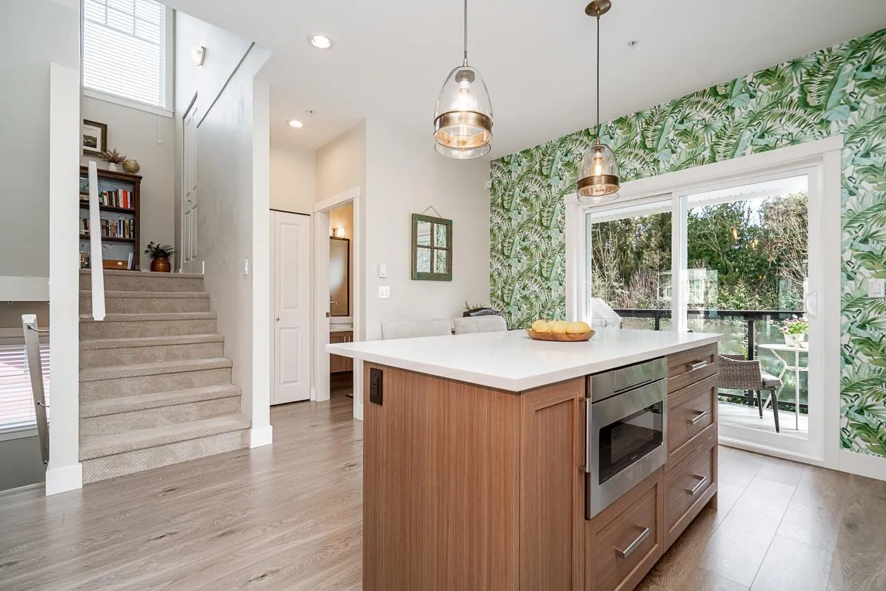 Beautifully maintained end unit, 4 bed, 4 bath townhome with 4 car parking in the sought-after Gabriola Park community. Backing onto a private GREEN BELT with no neighbors on two sides, this home offers rare privacy and peaceful views. The bright open-concept main floor features 9' ceilings, a spacious living and dining area, and a modern kitchen with oversized quartz island, shaker cabinetry, and stainless steel appliances. Enjoy morning sun on the east-facing balcony off the kitchen, plus a fully fenced yard and patio perfect for kids or pets. Upstairs offers three generous bedrooms including a primary suite with walk-in closet and double vanity ensuite. Family and pet-friendly complex with playground, clubhouse, and trails, all close to schools, parks, shopping and local amenities. (id:27476)