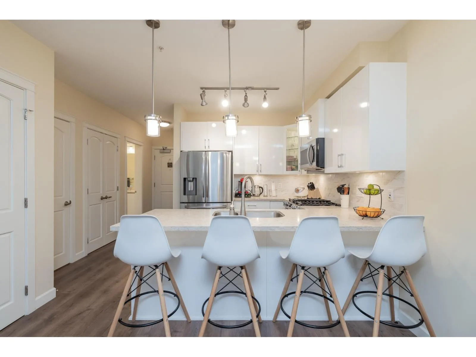 Welcome to Yorkson Park! This 2 bed + flex home offers modern style and smart function in a quality-built, only 4-year-old building. The gourmet kitchen features quartz counters, stainless appliances, and a gas range. Enjoy year-round comfort with A/C, an electric fireplace, and heated bathroom floors. The flex space is ideal for a home office or extra storage. An enclosed solarium expands your living area and overlooks the quiet courtyard. Bonus: 2 parking stalls + secure storage. Steps to shops, restaurants, Carvolth Exchange, and quick Hwy 1 access. (id:27476)