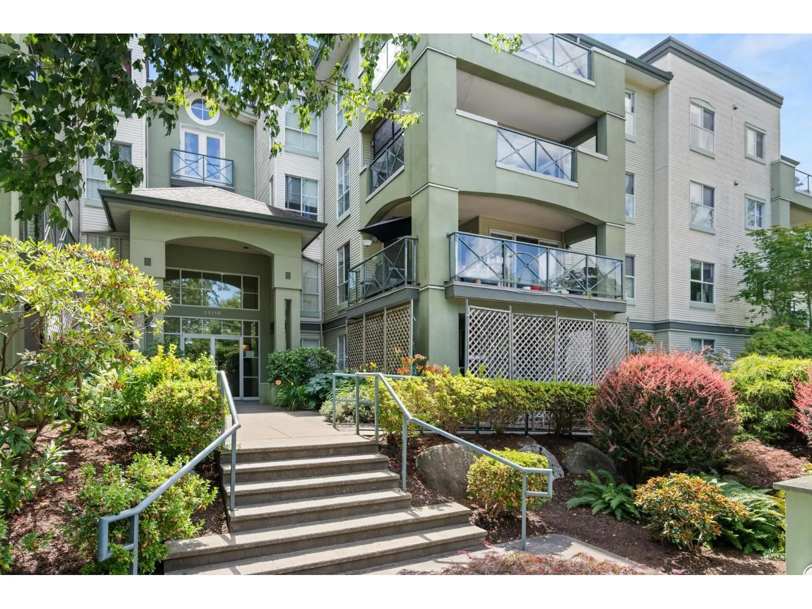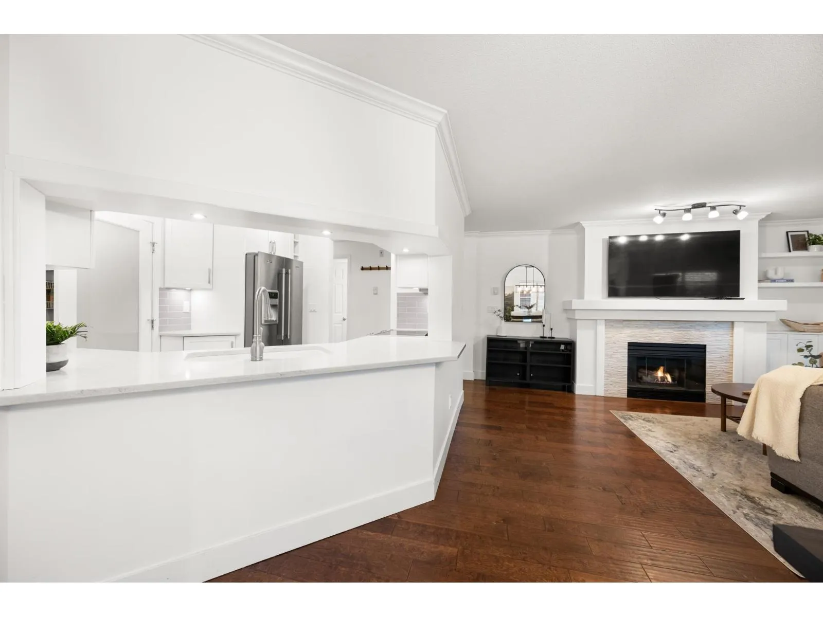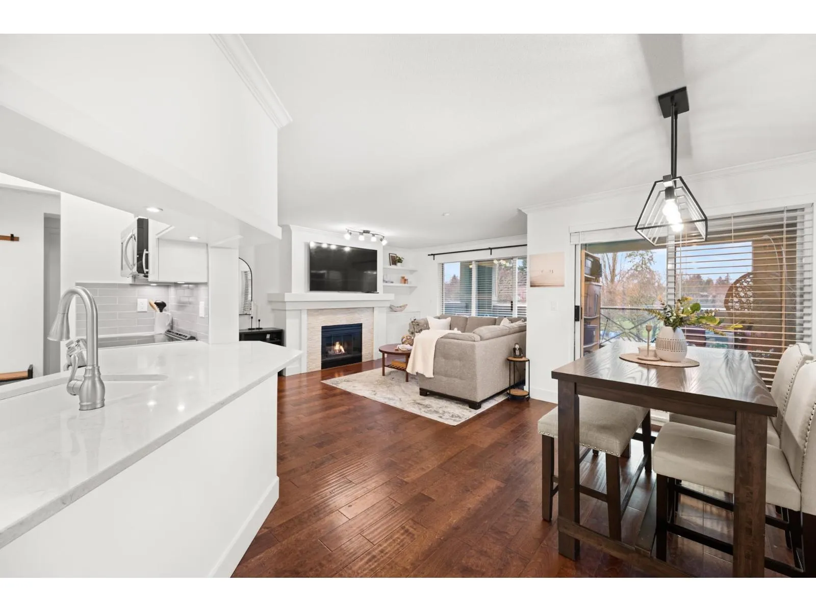 Welcome to Regency Terrace in the heart of Langley City! This bright & spacious 2-bedroom, 2-bathroom home features a functional layout w a cozy gas fireplace, updated flooring, paint, & an open white kitchen. Oversized primary bedroom offers generous closet space & a spacious ensuite, while the second bedroom is thoughtfully located on the opposite side for added privacy. Enjoy a large covered patio with beautiful park views, perfect for relaxing or entertaining. The building offers great amenities including a lounge and fitness room. Includes 1 parking stall, with hot water & gas covered in strata fees. No dog breed restrictions. Located directly across from Linwood Park with a new playground and off-leash dog park- (id:27476)