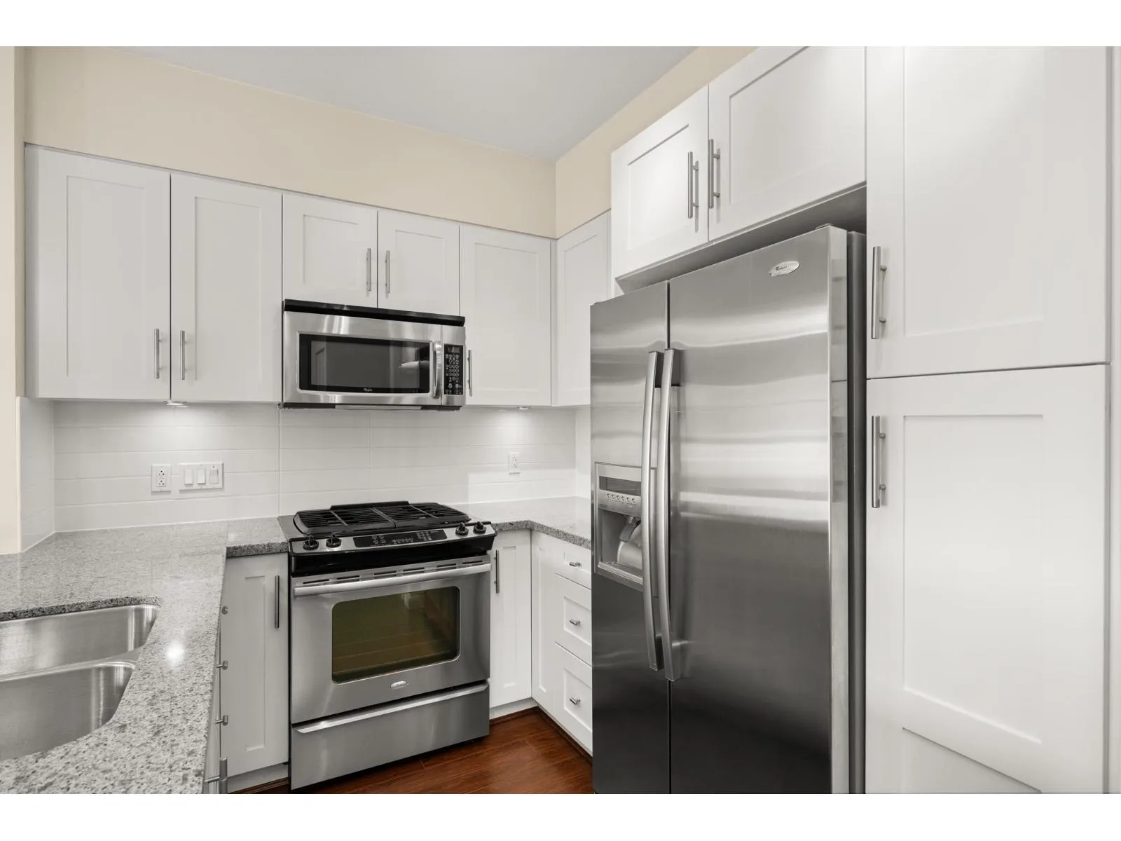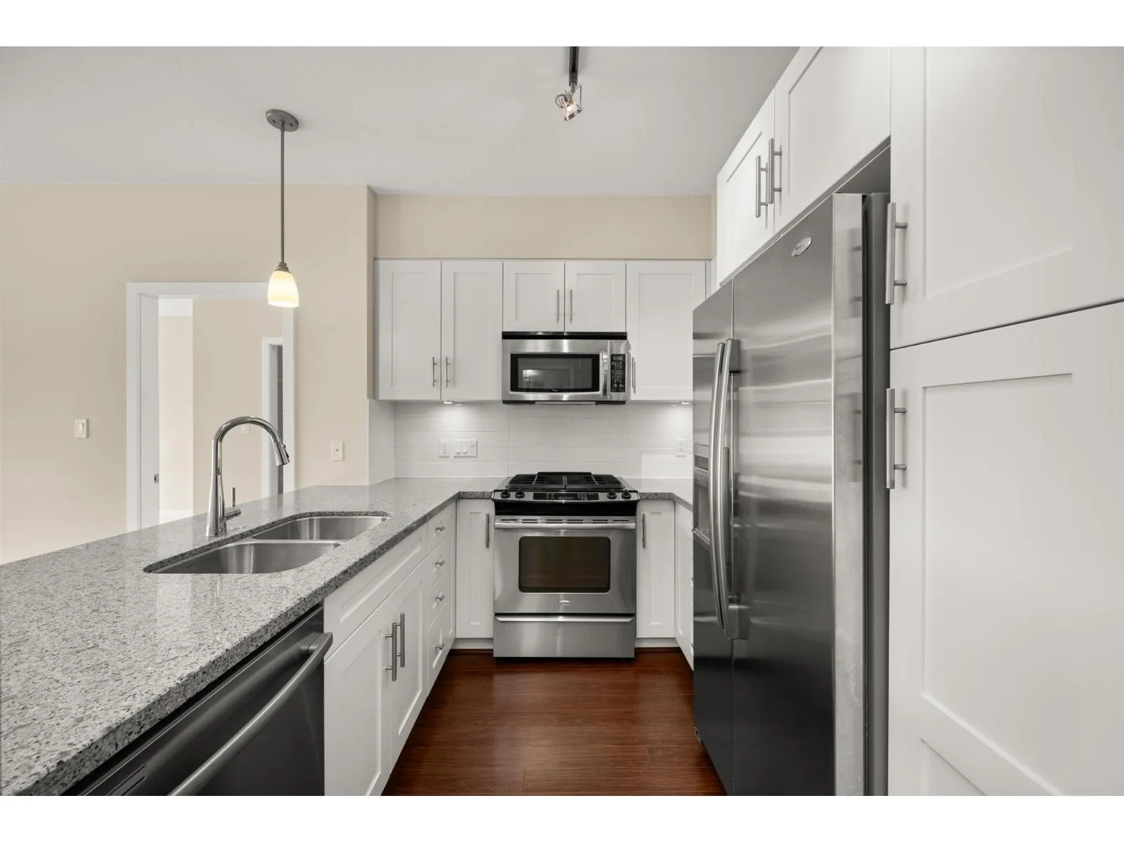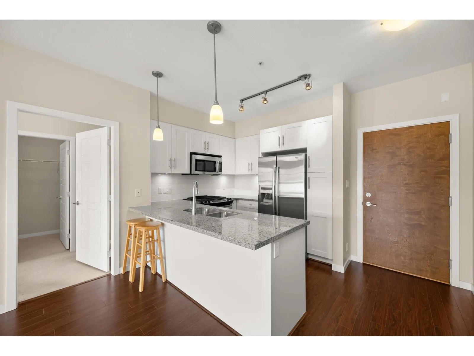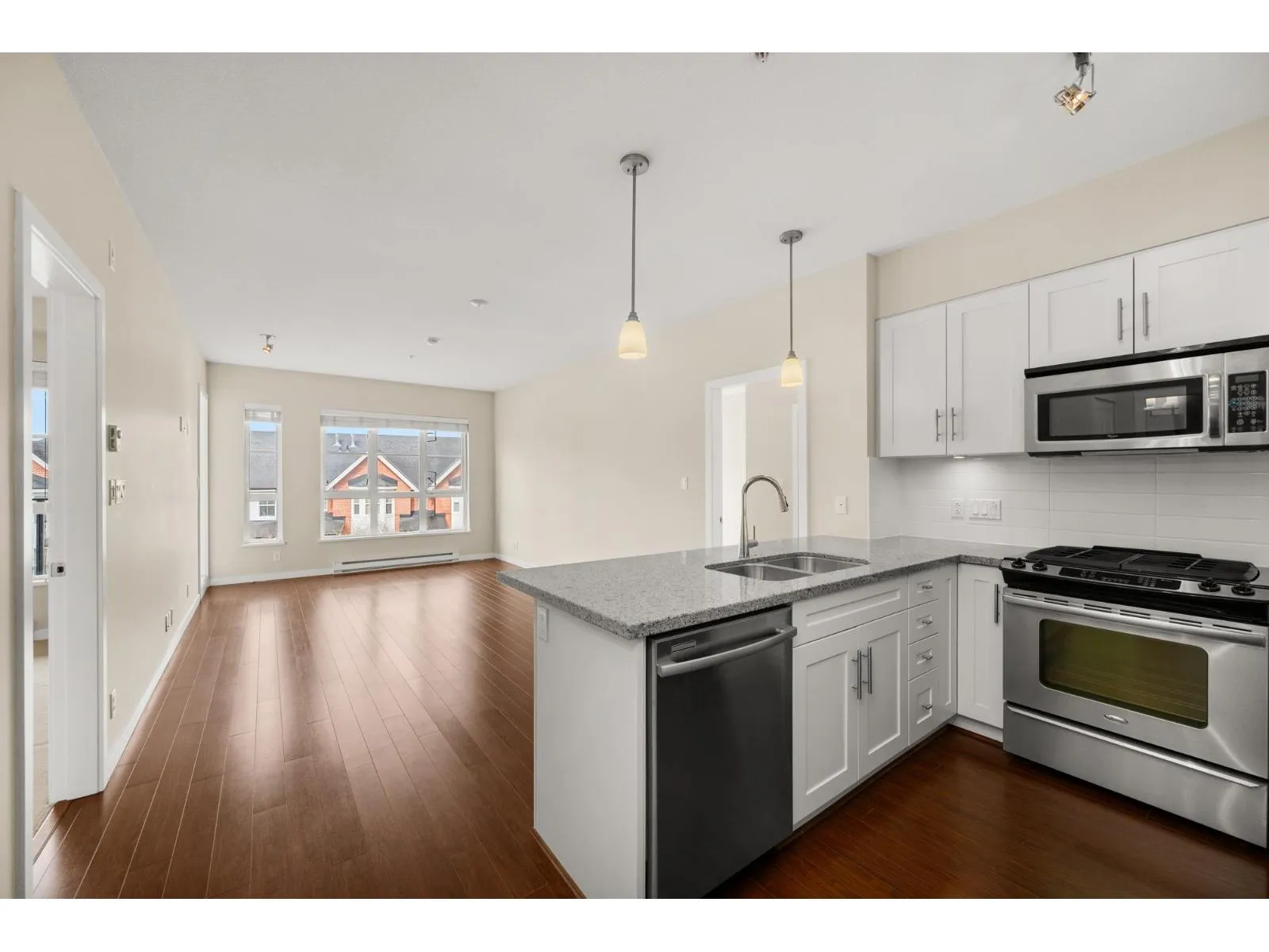 Award winning Bedford Landing. Only 2 bdrm unit available in the 55+ building offering a rare, west exposure! Original owner and in new near condition. Stainless steel appliance package. Kitchen area overlooks living and dining areas, with ample cupboard space and granite counters with an eating bar. Secured underground parking with two spaces and a convenient storage locker across the hall. Common area offers fitness area and meeting room. Location is ideal, walking distance to all that Fort Langley has to offer. (id:27476)