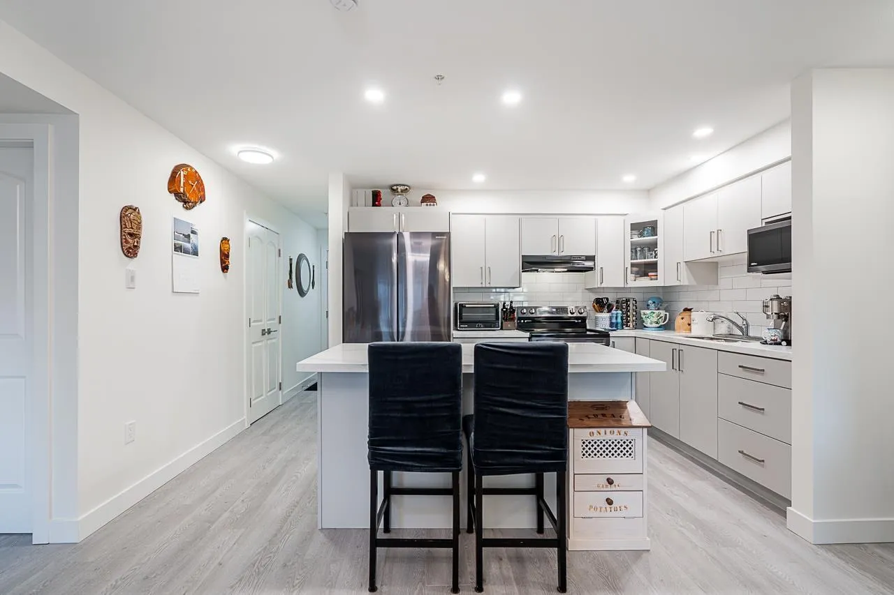 This beautifully renovated two-bedroom suite with a versatile den or home office offers over 1,000 sqft of elegant, comfortable living. The sleek modern kitchen features an oversized island and upgraded stainless steel appliances, new laminate flooring throughout, two spa-like bathrooms and a full walk-in laundry room with pantry space add everyday luxury. Quietly located on the west side of the building. Two side-by-side parking stalls, a storage locker, bike storage. Steps away from shops, restaurants and transit for added convenience. OPEN HOUSE Saturday March 28, 2:00-4:00pm (id:27476)