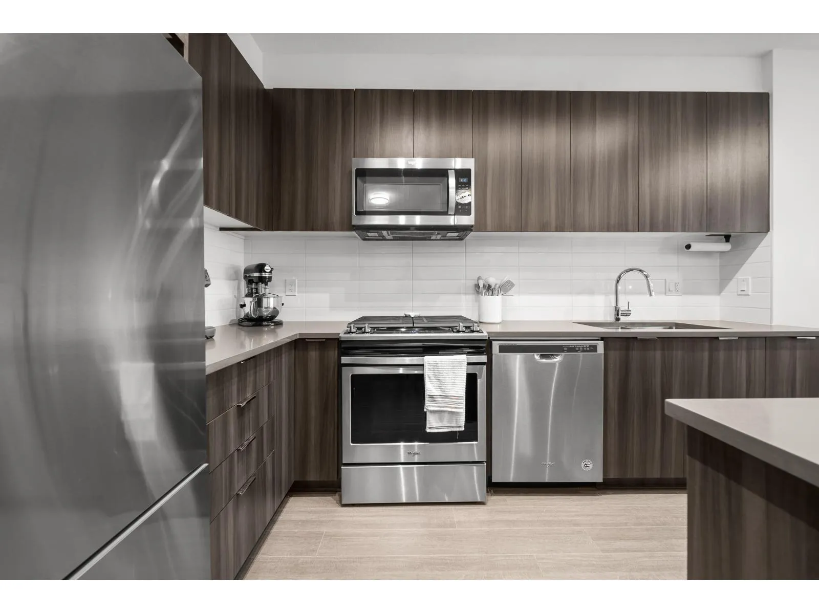 Welcome to Union Park by Polygon-one of Willoughby's most sought-after communities. Enjoy exclusive access to an 85,000 sq.ft. private park and the impressive 12,000 sq.ft. Union Club, offering resort-style amenities just steps from your door. This home captures sweeping garden and mountain views from both the living area and bedrooms, with an open-concept layout and oversized windows that flood the space with natural light. The gourmet kitchen features stainless steel appliances, sleek flat-panel cabinetry, and soft-close details. Laminate flooring flows through the main areas, while plush carpet adds comfort to the bedrooms. Spa-inspired bathrooms complete the package. Comes with 2 PARKING STALLS. Ideally located close to everything your family needs. (id:27476)
