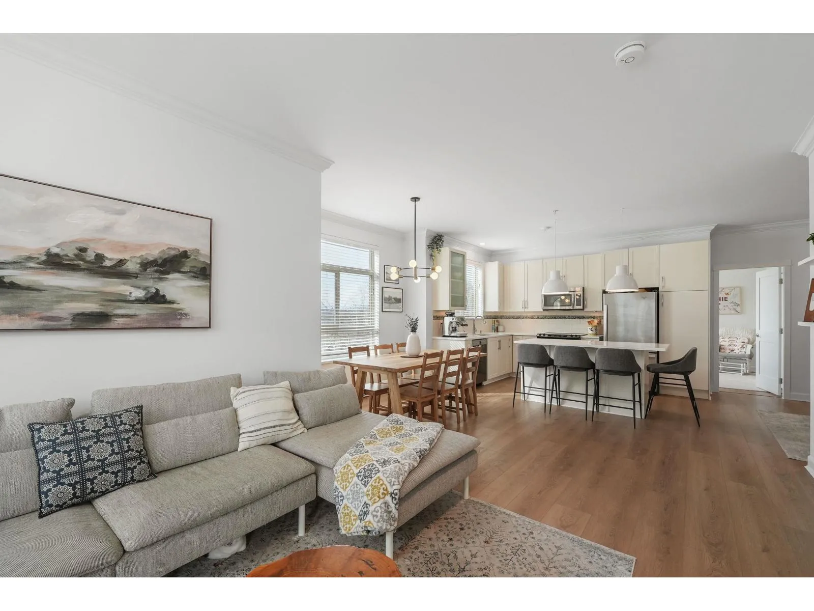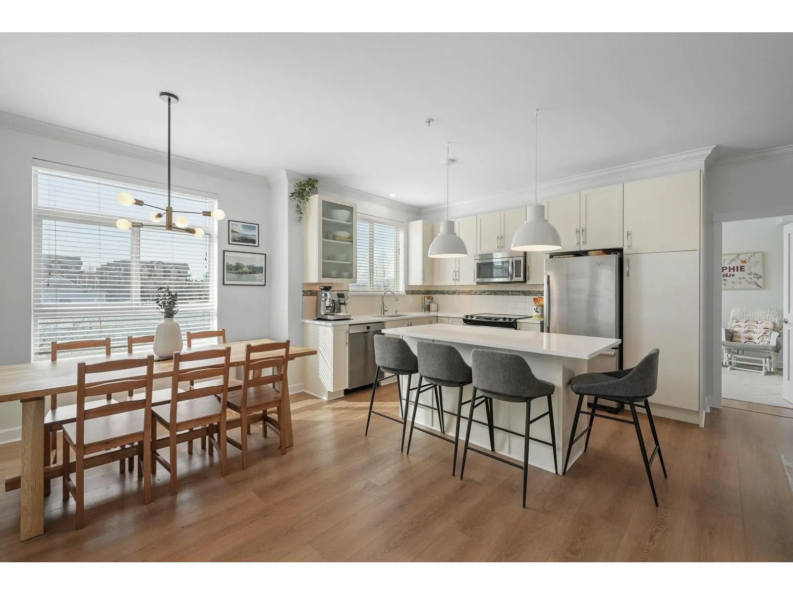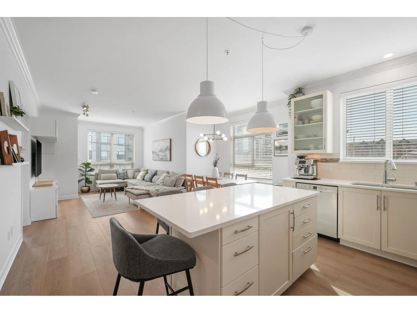 Welcome to Athenry Gate in the heart of Willoughby Heights! Gorgeous 1,094 sq. ft. 2 bed, 2 bath corner unit with a bright, functional layout. Tastefully updated with wide plank vinyl flooring, quartz countertops, new lighting, and built in storage cabinets. Stunning kitchen featuring stainless steel appliances, white shaker cabinets, and a large island. Bedrooms positioned on opposite sides for added privacy. Additional versatile flex space. Plenty of windows throughout for natural light, including window in kitchen! Includes 2 parking stalls and a storage locker. Pet-friendly building allows 2 pets with no size restrictions. Steps to Lynn Fripps Elementary, Yorkson Creek Middle, parks, cafes, shopping, and transit. Minutes to Willoughby Town Centre, Langley Events Centre, and Hwy 1! (id:27476)