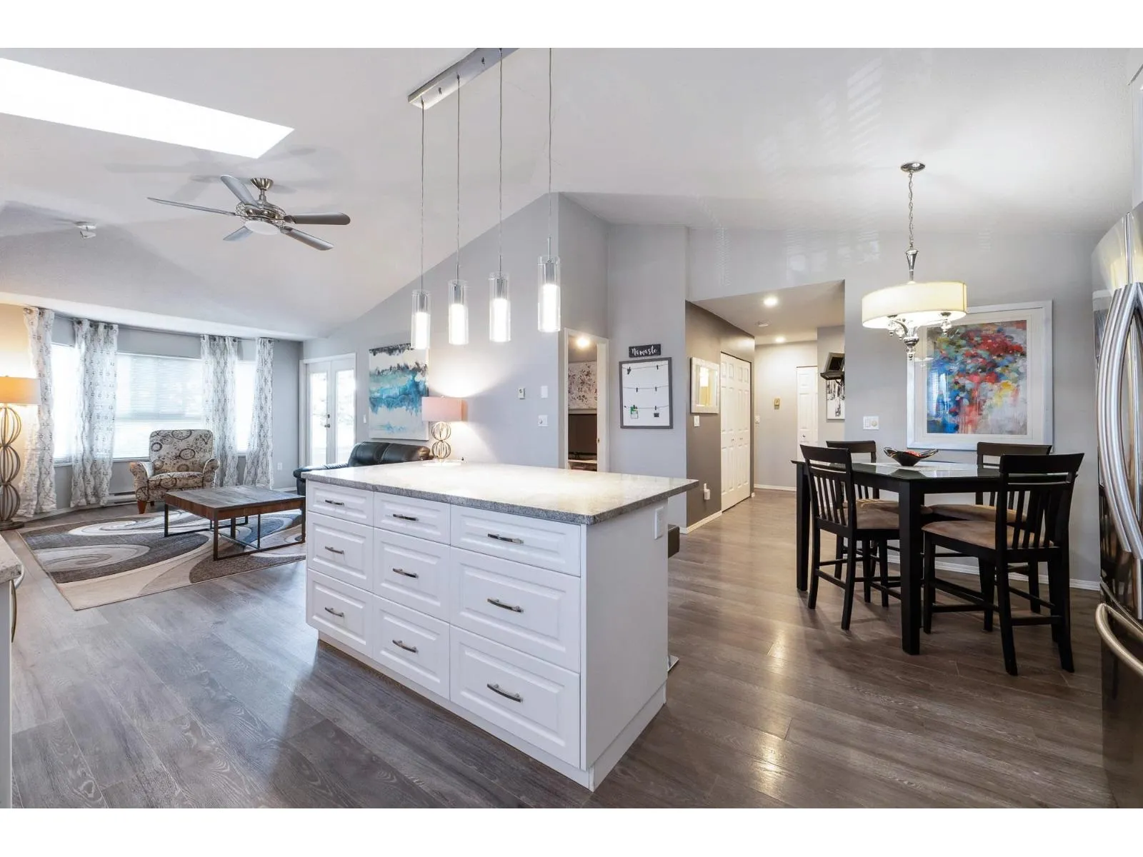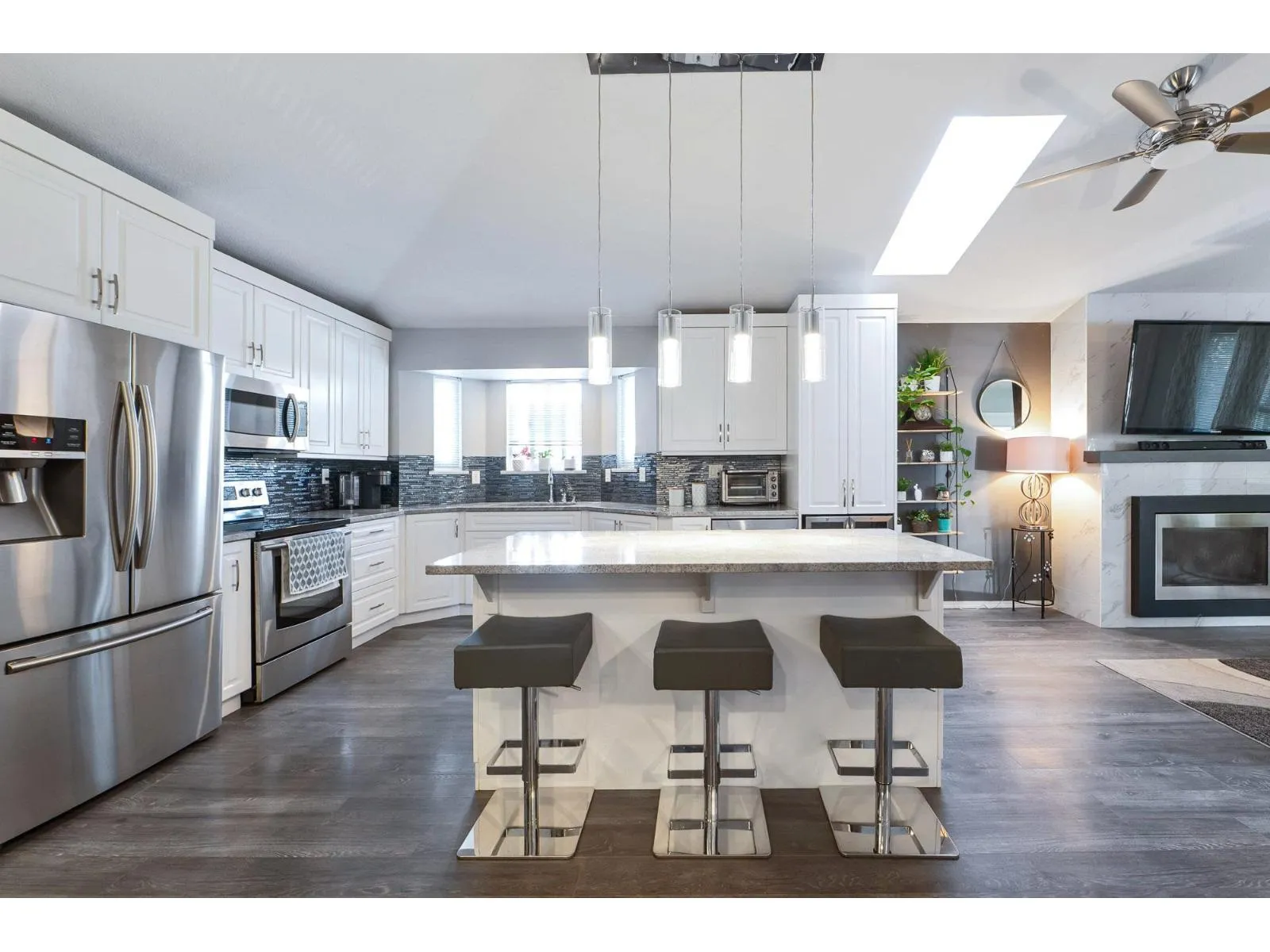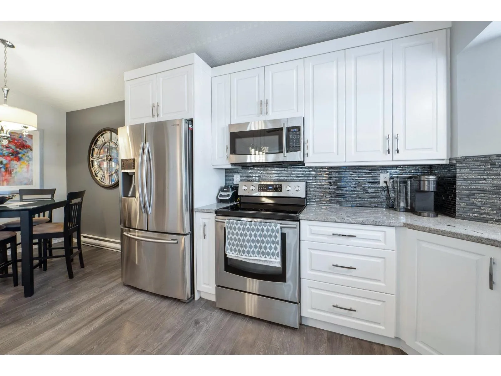 Experience Westside Estates, where luxury meets convenience! This top-floor corner unit is a rare find, offering exceptional privacy and natural light pouring in through the skylight. The beautifully updated kitchen is a chef's dream, featuring modern quartz countertops, stylish finishes, and an oversized island perfect for gathering. Laminate flooring throughout gives the entire home a crisp, contemporary look. Enjoy breathtaking mountain views from your kitchen window, or relax in the spacious living area. With 2 beds, 2 baths, and 2 parking spots, this quiet oasis has everything you need. Plus, it's steps to Willowbrook Mall and the future Skytrain - your urban getaway awaits! Home is where your Storey begins! (id:27476)