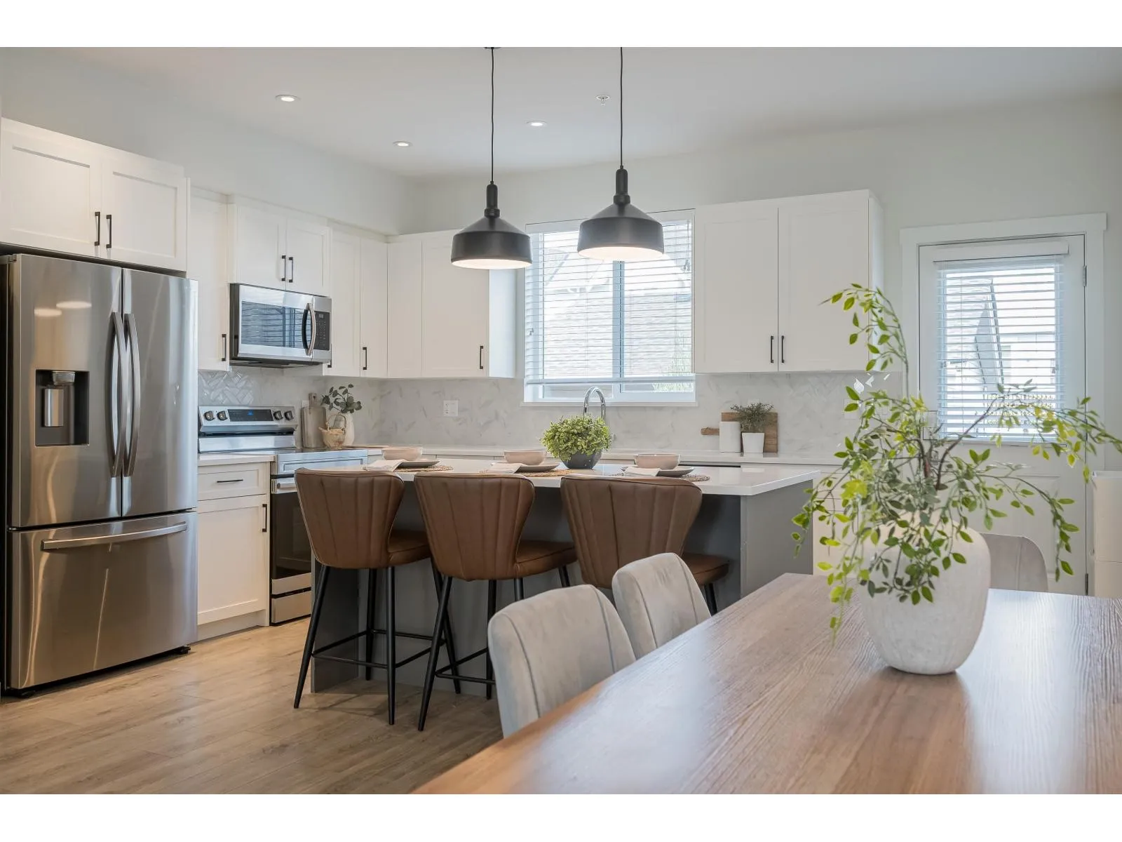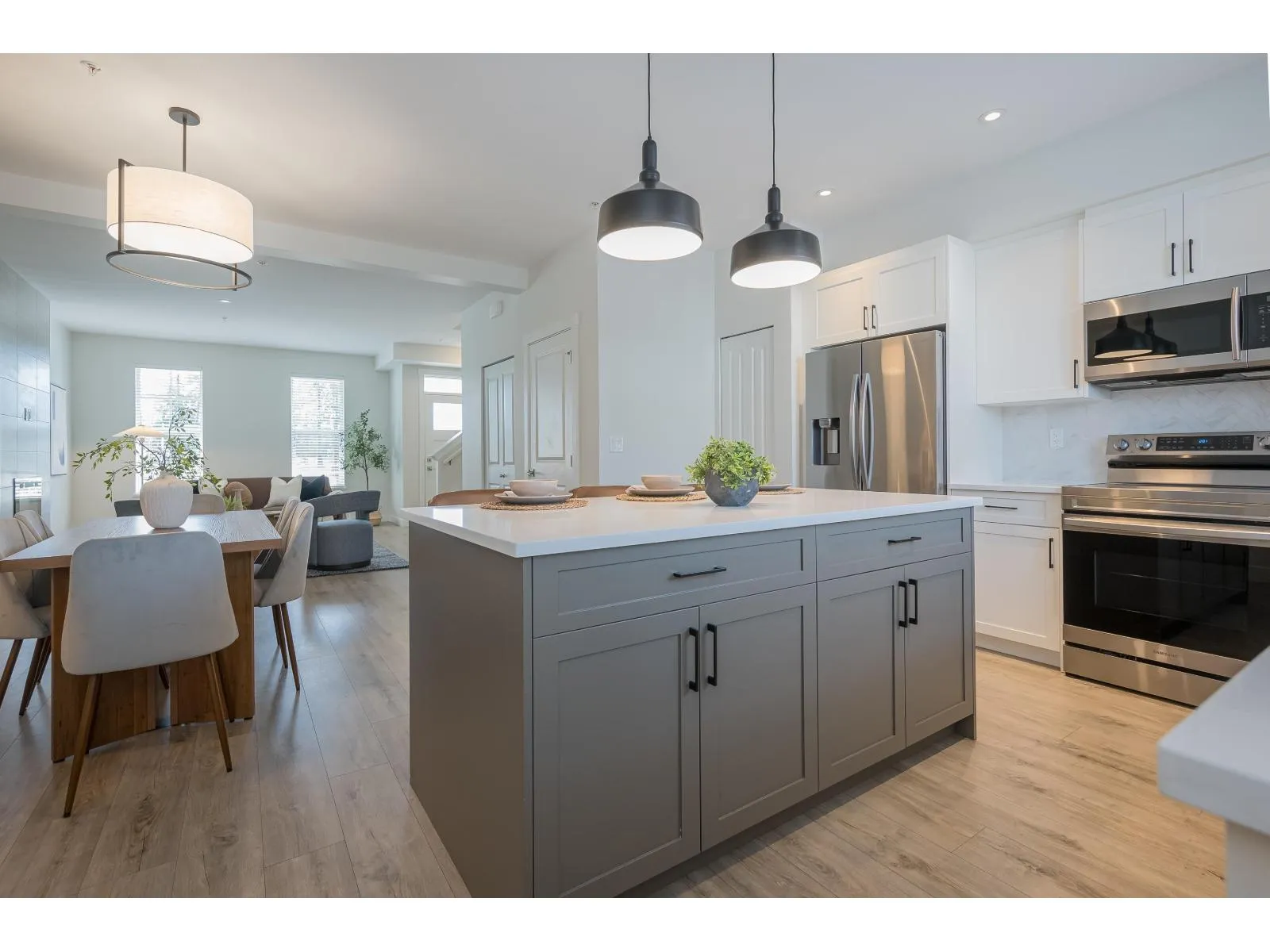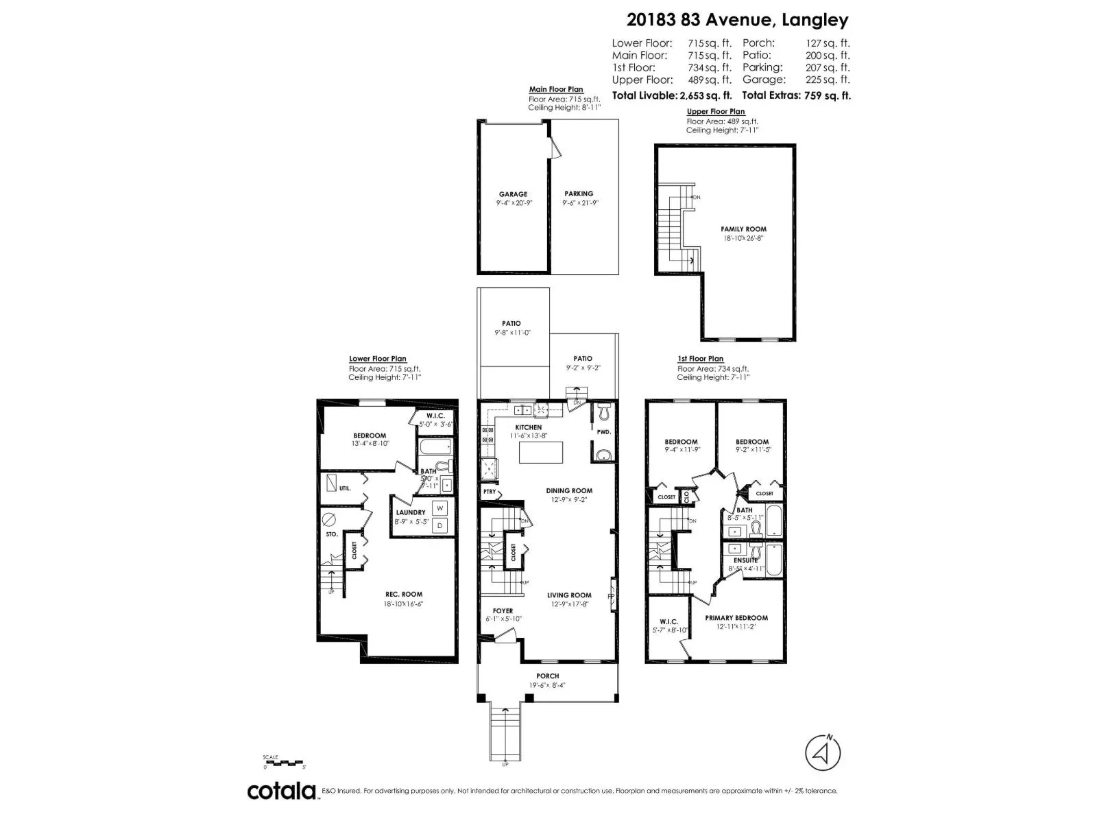 Built by Vesta Properties, this exceptional, south facing, non-strata row home stands out in Latimer Heights. Offering over 2,650 sqft with a rare full 2-level + basement & loft layout, a standout floorplan rarely found in the area. Freshly painted, move-in ready and still under warranty. A/C & basement wet bar roughed-in. The 489 sqft sun-filled loft is a stunning open-concept retreat with park views. Bright, elegant main living, plus a finished basement with rec room, bedroom and full bath. Private fenced yard, garage and extra parking. Steps to Latimer Village, top schools, parks and Hwy 1. Perfect for families or professionals needing flexible space, with a premium park-front setting. Rare combination of size, layout and location in one of Willoughby's most sought-after communities. (id:27476)