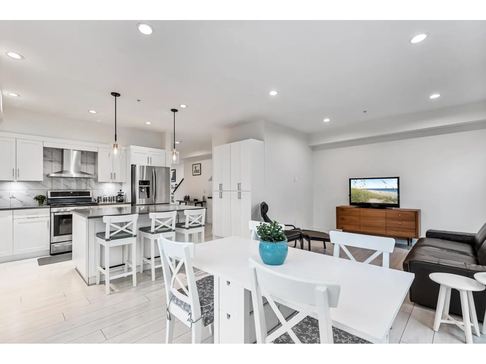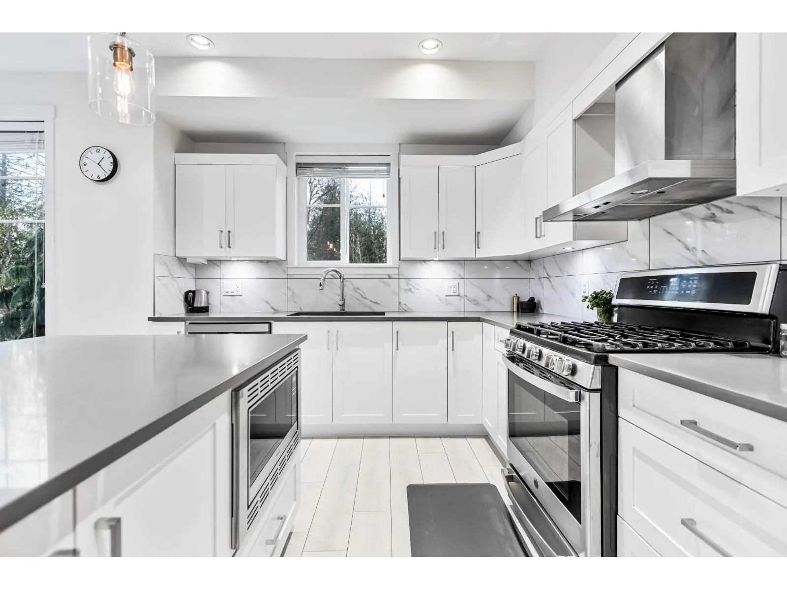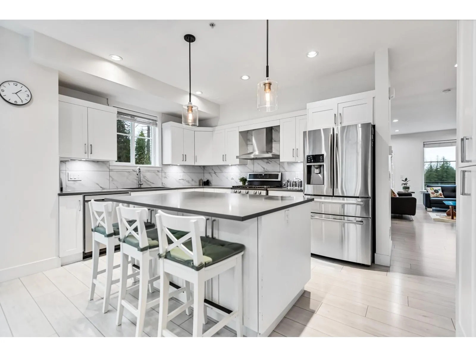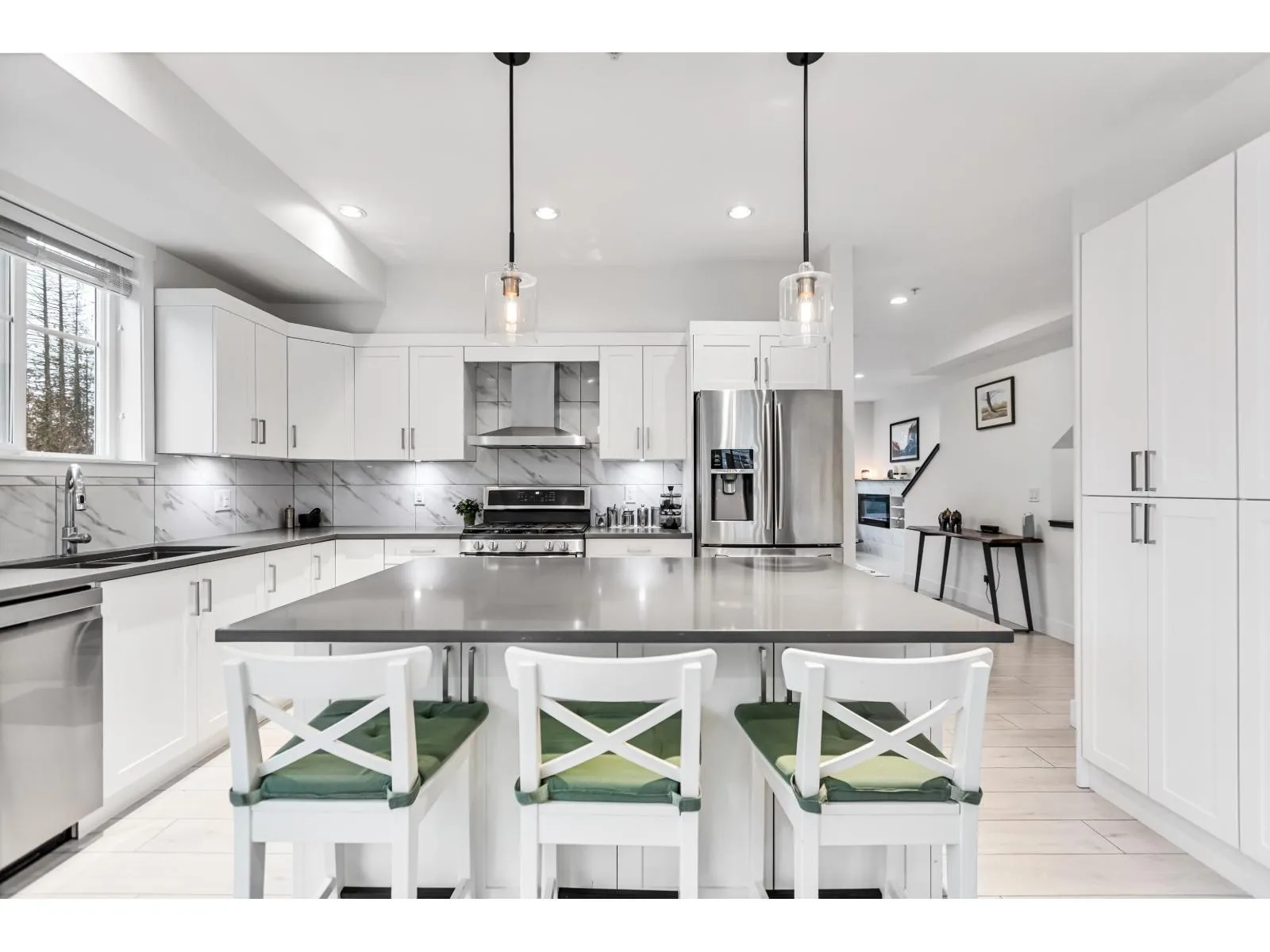 HUTTON. Impressive 5 BED, 4 BATH, 2,516 sq. ft. END UNIT tucked into a beautifully treed setting. Bright 9 ft. ceilings, rich wide-plank flooring, and a thoughtfully designed kitchen with quartz counters, stainless appliances, gas range, shaker cabinets with clever built-ins, and a generous island. Perfect for gatherings and everyday comfort. Upstairs, the spacious primary suite offers a spa-style ensuite with dual sinks, soaker tub, and shower. A lower-level bedroom with its own ensuite is ideal for guests or teens. Side-by-side garage plus visitor and street parking. Minutes to Willowbrook Shopping Centre, great dining, recreation, Hwy 1, Hwy 10, and the upcoming high school - an incredible opportunity for growing and young families. (id:27476)