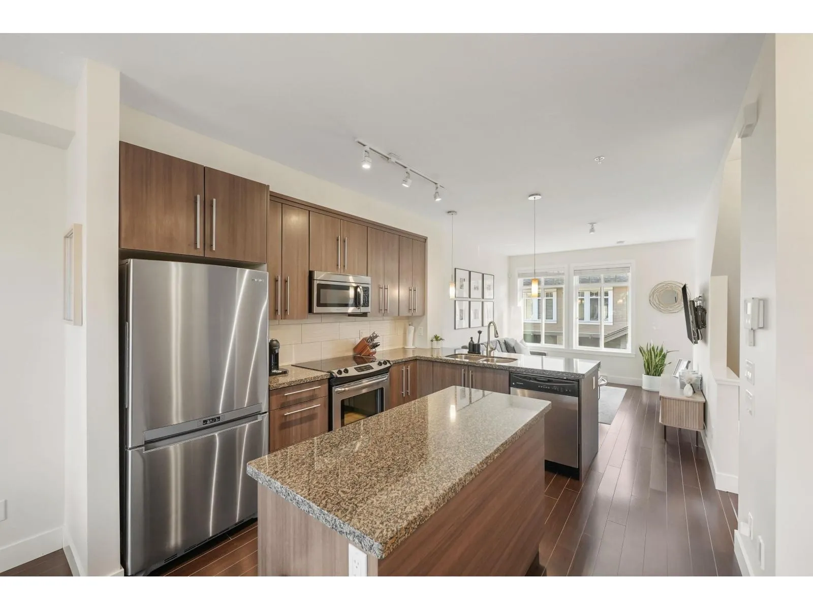 STUNNING, SHOW HOME CONDITION T.HOME IN OUTLOOK w/ BONUS- 3 PARKING SPOTS! This Unit is beautifully finished throughout + features a split staircase to the other side of home with sep. entry to your yard & garage or convert to office, gym or studio for extra space! Your Main level is complete w/ a POWDER RM on main + laminate floors & bright kitchen w/ SS Appliances, granite counters + space for stools & cozy living area w/ updated & modern lighting too! Enjoy your spacious Bdrms w/Lndry above too! Fresh paint throughout & amazing functionality w/ great use of space! BONUS: Your Deck off kitchen faces away from other units for unique privacy or watch kids play below! Great, family complex, fenced yard + Lynn Fripps Elementary is just steps from your door! A MUST SEE HOME! (id:27476)