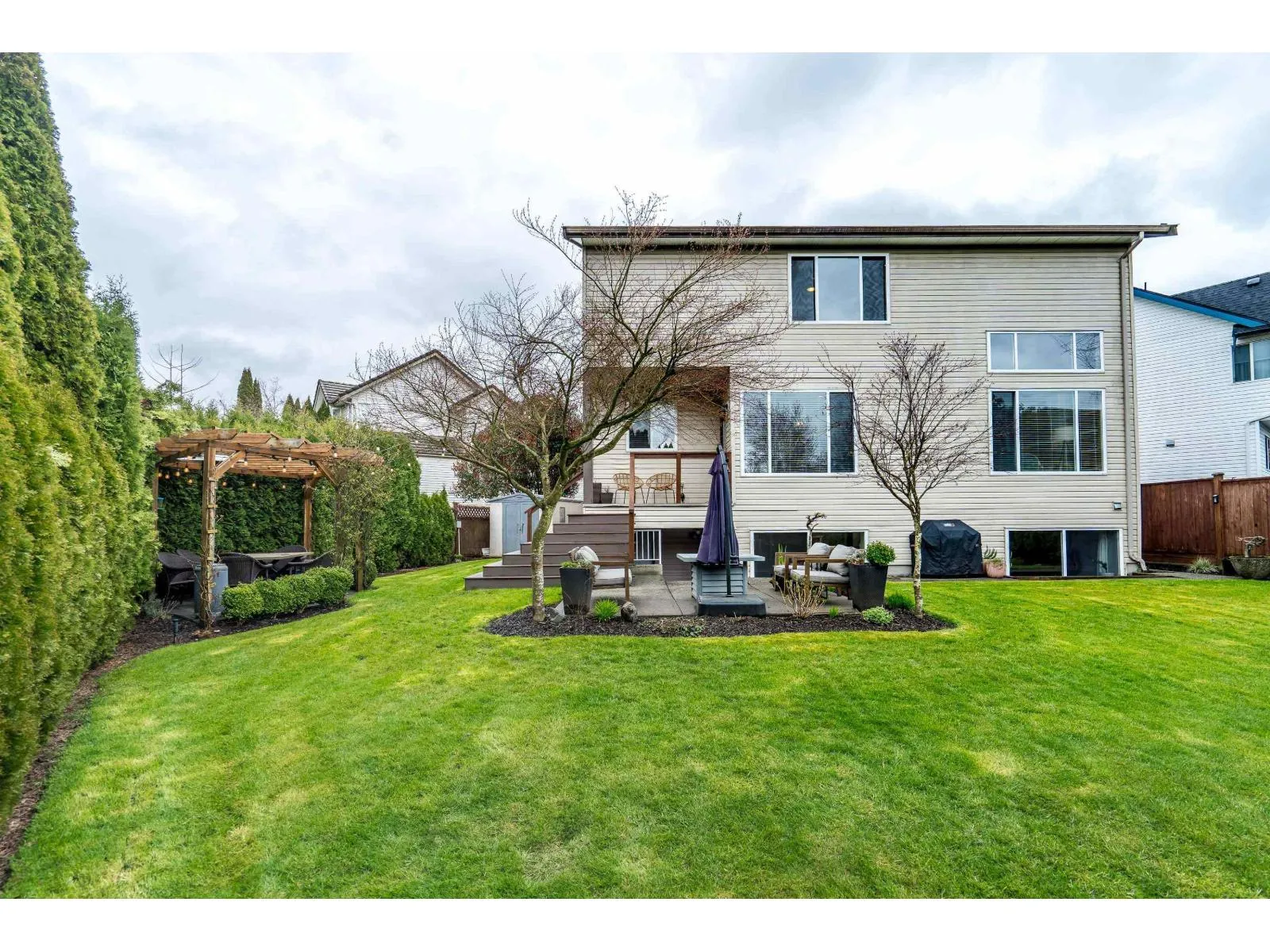 Rarely available! This executive home in Walnut Grove's exclusive MANOR PARK is offered for only the second time. Tucked on a quiet cul-de-sac and walkable to ALEX HOPE & WGSS, this 5 bed + den home features soaring 2-storey windows, vaulted ceilings, granite countertops, and newly refinished hardwood floors. Major updates include roof, furnace, and A/C (2019-2021). Enjoy a NW-facing backyard with balcony, patio, pergola, garden boxes, and in-ground sprinklers. Basement offers 1-2 bed suite potential. Extra-long driveway + double garage allow RV parking. Once you're here, it's easy to understand why homes like this are so hard to leave. (id:27476)