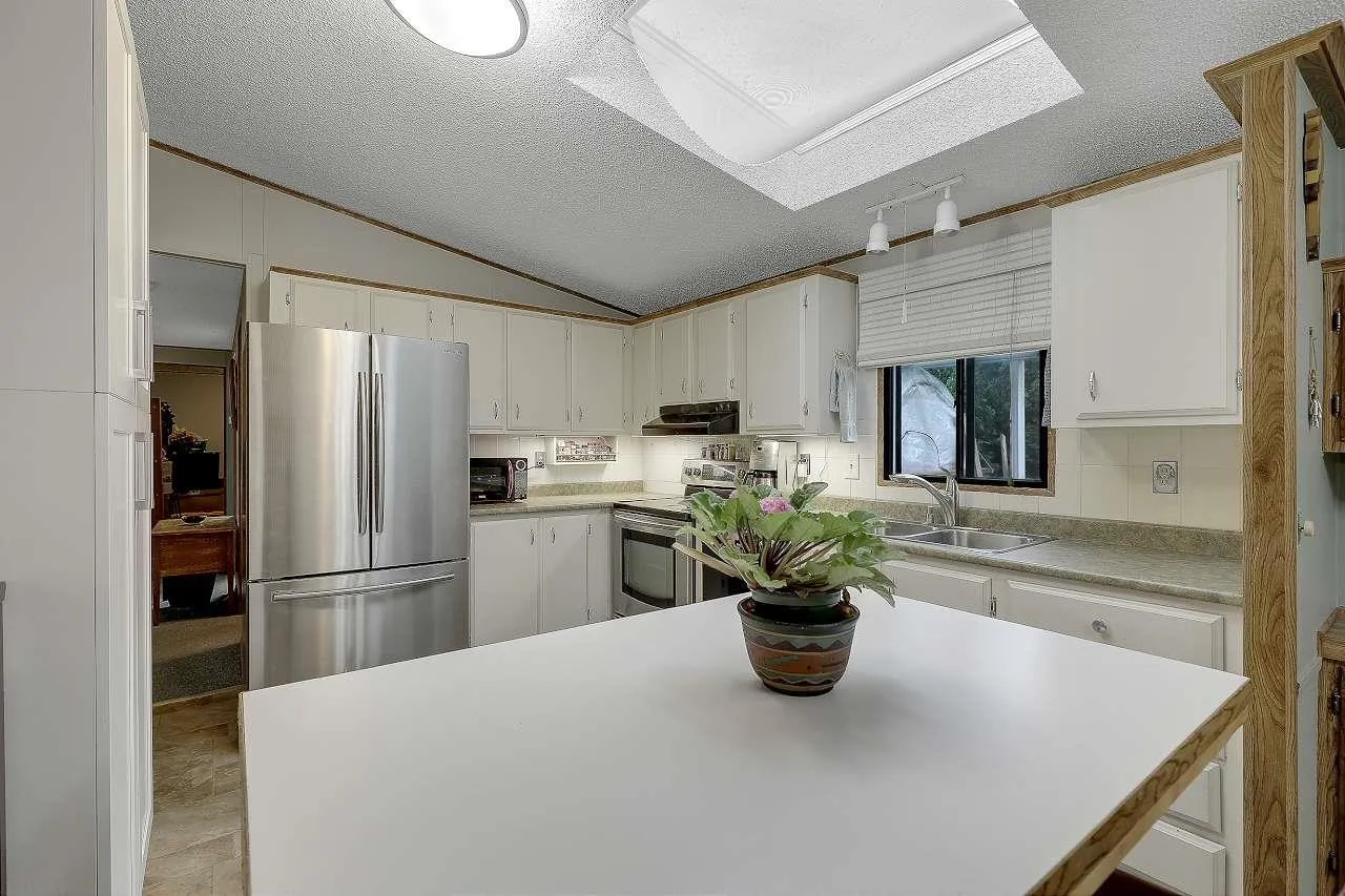 Best value in Fernridge's 55+ community! This bright and spacious 3 bed, 2 bath home has key updates already done-newer roof, hot water tank and furnace. Enjoy vaulted ceilings, a walk-in closet in the primary, built-in vacuum, newer skylight and pantry, plus newer patio and awnings front and back, and a shed for extra storage. Located in a quiet, private location within the park with clubhouse and RV parking. No pets. No rentals. Walk to IGA, Artful Dodger Pub, and transit. Exceptional opportunity-don't miss it! (id:27476)