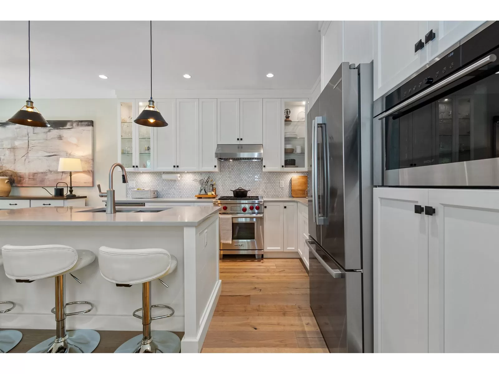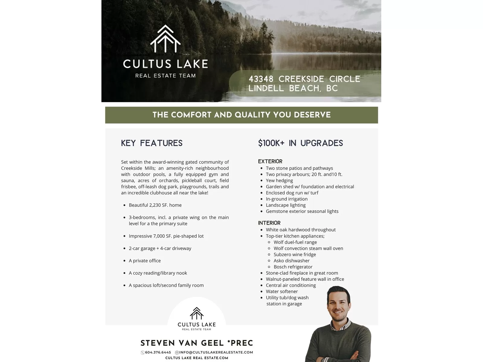 Welcome to the home you've been waiting for, and now, the one you deserve! Set within the award-winning gated community of Creekside Mills, this impressive 2,230 SF. home strikes the perfect balance between the space you're used to and move-in-ready comfort you've earned. Designed for main-floor living, it features a private wing for the primary suite, a walnut-clad office, and a top-tier kitchen with Wolf, Sub-Zero, Bosch & Asko appliances. Upstairs offers plenty of space for visiting family & friends. Outside, the 7,000 SF. lot has been transformed with $43K in upgrades: lush hedging & gardens, stone patios, privacy arbours, an all-season covered deck with gas fireplace, garden shed, irrigation, and dog run. Durable white oak floors run throughout the home, along with A/C, a water softener, and a double garage plus parking for 6! Homes with this level of care and detail rarely available, especially in a amenity-rich community like this one; pools, gym, orchards and an incredible clubhouse all near the lake! (id:27476)