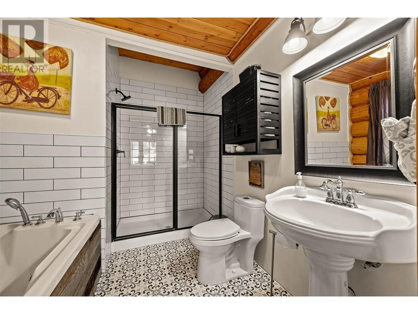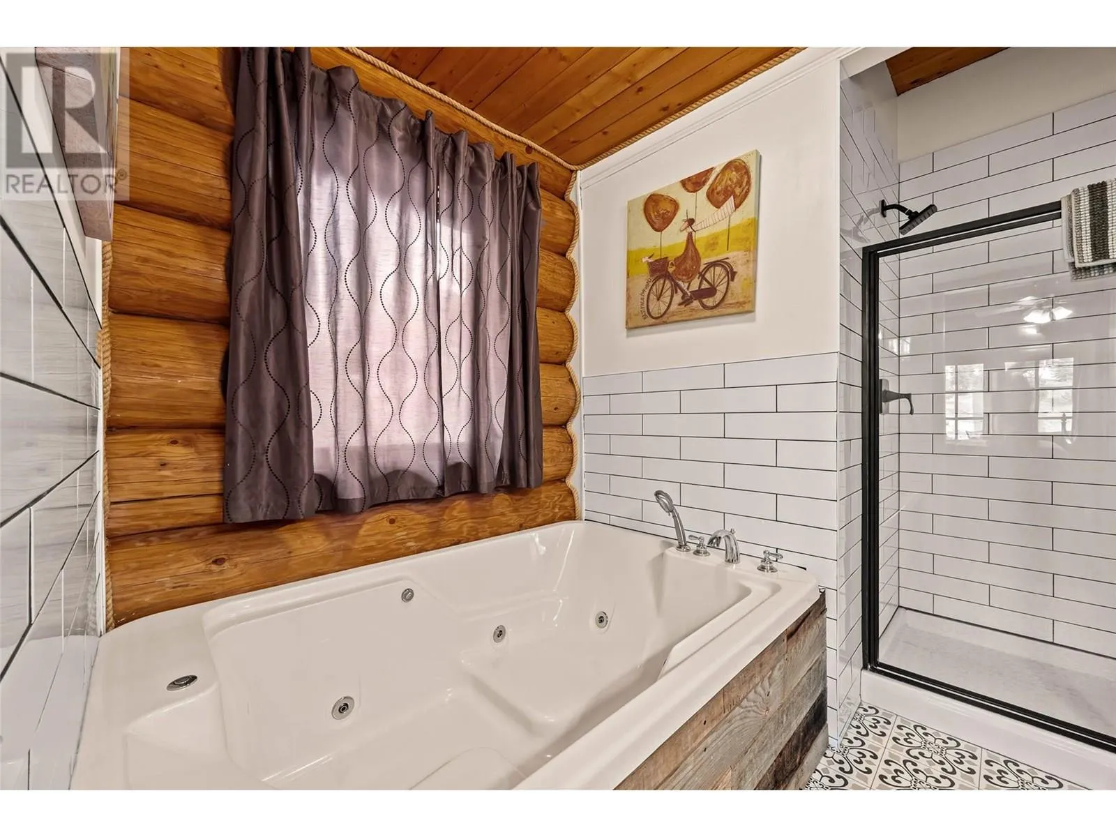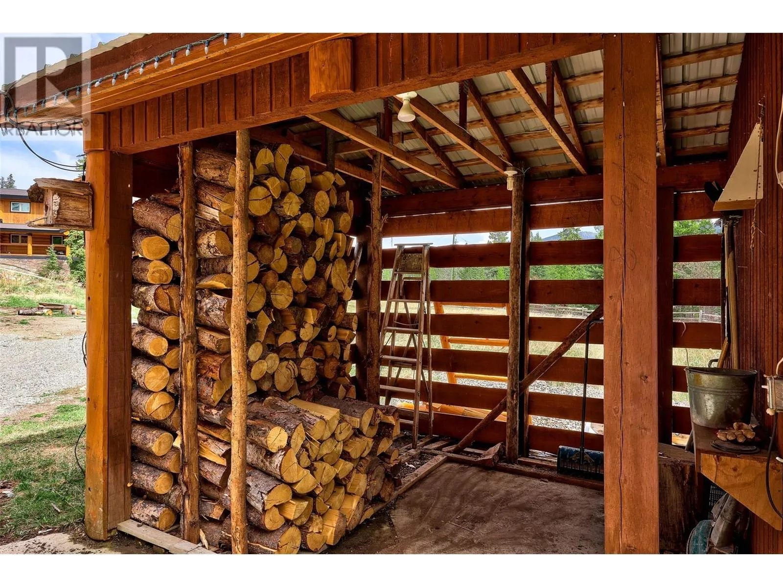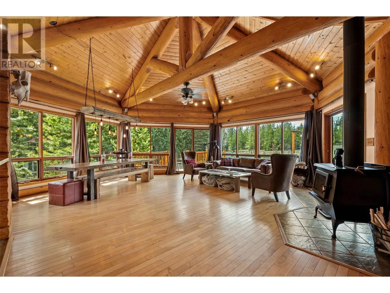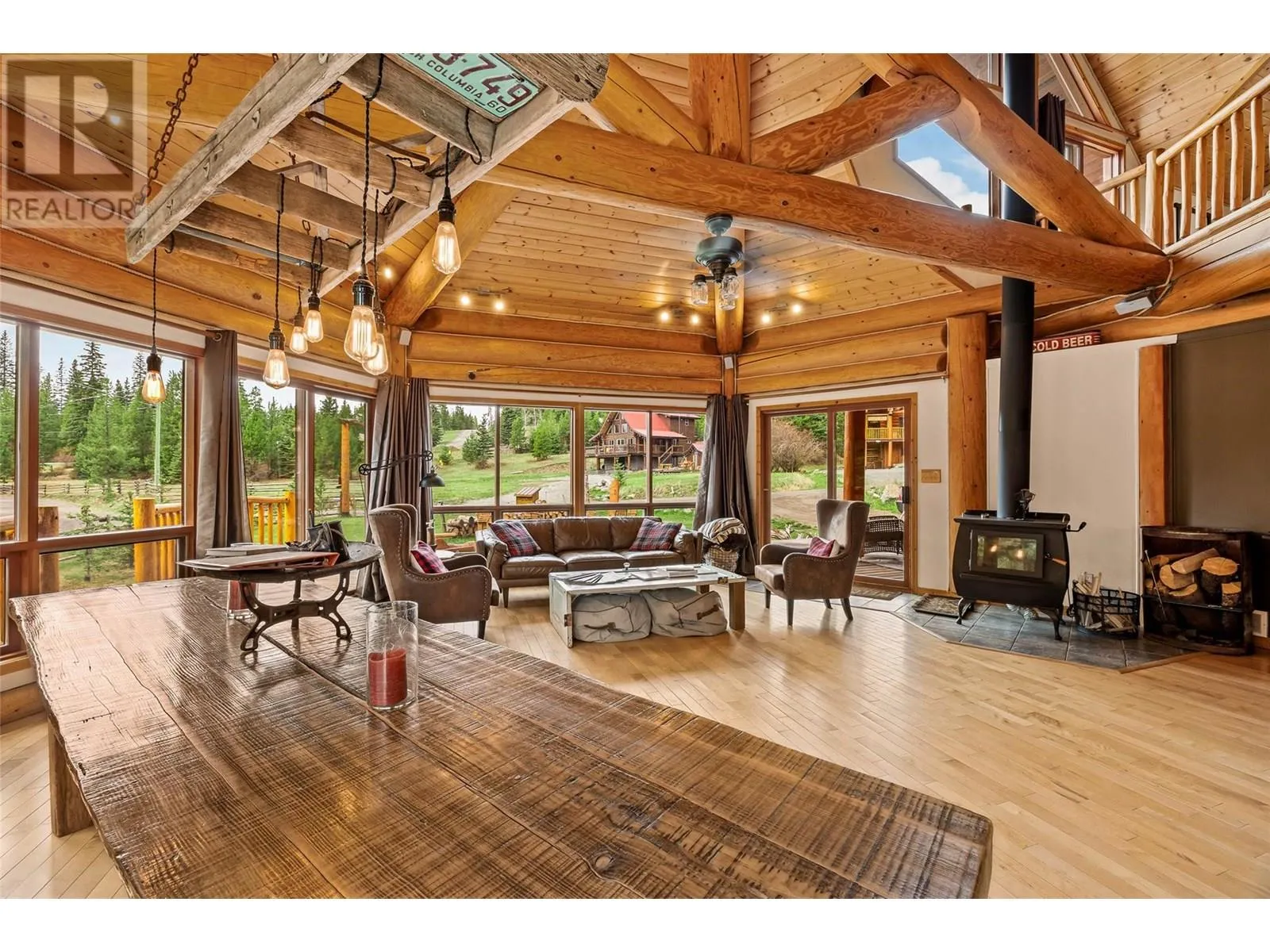 Escape to the tranquility of Mile High Resort Community This stunning log home nestled amidst the beauty of nature. Crafted with 12-16 inch Douglas Fir logs and adorned with maple hardwood floors. The heart of the home lies in the large kitchen, featuring a huge island and raised eating bar, perfect for casual dining or hosting gatherings with friends and family. The kitchen is equipped with 6 burner antique looking propane stove and ample storage space, making it a chef's delight. The master suite is complete with its own balcony overlooking the serene surroundings. The ensuite bathroom with a double shower and oversized jetted, soaker tub. Murphy bed downstairs with pull out couch so could sleep 12 if needed. Crawl space for storage or kids play area. Outside, the 0.26 acre lot provides space for outdoor activities and relaxation. Enjoy shared lake access and snow removal services included in the modest strata fee of $114.79 per month (water, sewer, and management services). Contact Listing Realtor for showing availability dates due to the home being used as a VRBO currently. (id:27476)