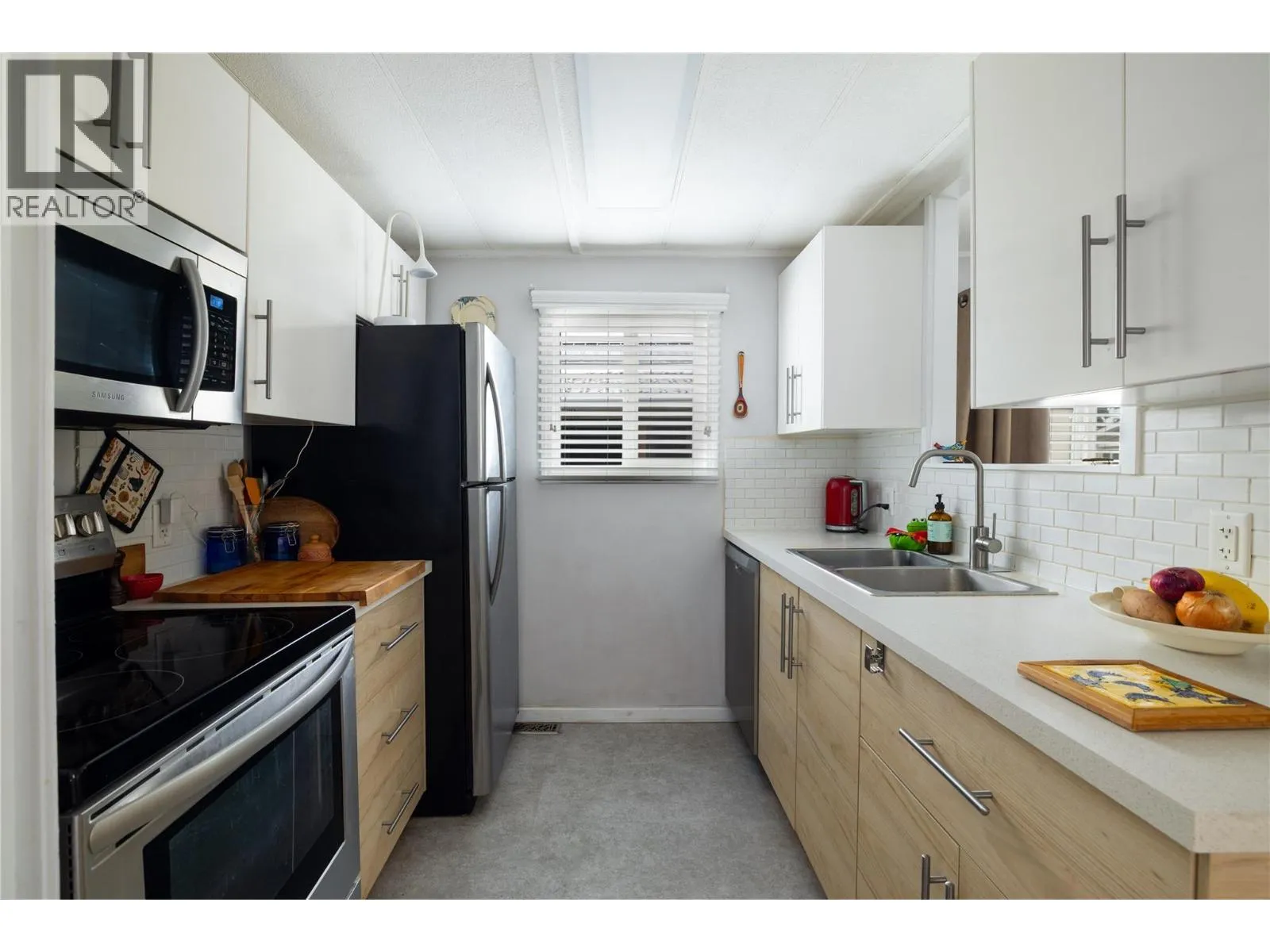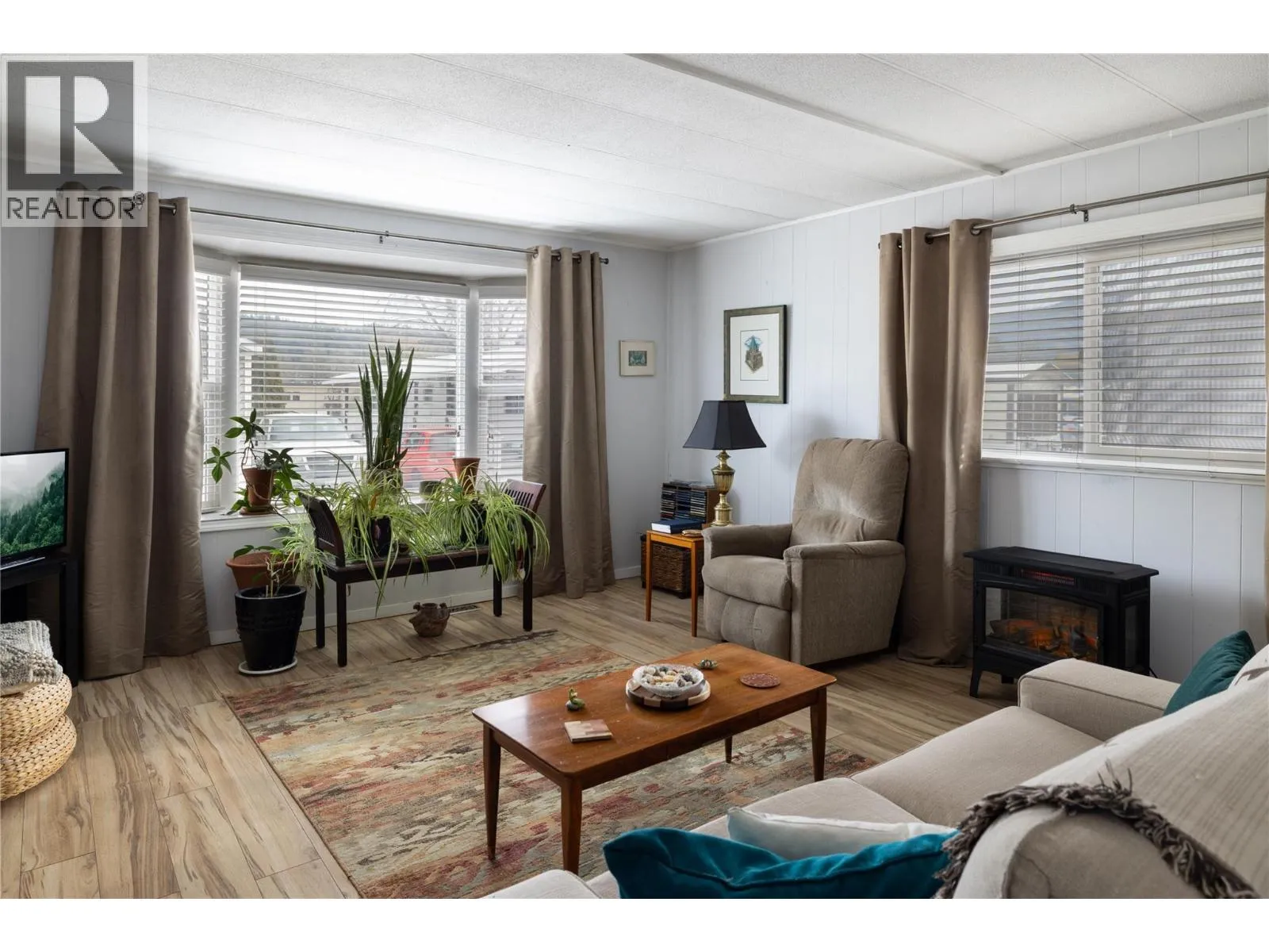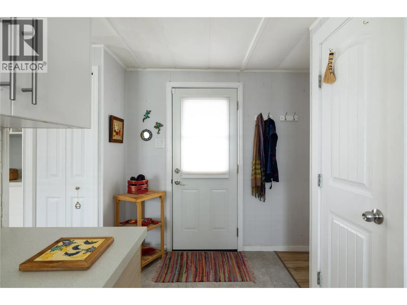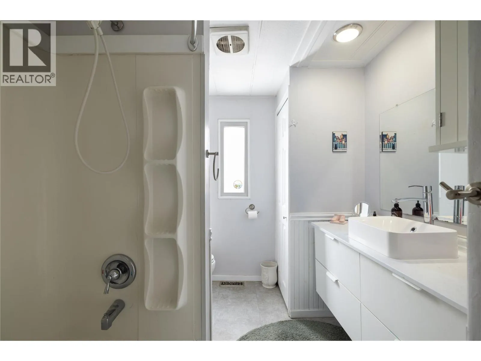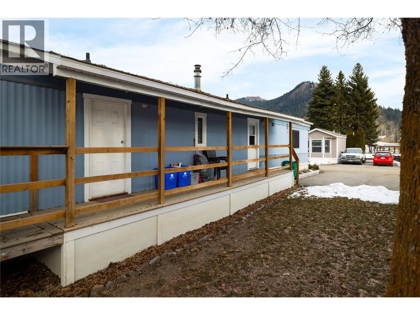 This charming 2-bedroom, 1-bathroom mobile home in Valmarie Mobile Home Park offers a bright and functional living space spanning approximately 900 square feet. The interior features a spacious living room highlighted by a classic bay window that brings in plenty of natural light, while the adjacent dining area includes built-in cabinets for convenient storage. In the kitchen, you will find a dedicated pantry that helps keep the space organized and efficient for daily meal prep. The home has been thoughtfully updated, particularly in the full bathroom which boasts a modern floating vanity and sink along with a bathtub and shower. The primary bedroom is well-sized and includes a large double closet as well as a secondary private entry directly into the bathroom for added convenience. Additionally, the layout includes a second bedroom, in-unit laundry, and a utility room, while the exterior offers a rear deck that is perfect for outdoor relaxation. Located in the heart of Lumby, this property is within easy walking distance to all local amenities and backs directly onto the school, making it an ideal spot for those seeking convenience. The park has no age restrictions, offering a welcoming environment for all residents. With a 25-minute drive to Vernon and a 53-minute drive to Kelowna International Airport, this home provides a peaceful small-town lifestyle without sacrificing easy access to major urban centers and travel hubs. (id:27476)