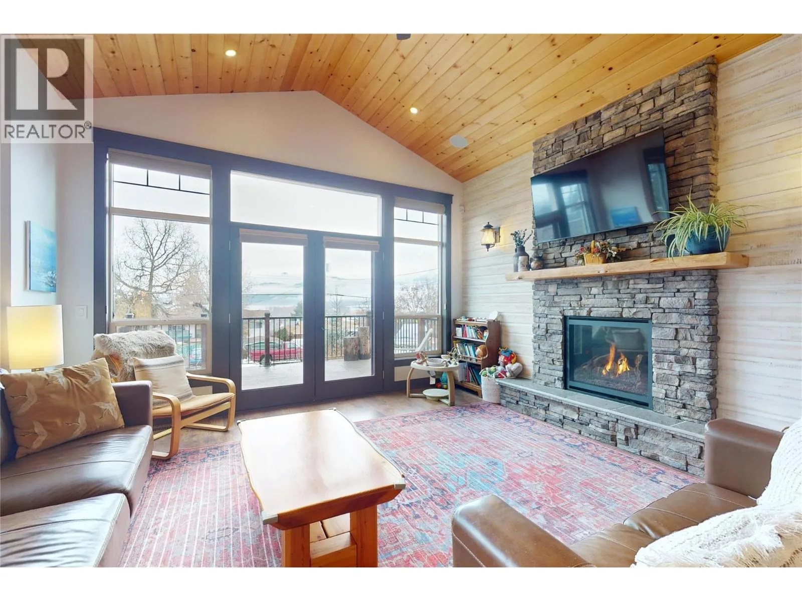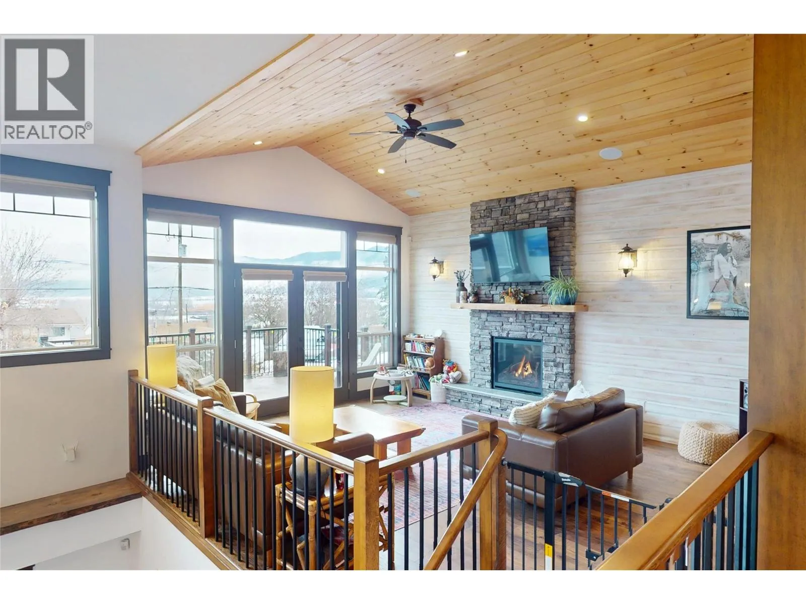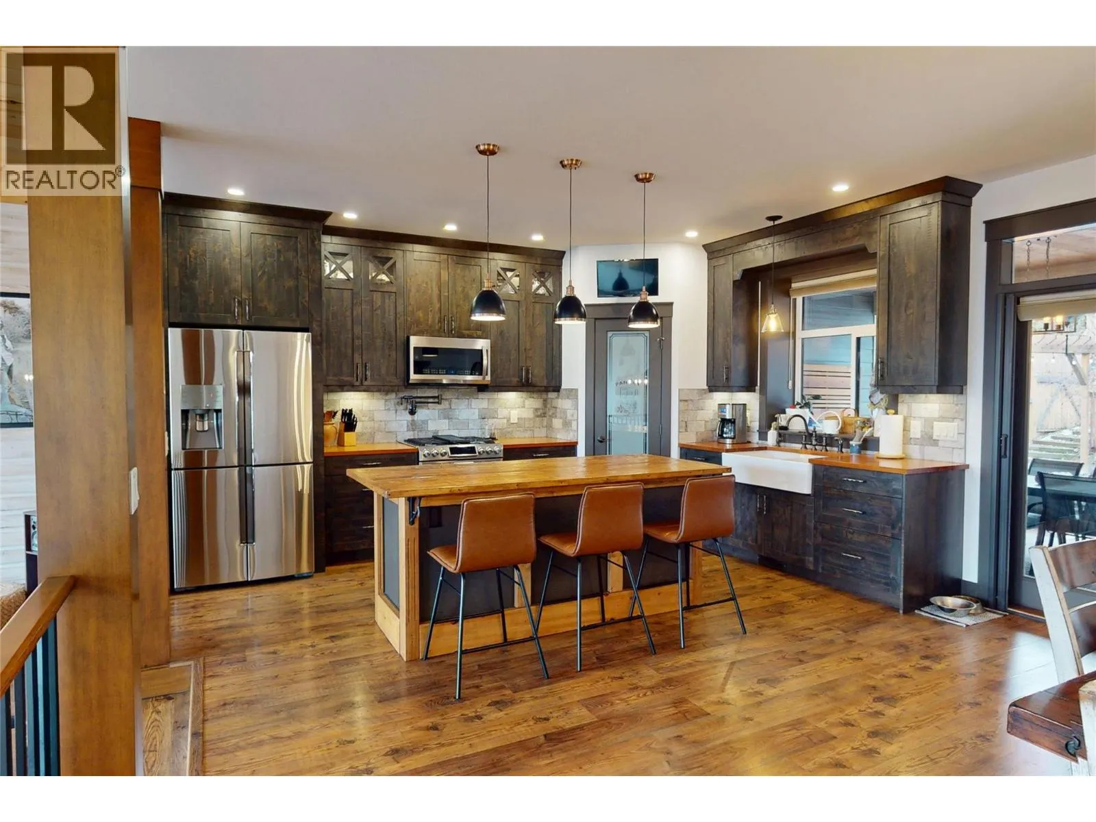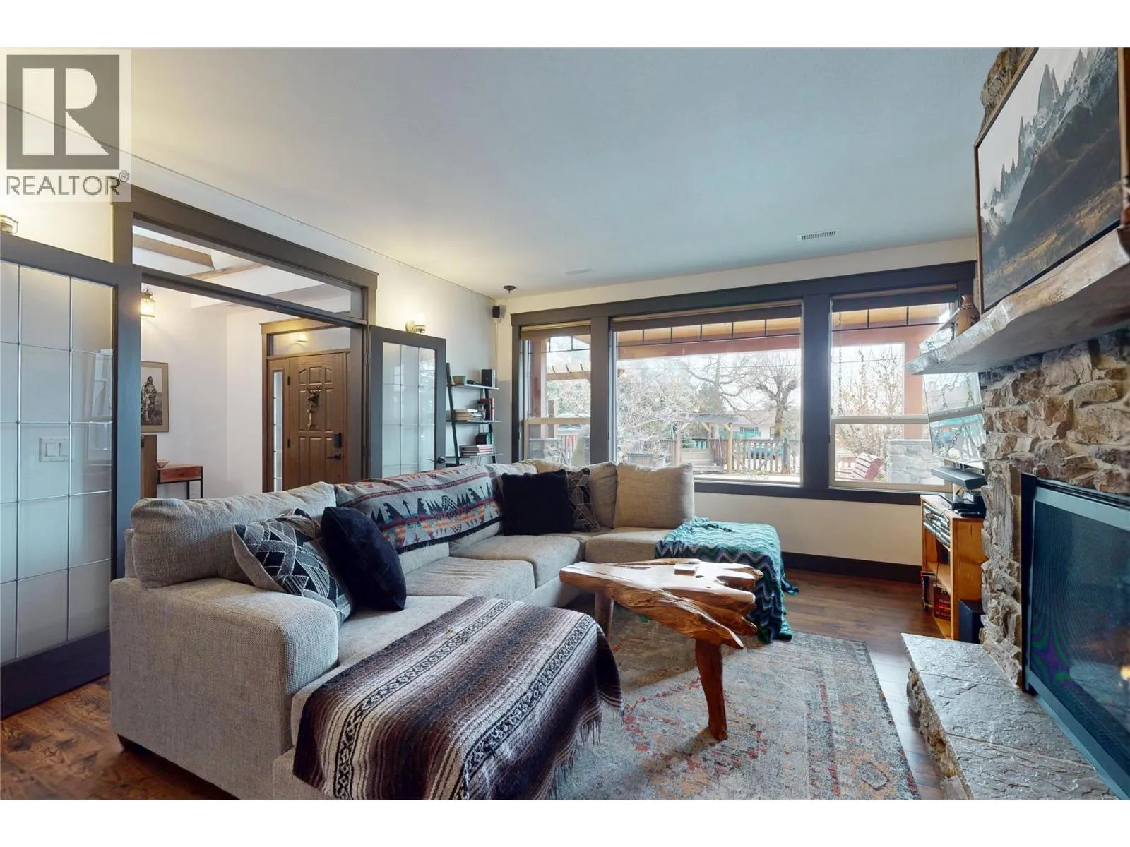 This 2018 custom farmhouse showcases quality craftsmanship and thoughtful design throughout. Warm and inviting, this 4-bedroom, 3-bathroom home offers 3,089 sq. ft. of beautifully finished living space. The open-concept main level is ideal for family living and entertaining, featuring vaulted ceilings, a stunning rock-faced gas fireplace, and oversized windows that frame spectacular mountain views. Step outside to the expansive front patio to take it all in. The gourmet kitchen is a showstopper with custom ceiling-height walnut cabinetry, gas range, cherry wood countertops, a live-edge island, farmhouse sink, and pantry. The spacious primary bedroom features vaulted ceilings, in-floor heating, and a luxurious ensuite complete with a soaker tub, Italian-tiled shower, double vanity, and large walk-in closet. The lower level offers a cozy family room with gas fireplace, an impressive âman caveâ with a 10-foot live-edge bar, and a generous laundry/hobby room. Outdoors, enjoy a fully fenced, private backyard designed for entertainingâcovered patio with gas BBQ hookup, hot tub pad and wiring, a 20â x 10â shop, plus mature cherry and plum trees. Additional highlights include alley access with carriage home potential, an oversized heated double garage with space for toys, RV parking, and a driveway accommodating up to six vehicles. Premium upgrades include an air purifier, saltwater softener, full water filtration system, and Navien hot water on demand. (id:27476)
