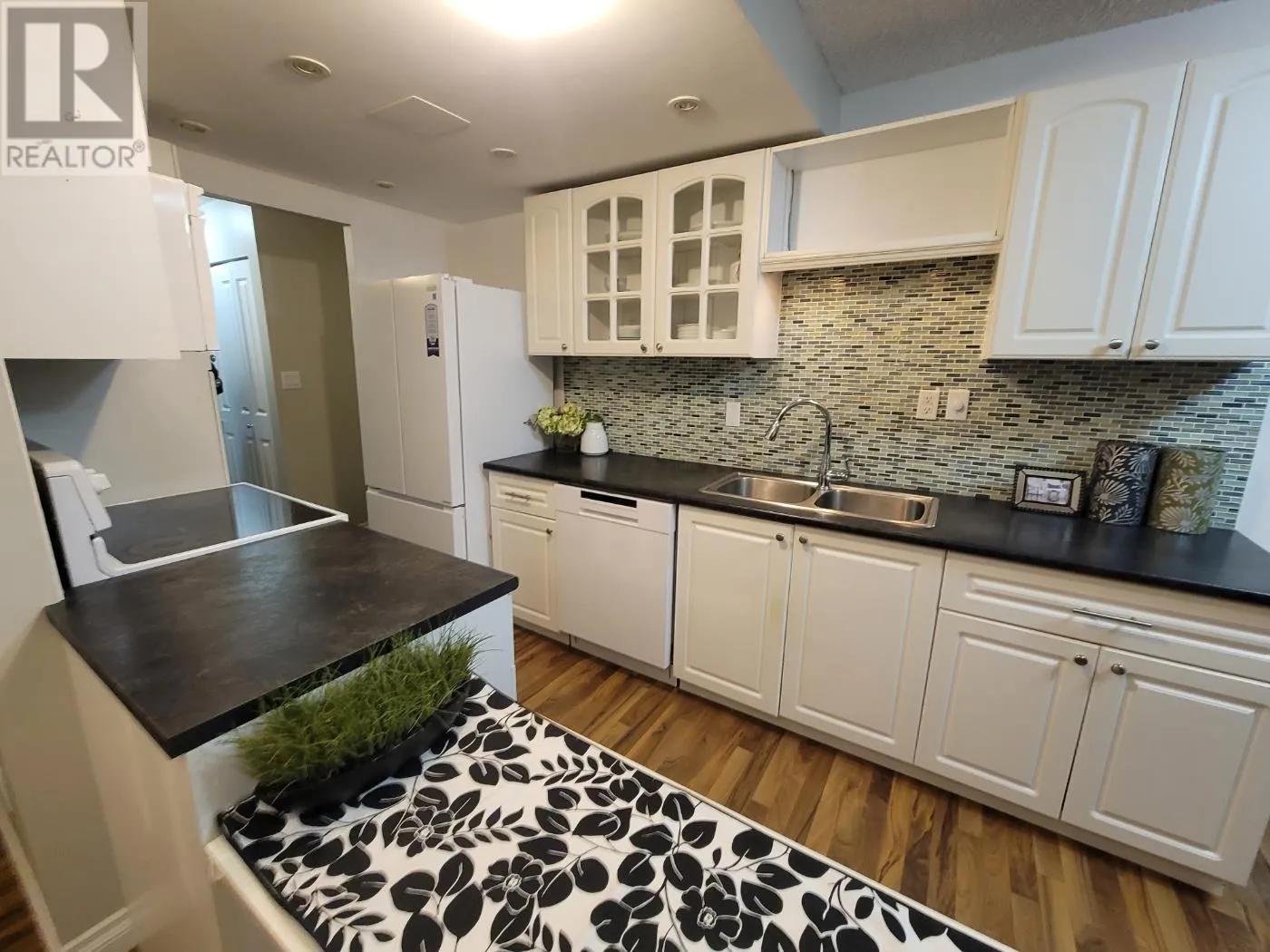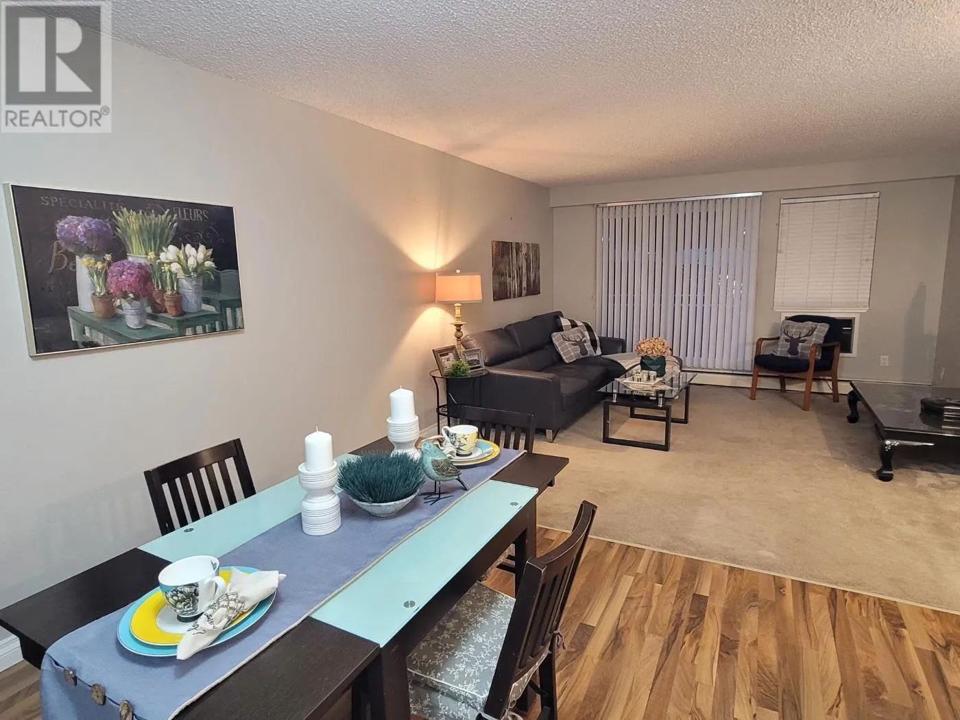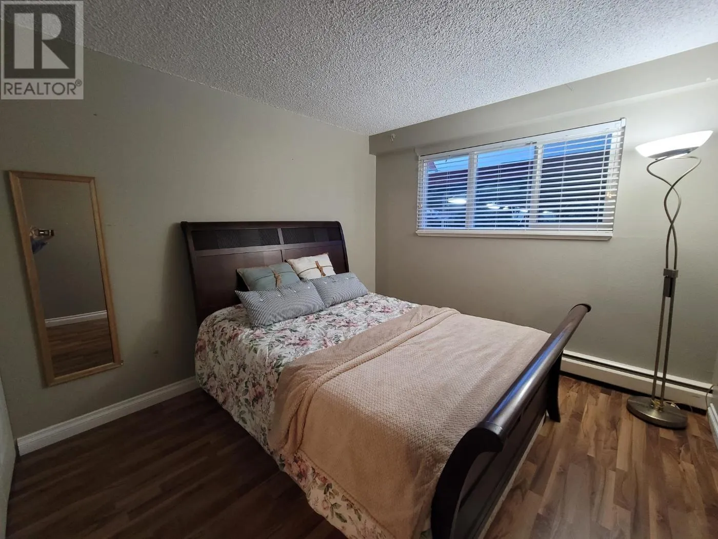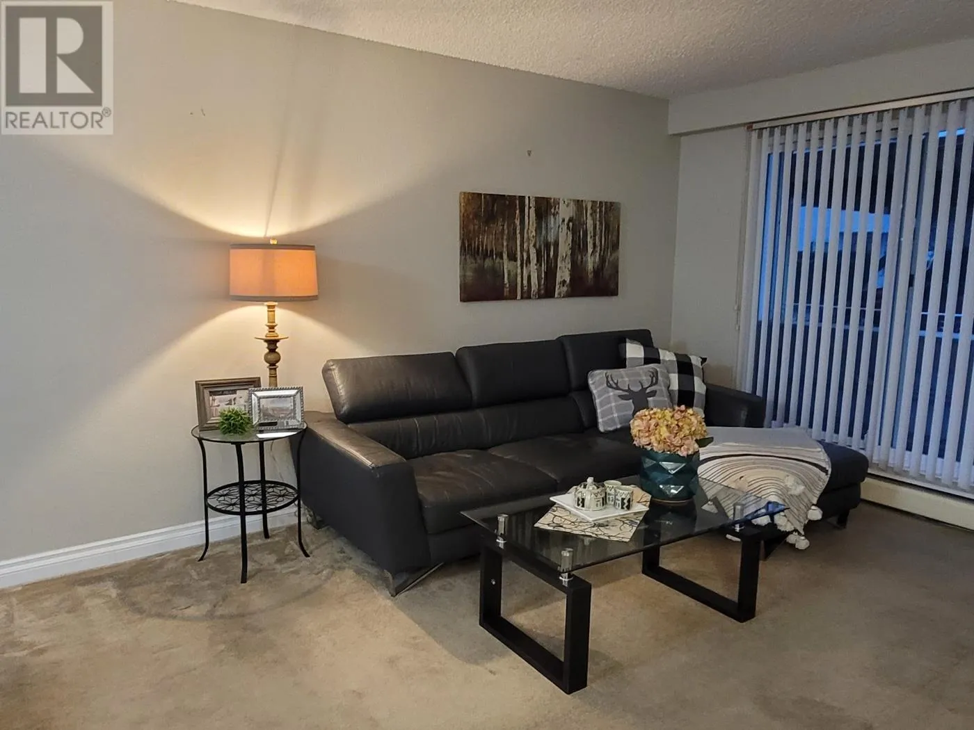 Great value in this 2-bedroom, 1-bath, 845 sq. ft. ground-floor condo! This practically layouted home features an open-concept kitchen with white cabinets and quality appliances. Enjoy easy-care laminate flooring in the kitchen and main living areas, with cozy carpeting in the living room. Both bedrooms are bright,generously sized, and the covered balcony is perfect for a BBQ. Stay comfortable year-round with a built-in wall air conditioner. The well-maintained building features vinyl windows, a dedicated storage locker, and convenient public laundry on each floor. Strata fees include heat and hot water. Conveniently located-just a short walk to transit, shopping, parks, the library, and the rec center! (id:27476)