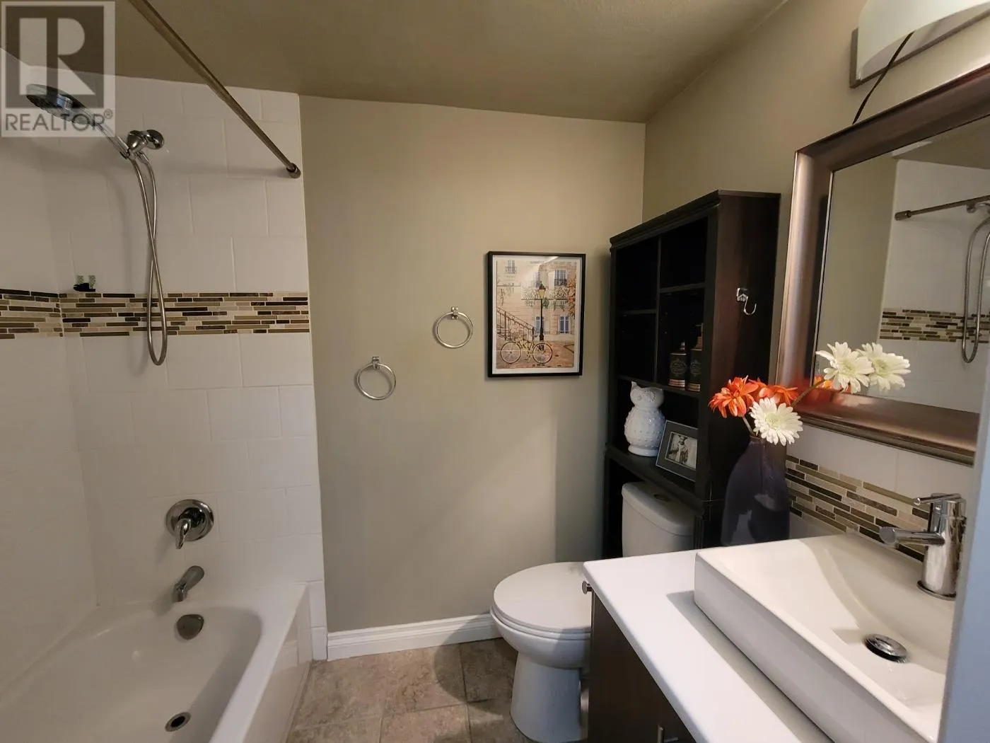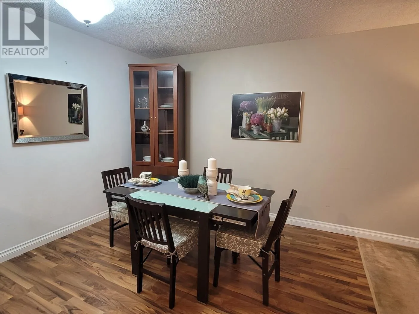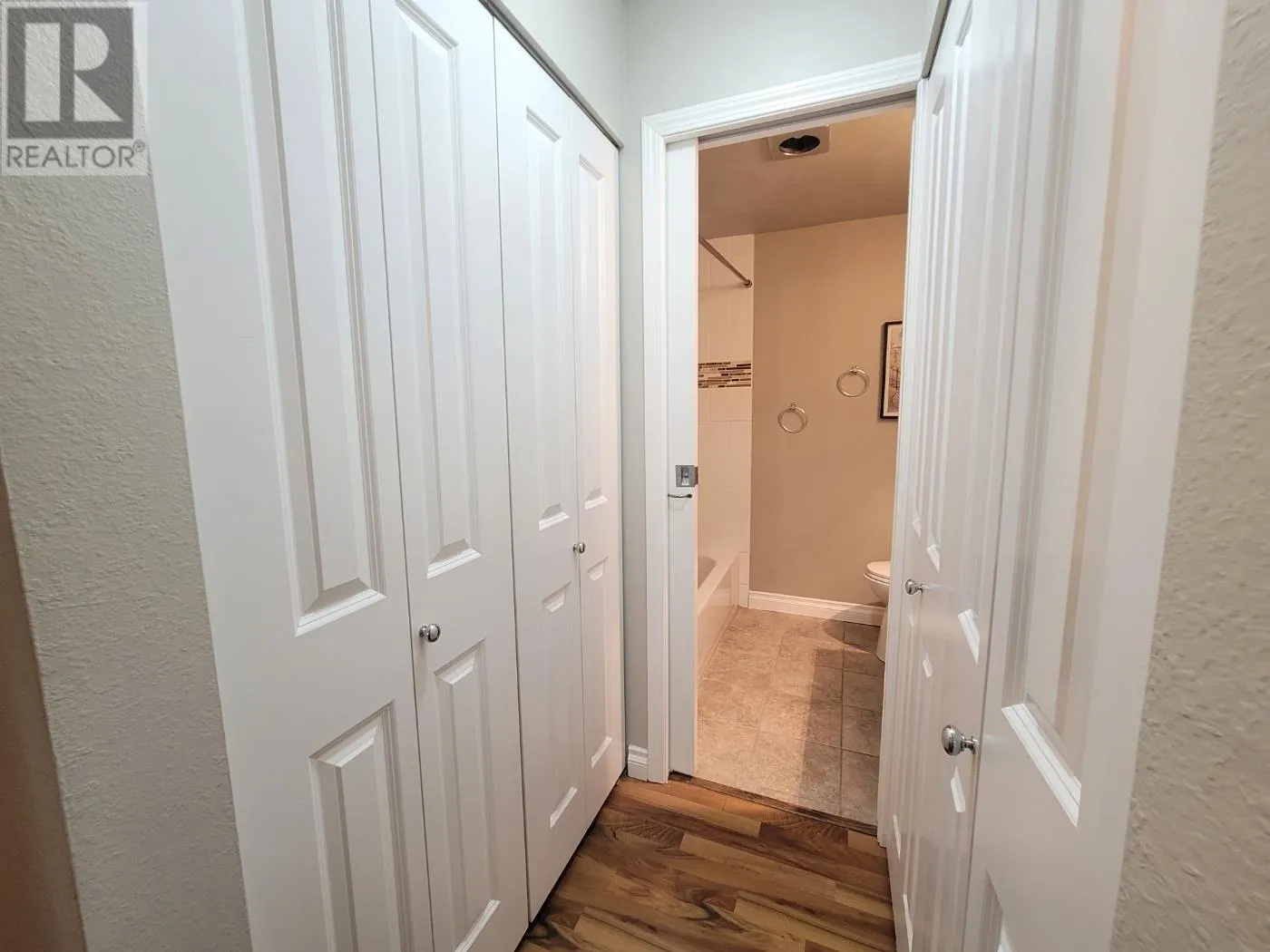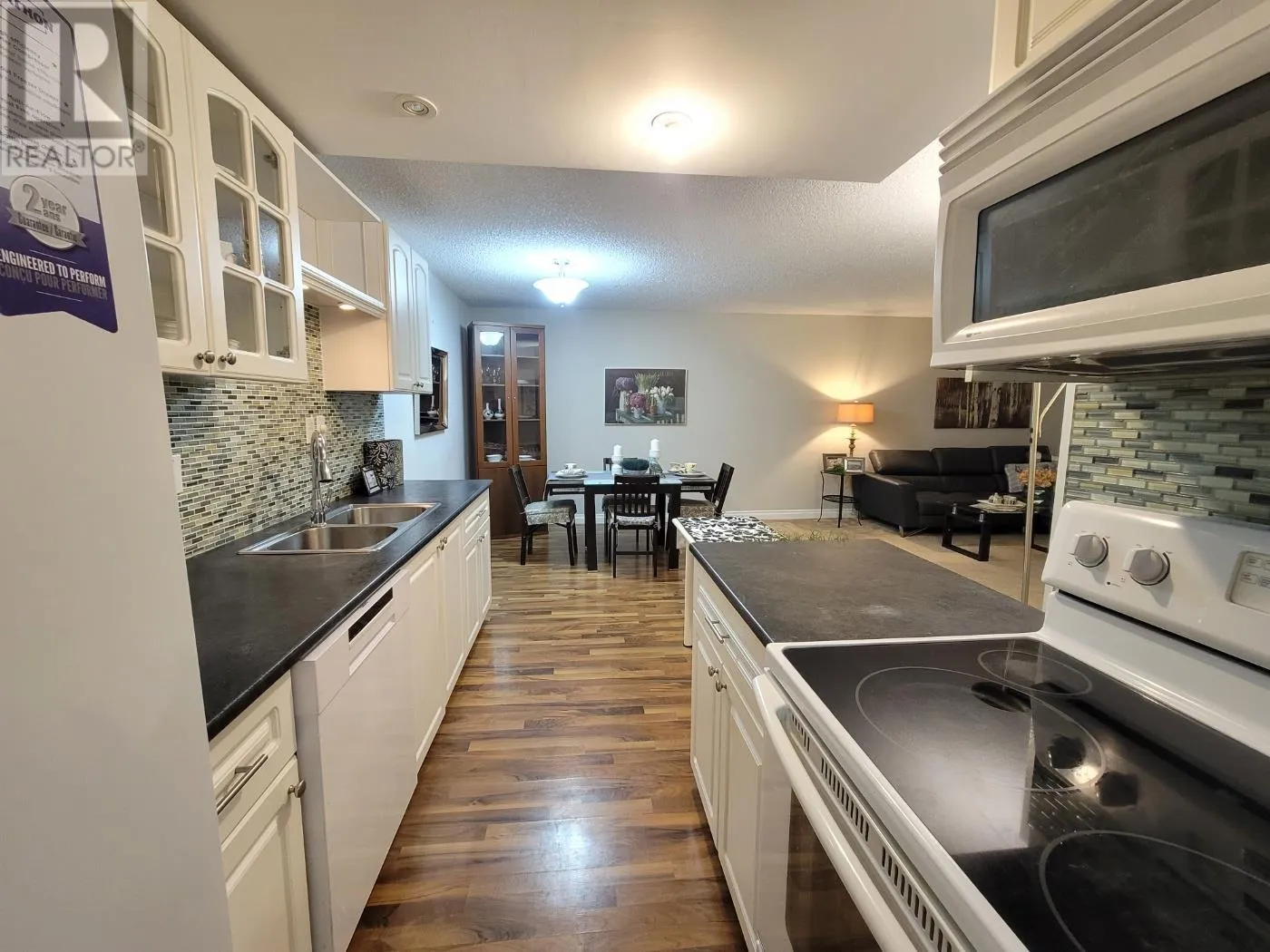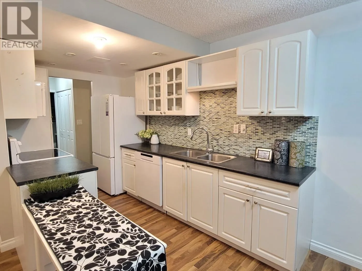 Great value in this 2-bedroom, 1-bath, 845 sq. ft. ground-floor condo! This practically layouted home features an open-concept kitchen with white cabinets and quality appliances. Enjoy easy-care laminate flooring in the kitchen and main living areas, with cozy carpeting in the living room. Both bedrooms are bright,generously sized, and the covered balcony is perfect for a BBQ. Stay comfortable year-round with a built-in wall air conditioner. The well-maintained building features vinyl windows, a dedicated storage locker, and convenient public laundry on each floor. Strata fees include heat and hot water. Conveniently located-just a short walk to transit, shopping, parks, the library, and the rec center! (id:27476)