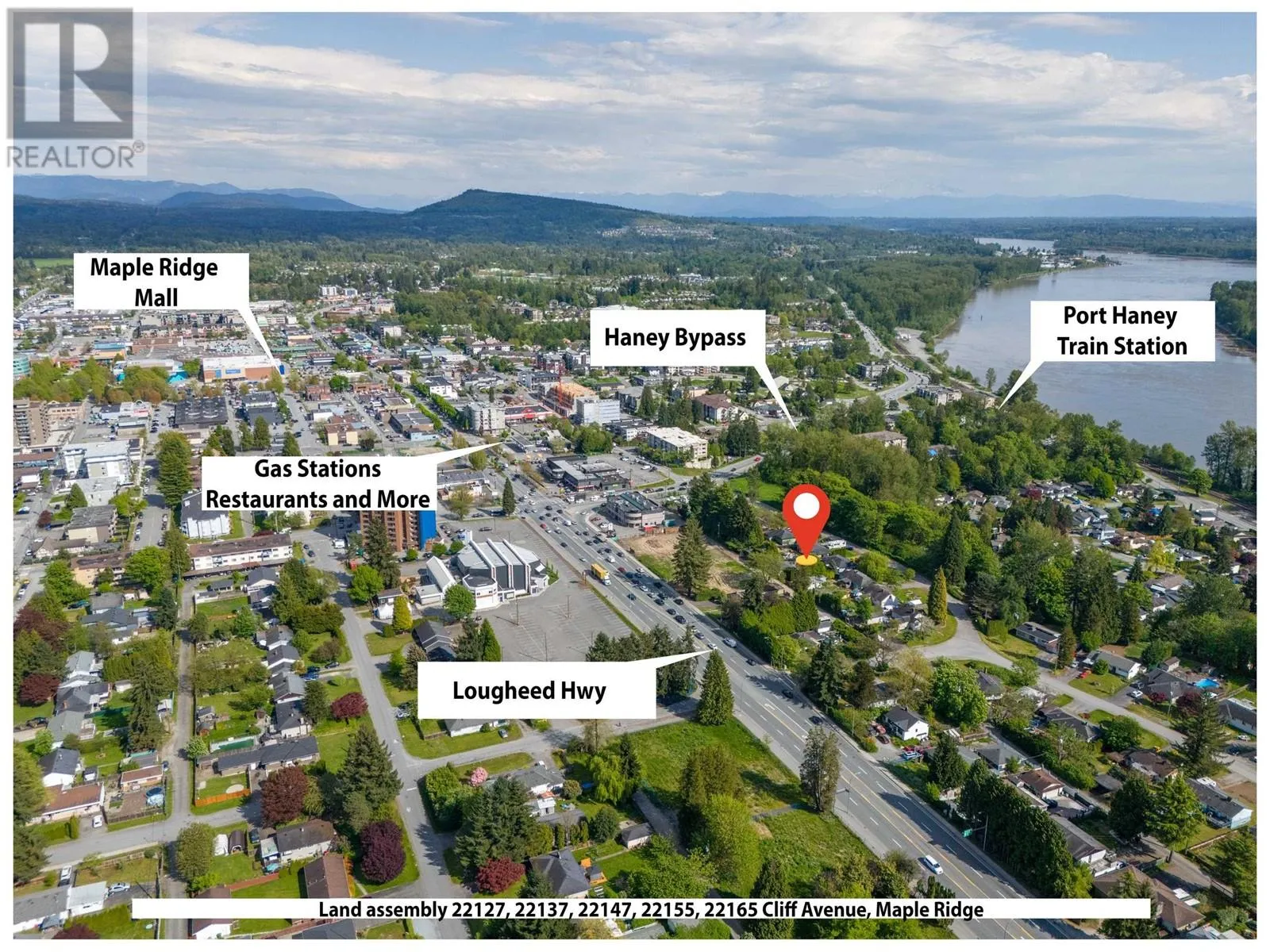 LAND ASSEMBLY in downtown Maple Ridge! Recent OCP amendment supports Low Rise Apartments 4-6 stories. Located within the Lougheed Transit Corridor and just outside the outer of the Transit Oriented Area. FSR up to 2.5 (includes bonus density) and all service at lot line or nearby. Situated on a quiet dead-end street, with lane access and the top floors will have unobstructed views of the Fraser River! Only steps from the West Coast Express, downtown Haney which includes shopping, restaurants, recreation and more! To be sold as a package with 22127, 22147, 22155 and 22165 Cliff Ave. Package price $9,999,500. Private showings only! Do NOT walk on the properties without an appointment. (id:27476)