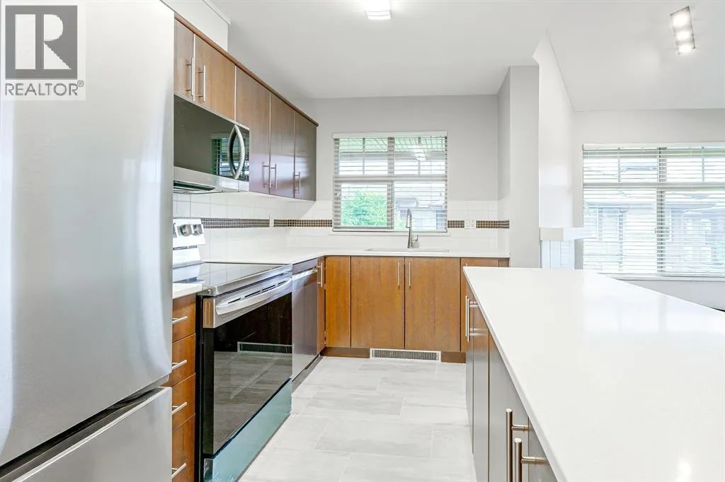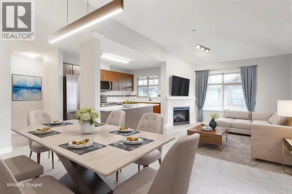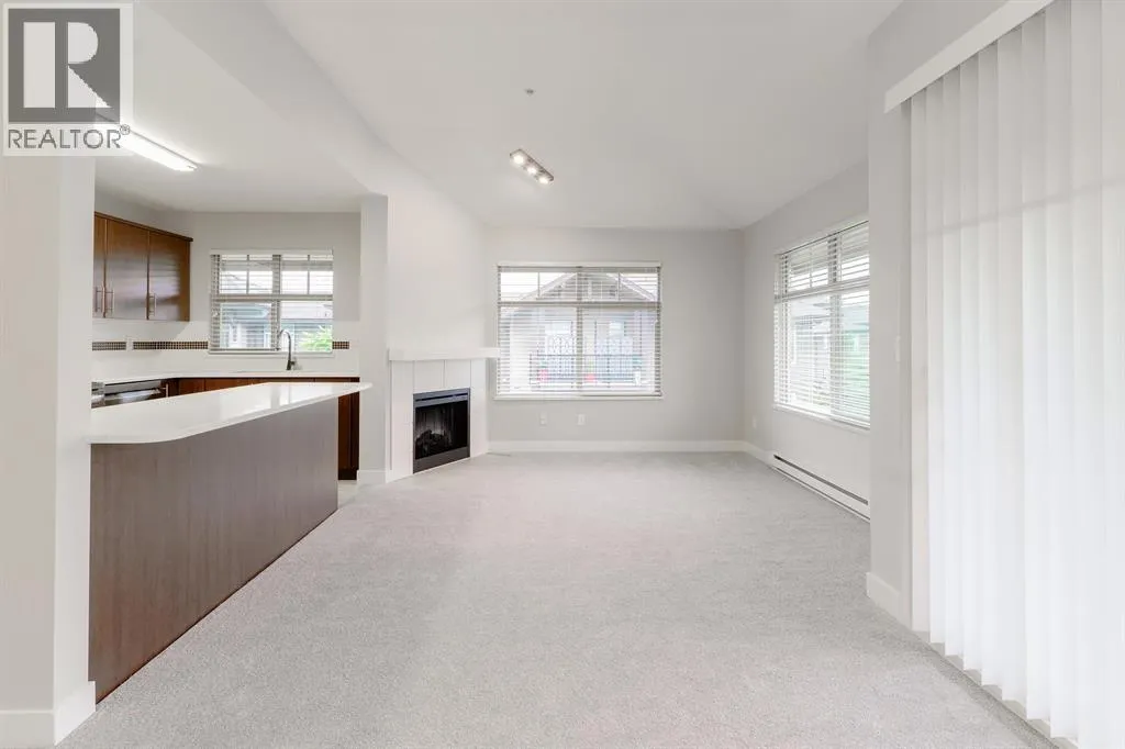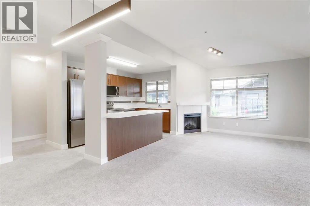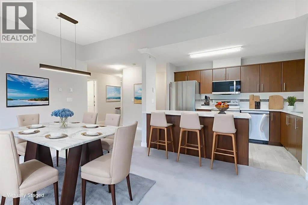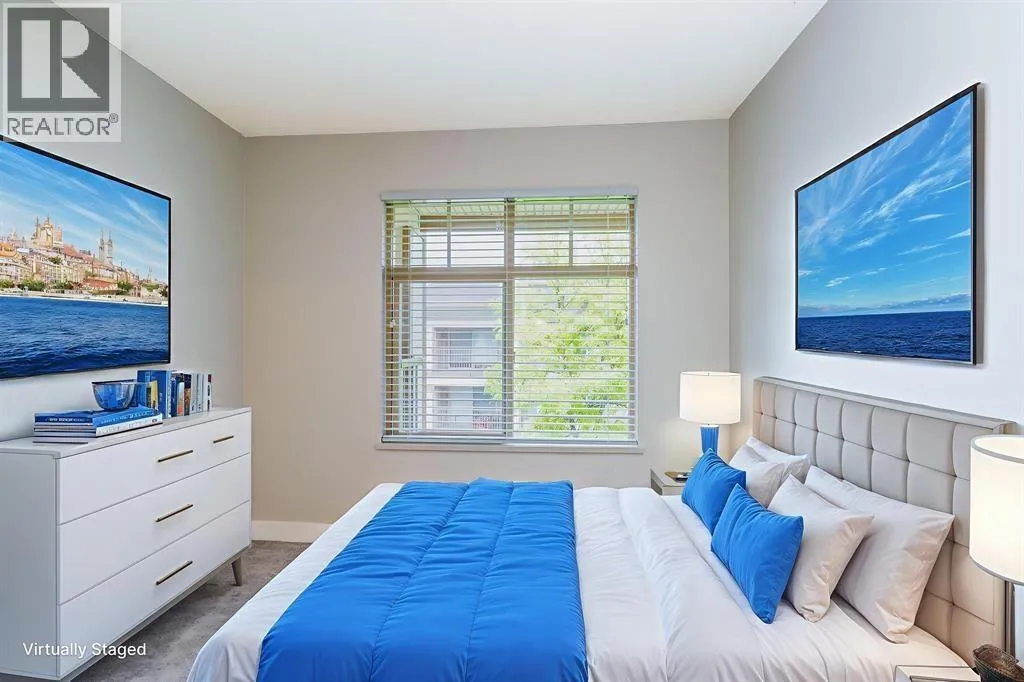 Welcome to Urbano-this top-floor corner unit offers over 930 square ft of beautifully updated living space. Step into a bright, open layout with vaulted ceilings and large windows that fill the home with natural light. The renovated kitchen shines with new quartz counters, an undermount sink, stylish faucet, new lighting, and four stainless steel appliances-perfect for cooking and entertaining. The spacious living and dining areas flow seamlessly, with new flooring and fresh paint throughout. Two generous bedrooms are thoughtfully separated for privacy, alongside two full bathrooms and a versatile den ideal for a home office. Includes two side by side parking stalls in a well-managed, pet-friendly building. All just steps to shopping, dining, transit, and more. (id:27476)