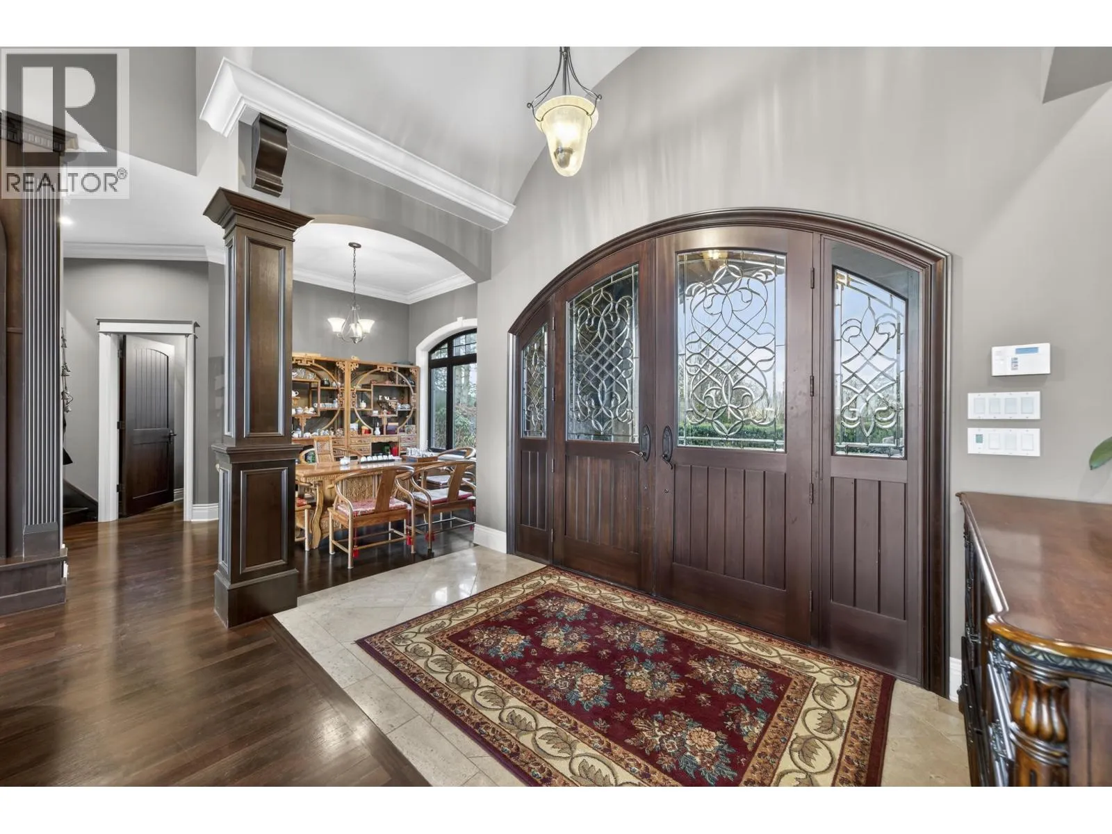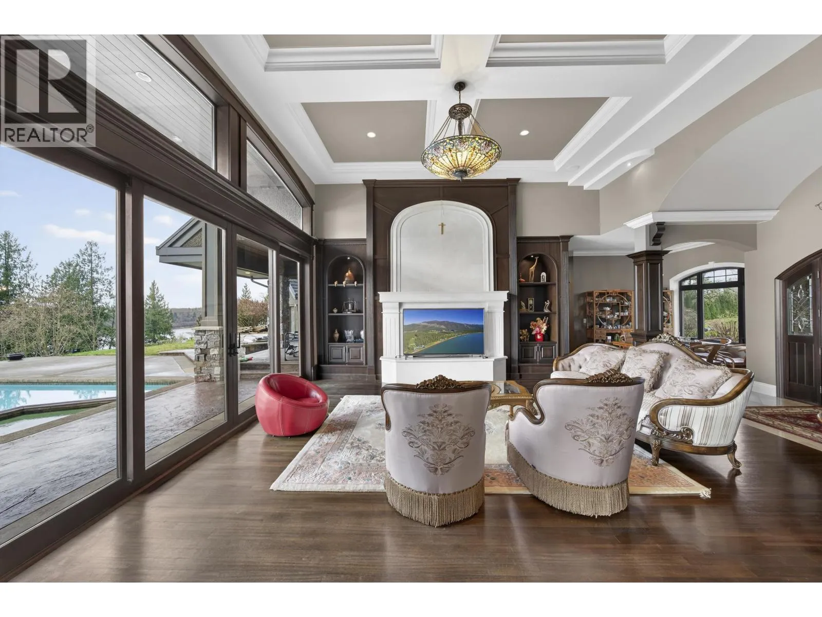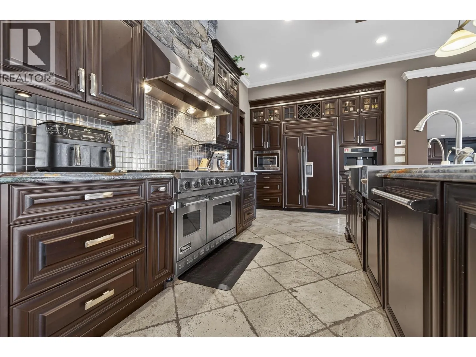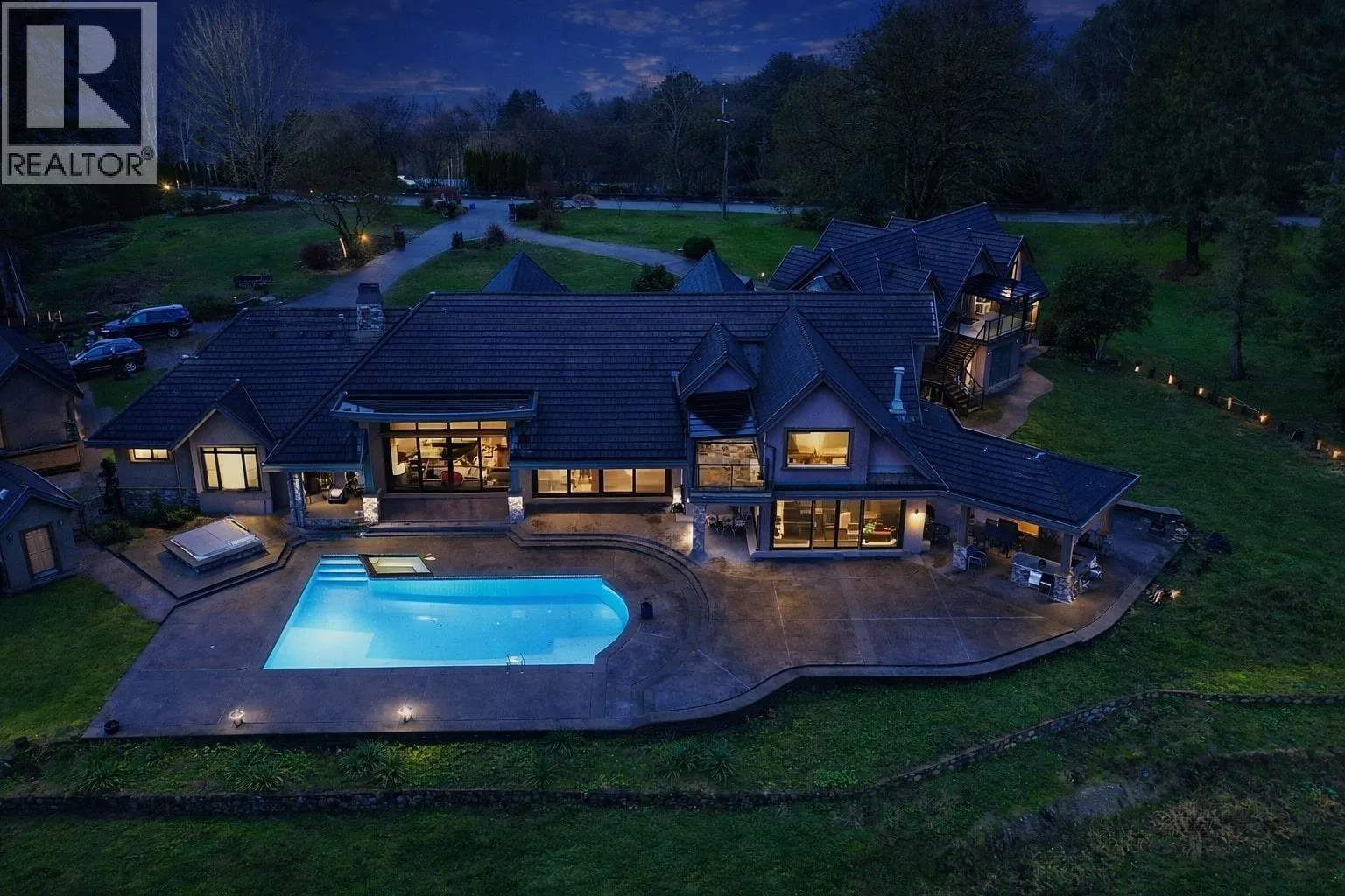 WATERFRONT PROPERTY - Set on approximately 2.5 acres with panoramic views of the Fraser River and surrounding mountains, this French-inspired estate offers over 7,300 sq.ft. of refined living. The home features four bedrooms, a den, and six bathrooms. Main living areas flow into a gourmet kitchen and butler's pantry with Spanish tile flooring, Italian blue marble countertops, a Viking professional six-burner gas cooktop with dual ovens, Sub-Zero refrigerator, and Miele dishwasher and coffee system. The main-floor primary suite offers walk-out access to the pool and hot tub, a walk-in closet, and spa-inspired ensuite. A triple garage with high ceilings includes a suite. Manicured grounds feature a terrace, pool, outdoor kitchen, covered lounge - ideal for entertaining. (id:27476)