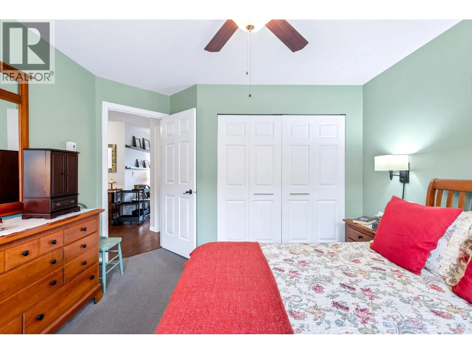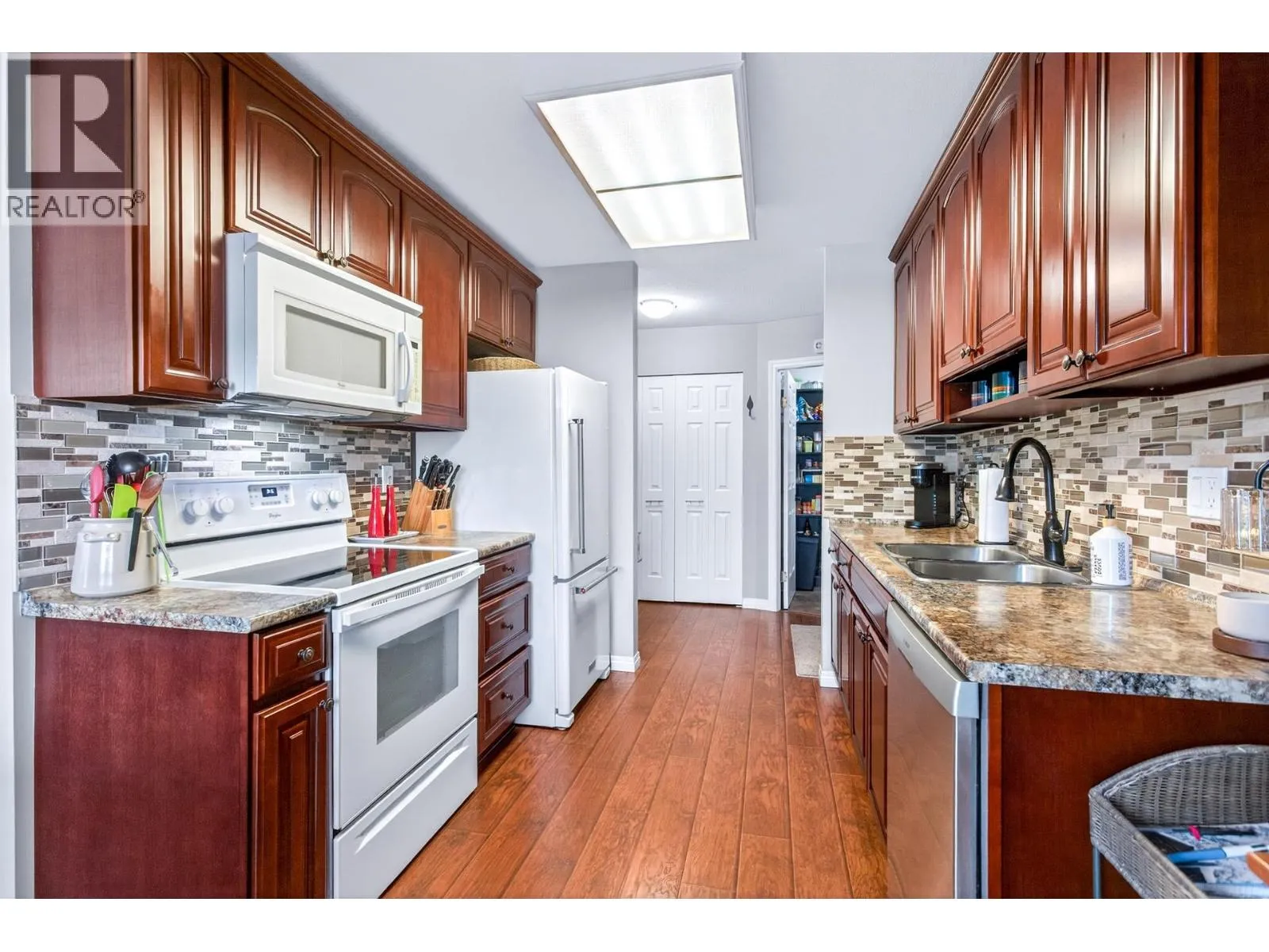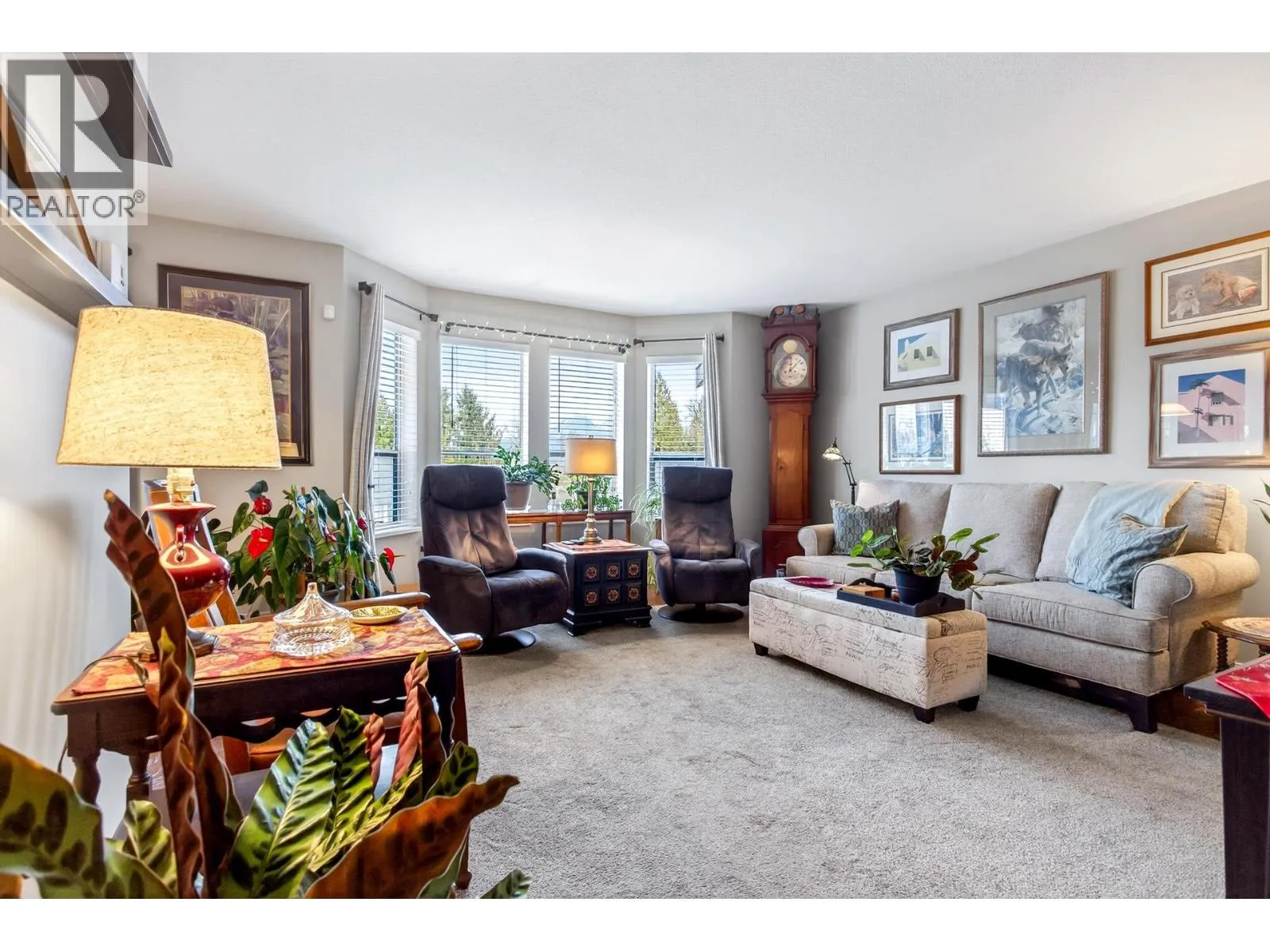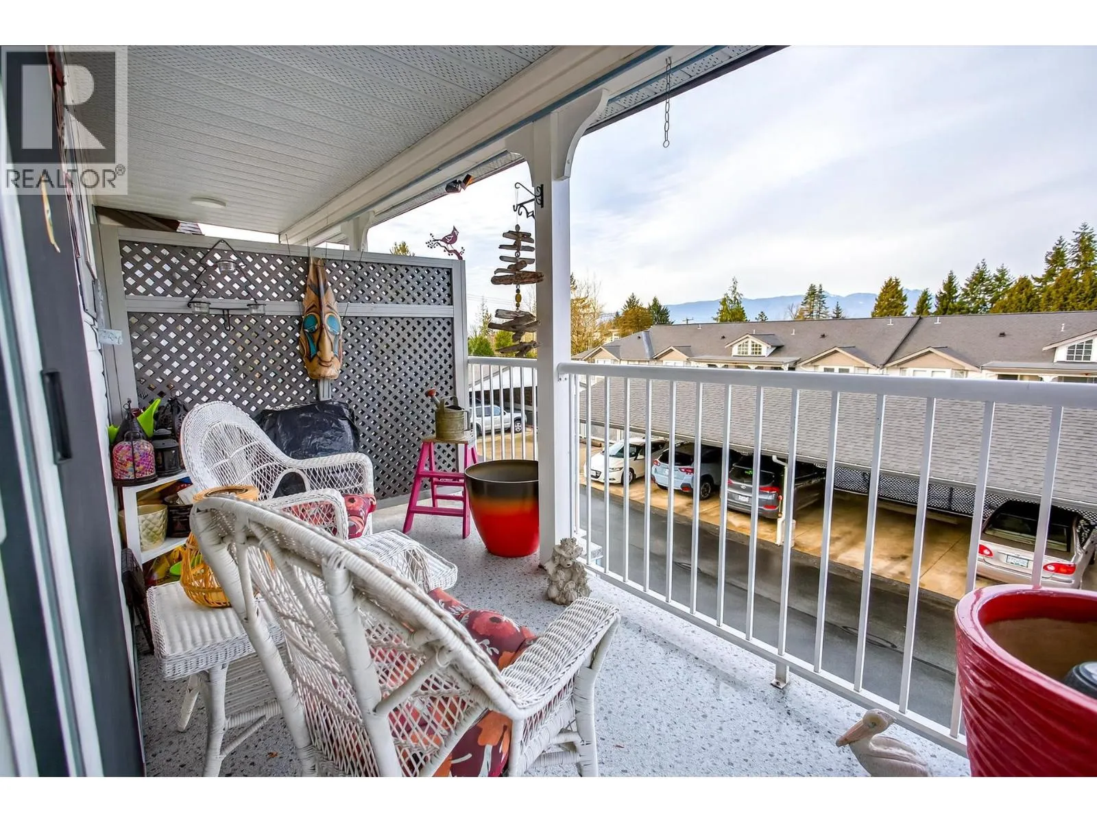 Charming north-facing two-bedroom upper unit with stunning mountain views. This well-maintained home features a fully updated bathroom with a spacious walk-in shower, along with updated flooring and appliances throughout the years. The functional layout offers excellent separation between bedrooms and living space, ideal for privacy and comfort. Includes a generous sized primary bedroom and second bedroom with its own private south-facing balcony. A well-appointed galley kitchen with adjoining eating area opens to a fully covered patio. YES, 2 covered balconies-one for the views and one for the sun! Includes a massive storage room/pantry, new hot water tank, 1 parking stall, RV parking options, and a well-managed strata with a 12-year-old roof and healthy CRF! A pleasure to View! (id:27476)