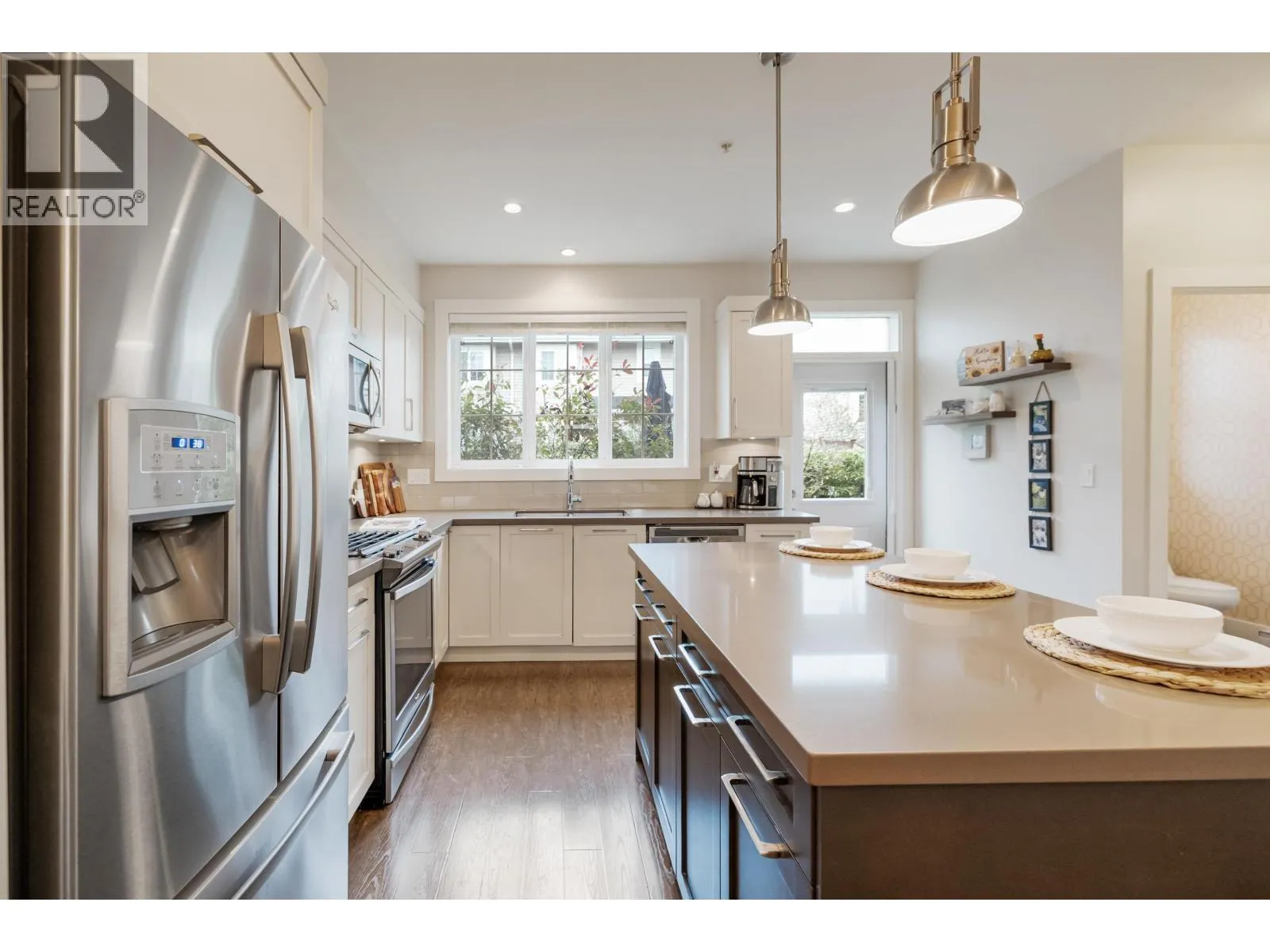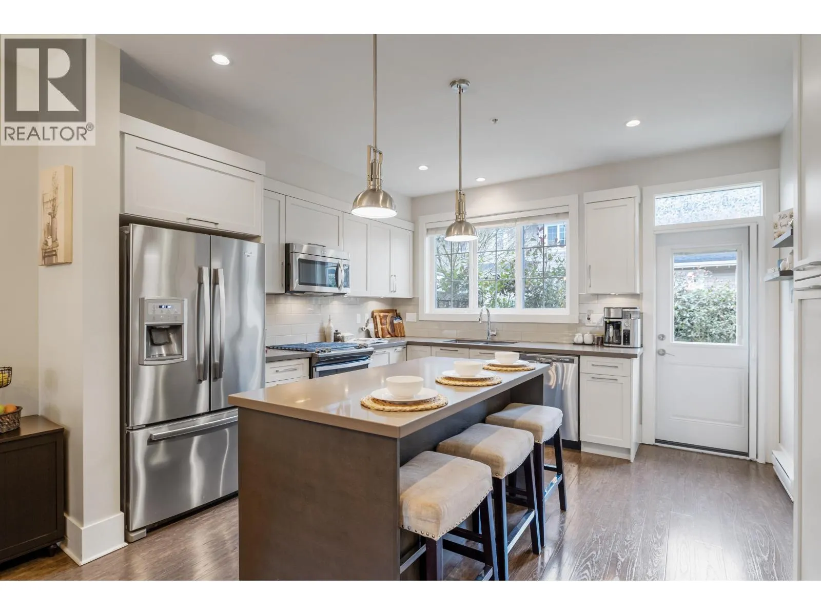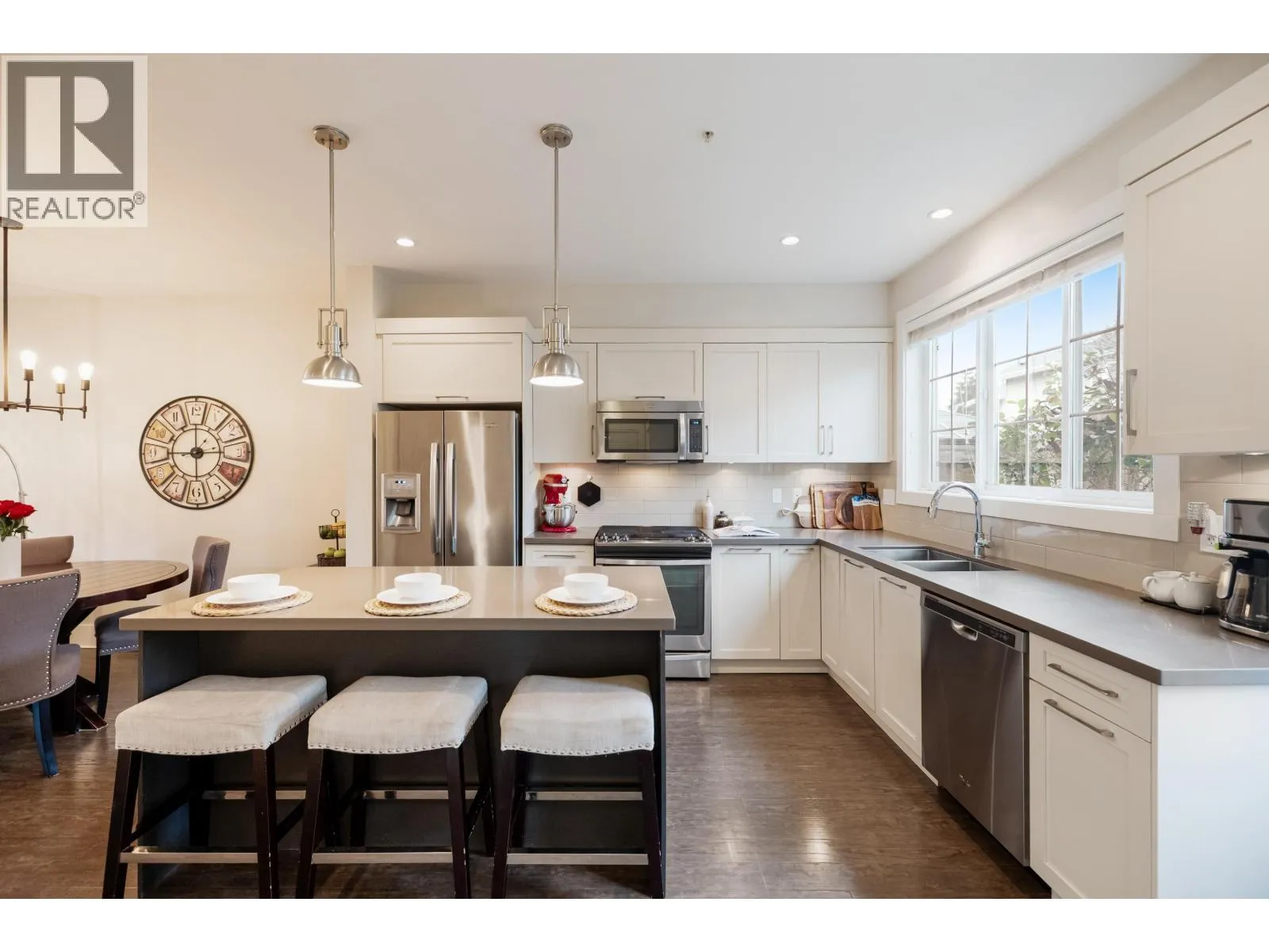 TWO STOREY LIVING in sought after Village Green! This corner unit is perfect for entertaining, and the bright spacious open concept layout gives you that warm inviting feels the moment you walk through the door. Featuring 9-foot ceilings, a spacious kitchen with quartz counters, gas stove and an oversized island that overlooks the living and dining room makes this home ideal for social gatherings! Upstairs you´ll find 3 bedrooms, 2 baths and full-size laundry. The primary bedroom hosts an ensuite with an oversized shower with glass door and dual sinks. Other features include private driveway, storage, large fully fenced backyard with patio, gas hookup for the BBQ and a playground for kids. Located close to schools, transit and shopping. Open House Feb. 14, Sat 1-3 PM (id:27476)