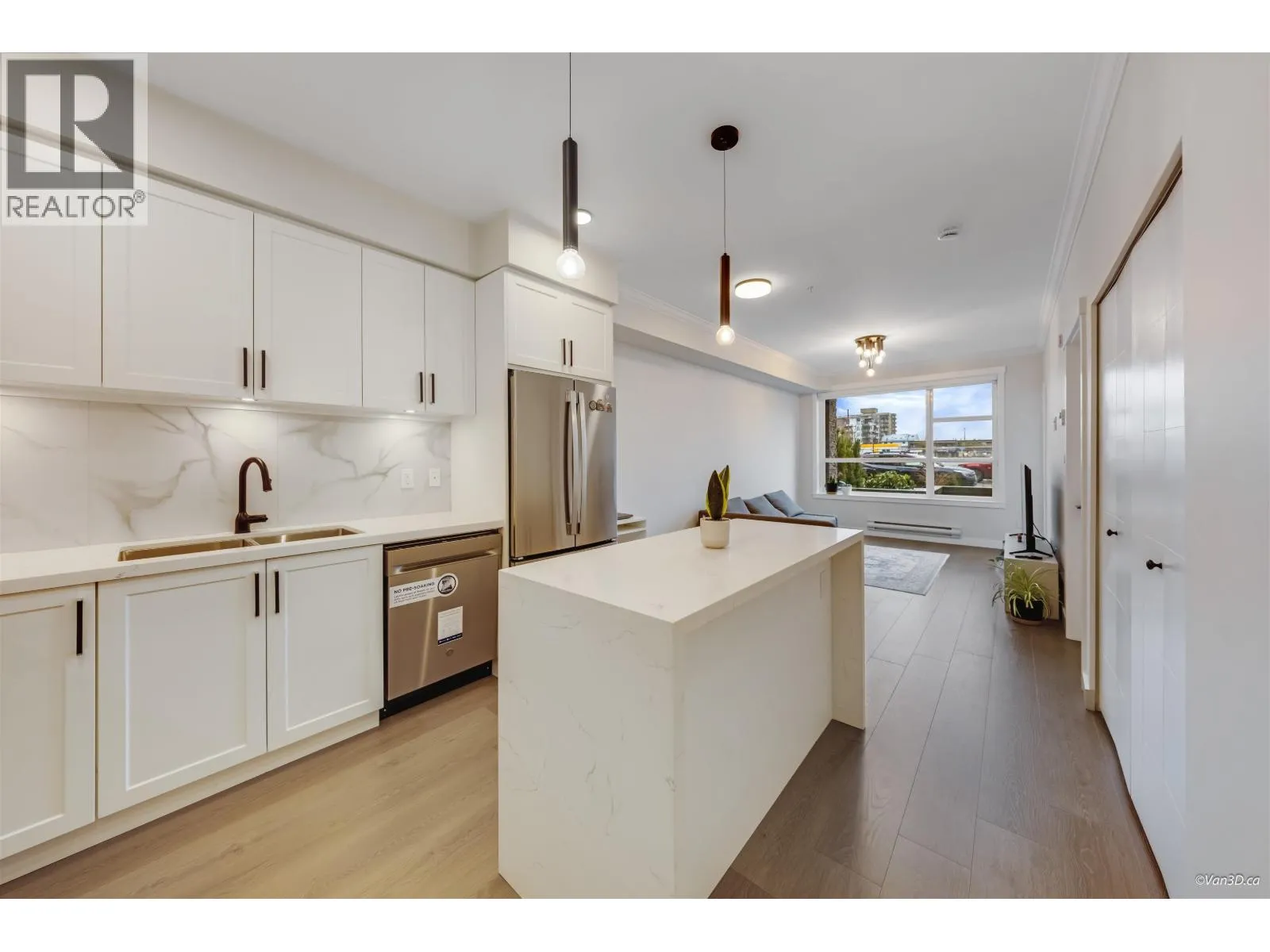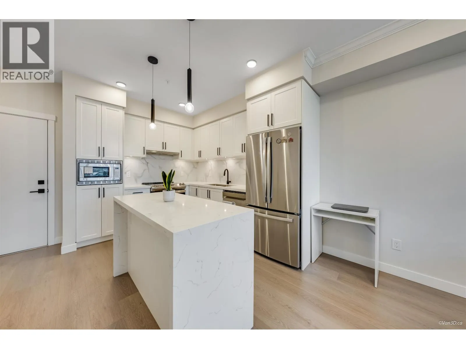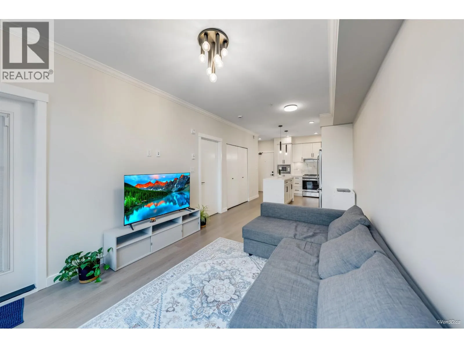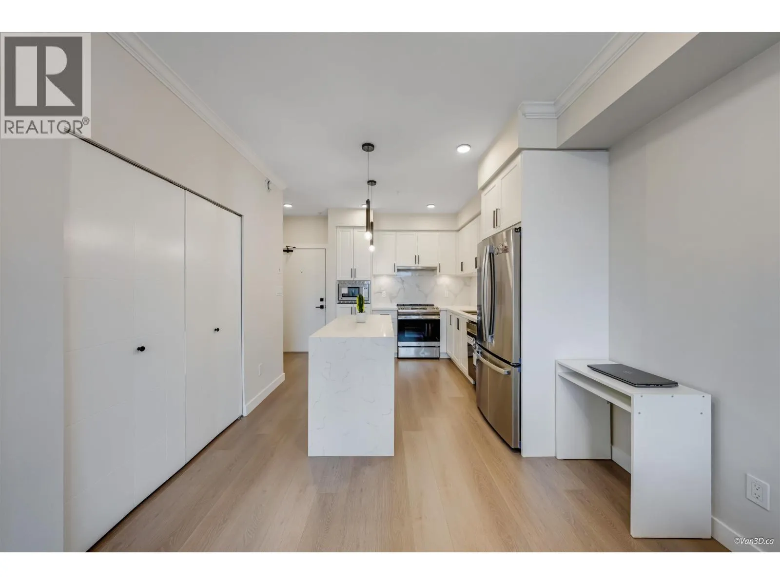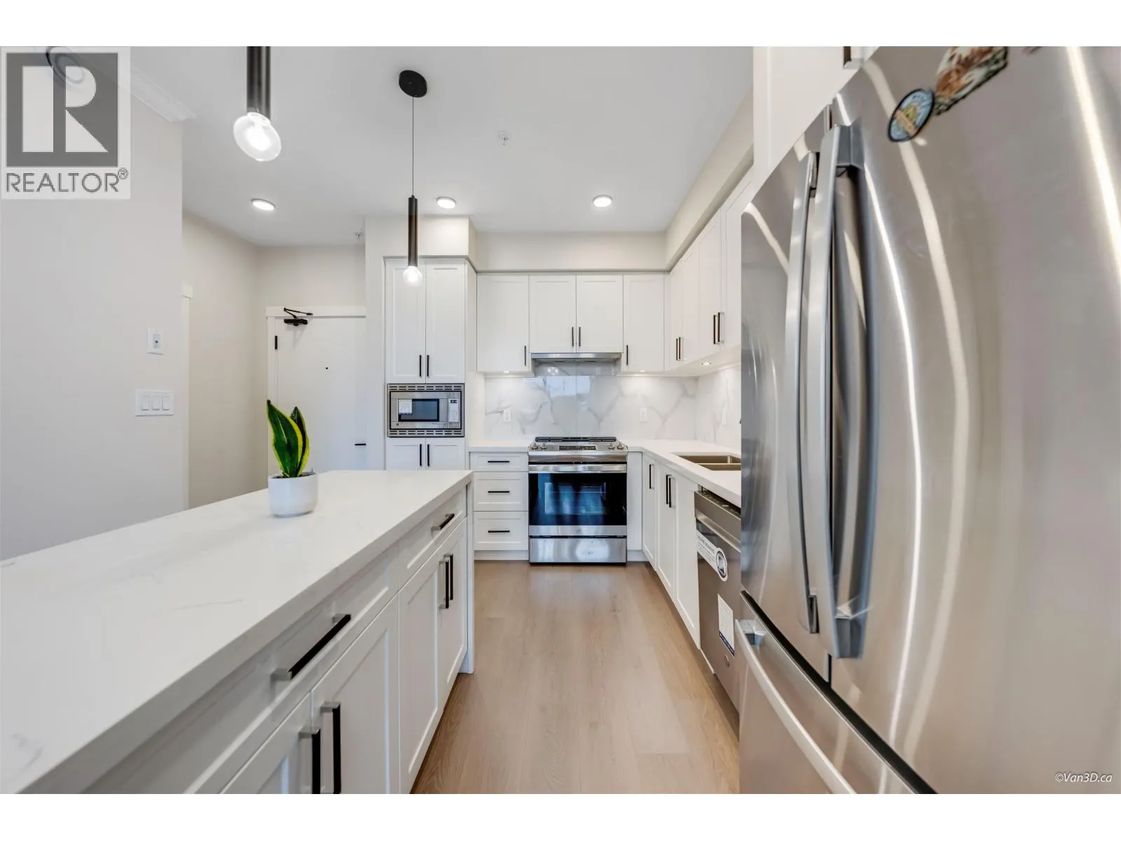 Enjoy new construction without the GST! This bright 1-bedroom, 1-bathroom home offers a modern open-concept layout featuring white quartz countertops, Italian tile backsplash, stainless steel appliances, durable laminate flooring, and soft carpet in the bedroom. Roughed-in for A/C for added comfort. Residents enjoy premium amenities including a fully equipped gym, yoga studio, social lounge, rooftop outdoor spaces, play area, and game room. Includes 1 parking stall and 1 bike/storage locker conveniently located nearby. Centrally located near shopping, transit, schools, parks, medical services, and Downtown. The ground-floor patio with a private street gate provides extra outdoor space and easy access for dog walking. Easy to show with prior notice (id:27476)