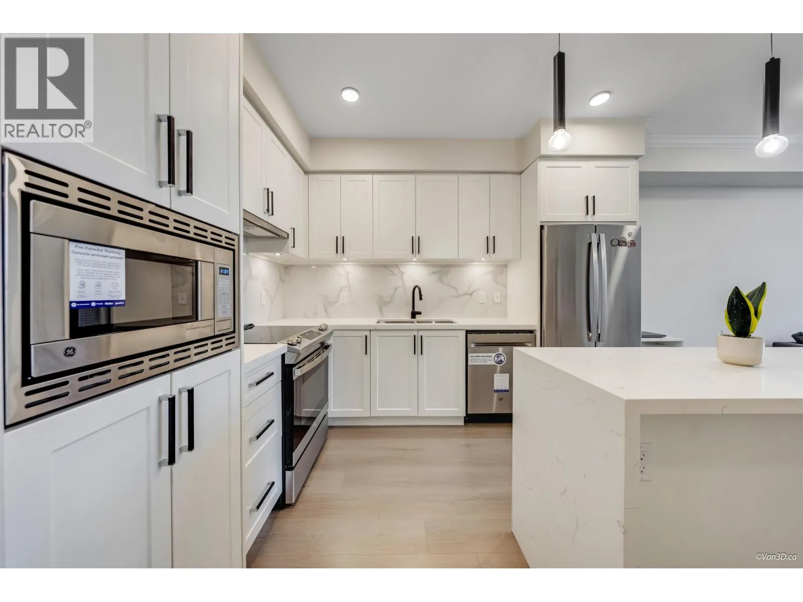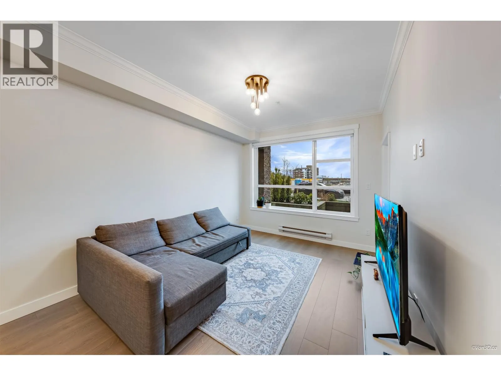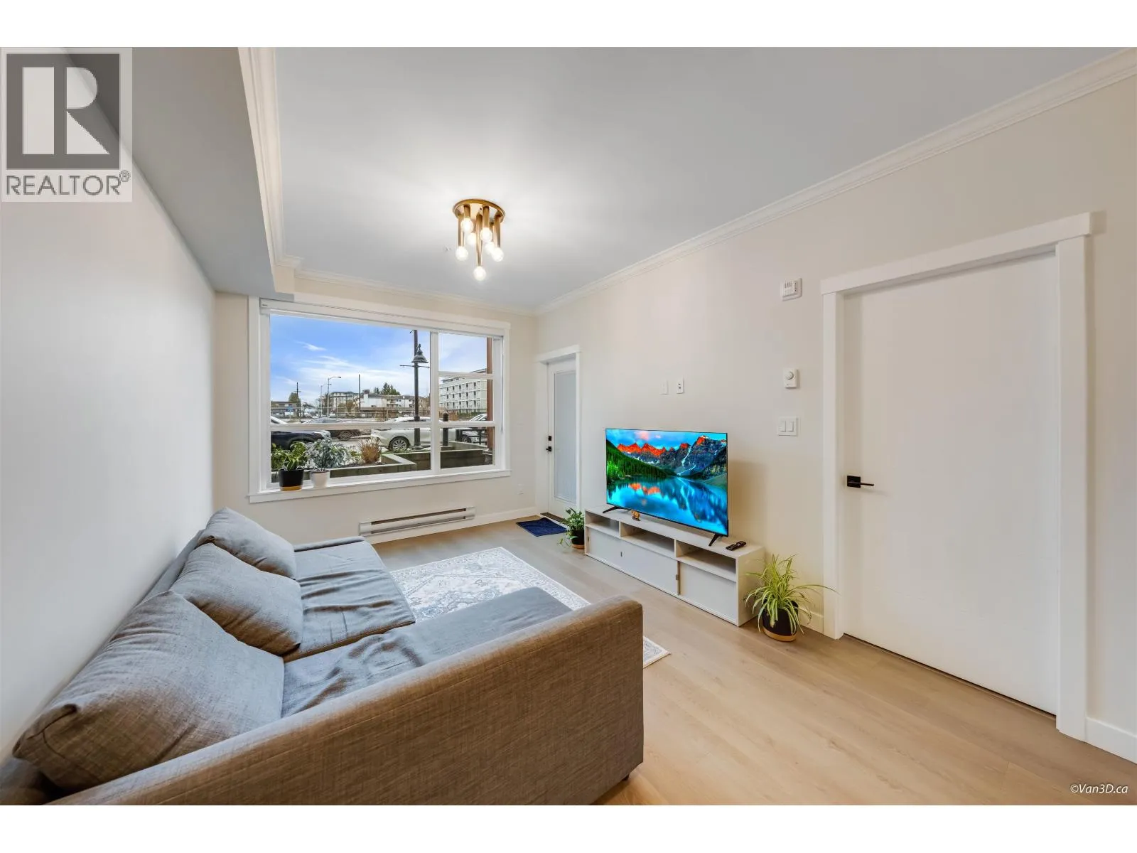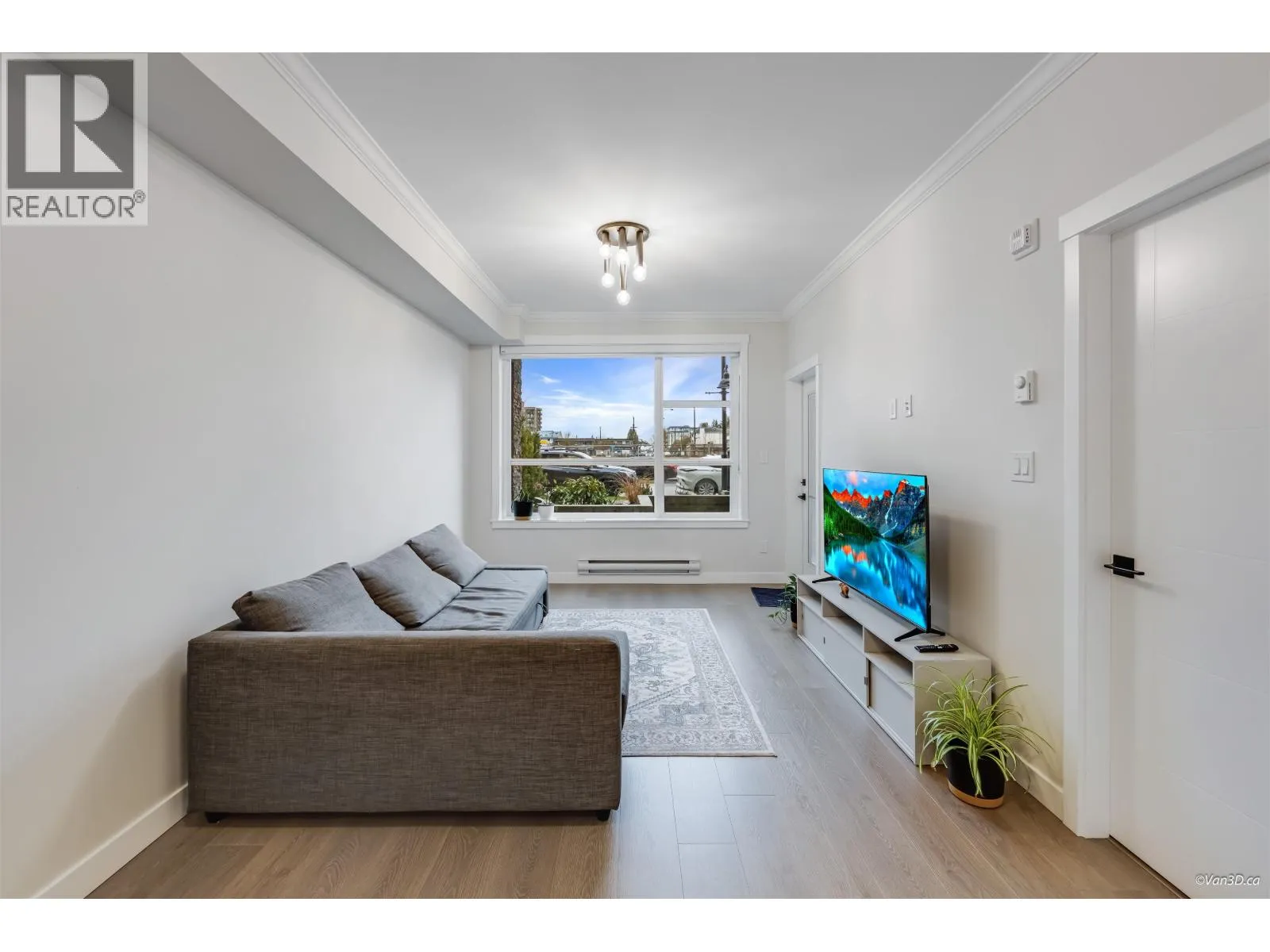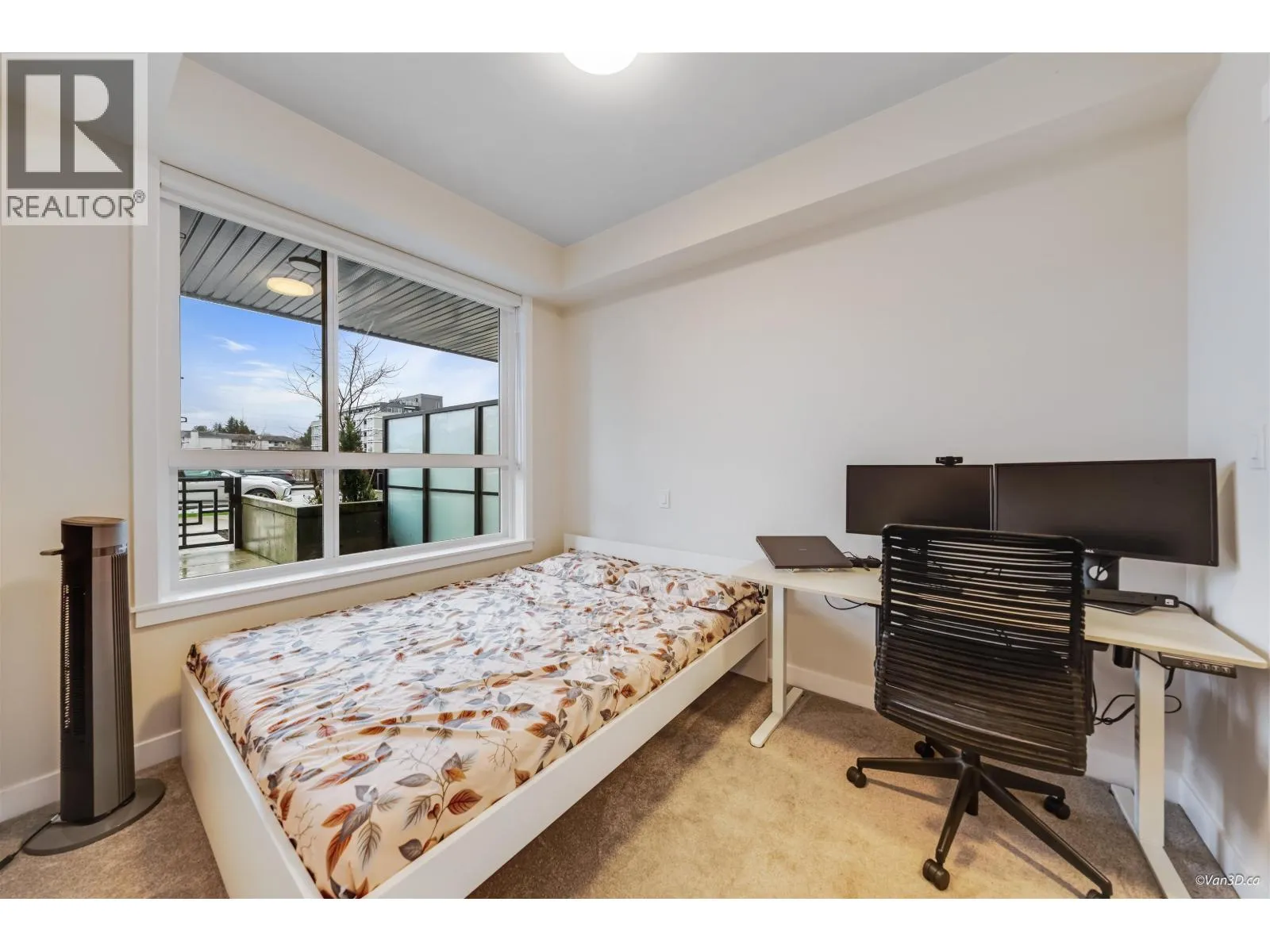 Enjoy new construction without the GST! This bright 1-bedroom, 1-bathroom home offers a modern open-concept layout featuring white quartz countertops, Italian tile backsplash, stainless steel appliances, durable laminate flooring, and soft carpet in the bedroom. Roughed-in for A/C for added comfort. Residents enjoy premium amenities including a fully equipped gym, yoga studio, social lounge, rooftop outdoor spaces, play area, and game room. Includes 1 parking stall and 1 bike/storage locker conveniently located nearby. Centrally located near shopping, transit, schools, parks, medical services, and Downtown. The ground-floor patio with a private street gate provides extra outdoor space and easy access for dog walking. Easy to show with prior notice (id:27476)