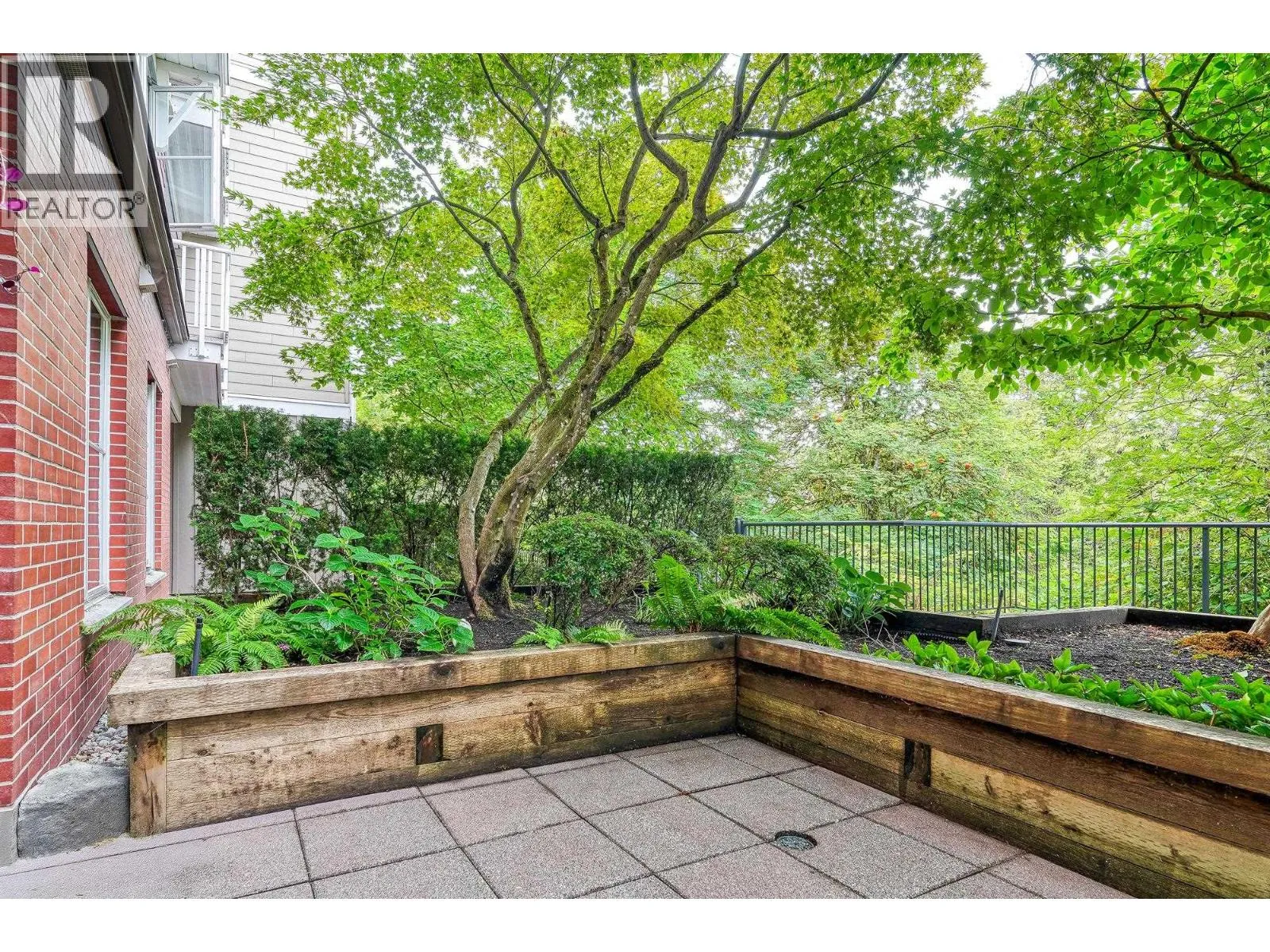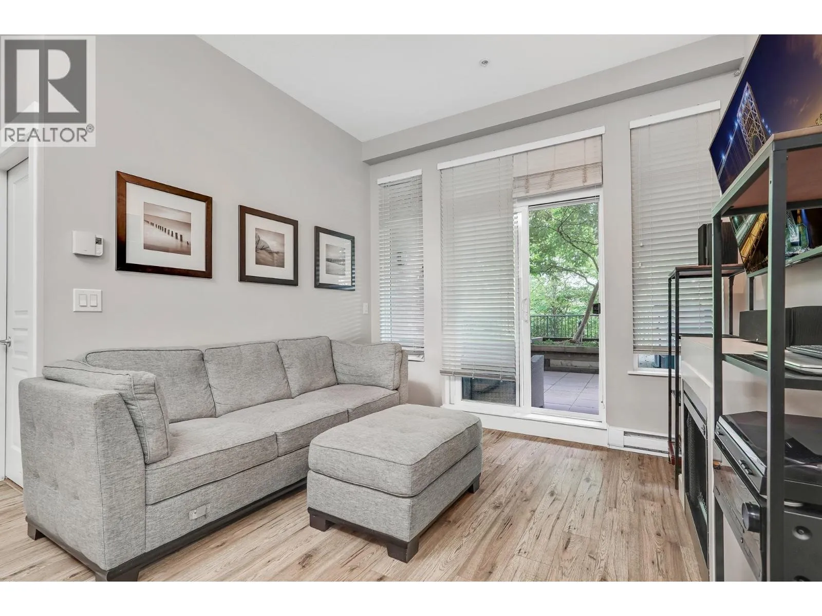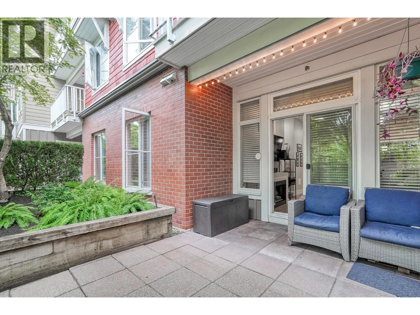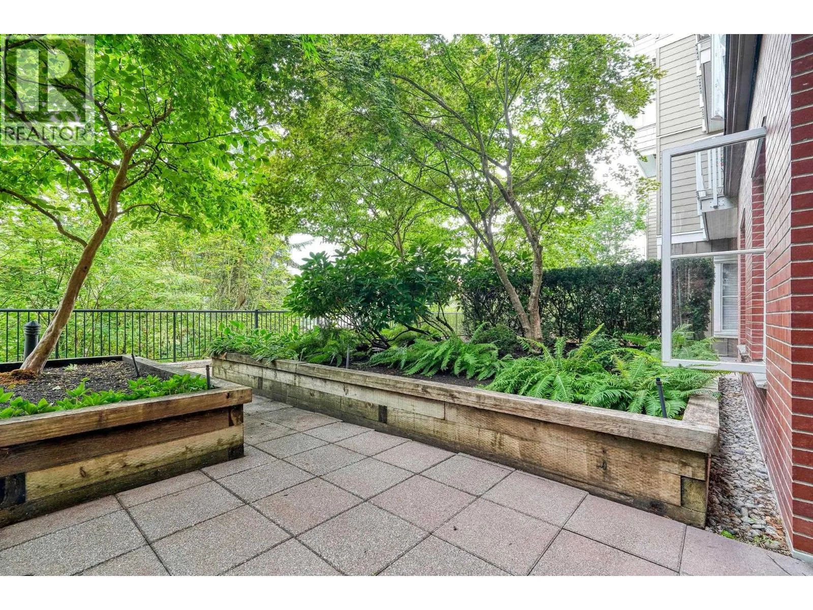 Soaring 10´ ceilings and sleek modern finishes set the tone in this beautifully designed 2 Bed + 2 Bath + Large Den home. The bright north-facing ground-level layout opens to a patio with tranquil green space views, your own peaceful escape and the perfect spot for morning coffee. The large den offers incredible flexibility as a home office, nursery, or bonus room. Enjoy the convenience of in-suite laundry, 2 secure parking stalls, and a pet- and rental-friendly building. All just steps to shops, cafés, and transit-comfort, style, and location all in one. This one has it all, book your showing today. 2 pets allowed* (id:27476)