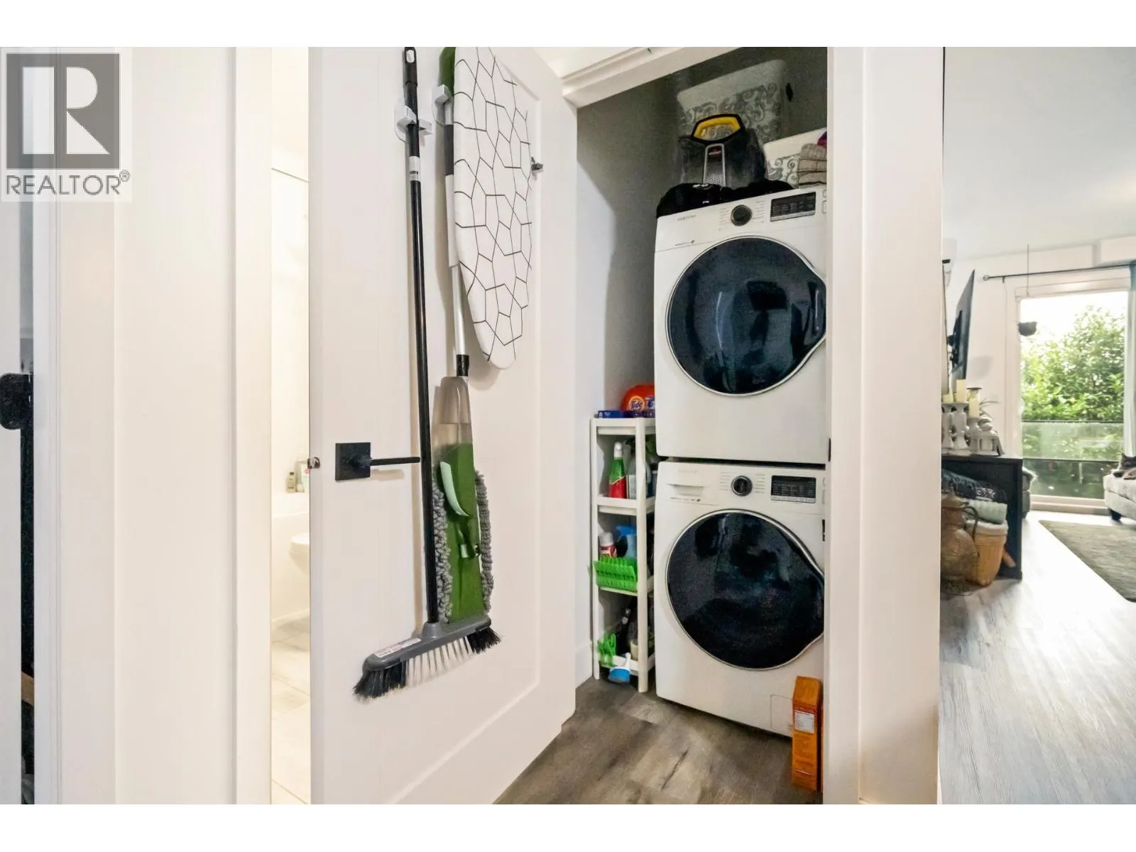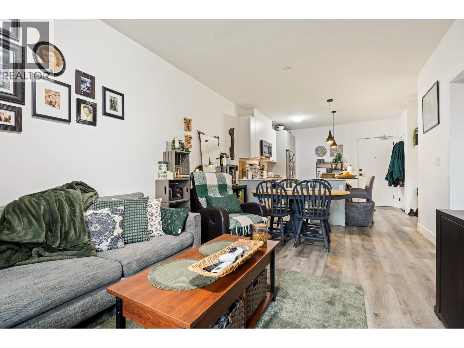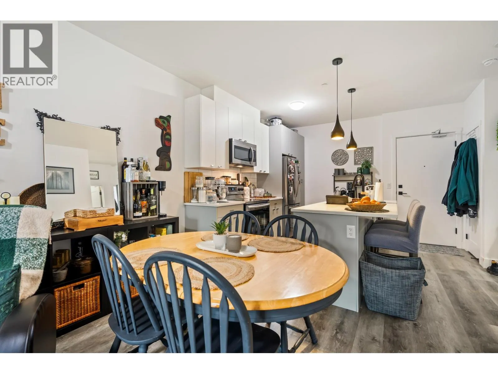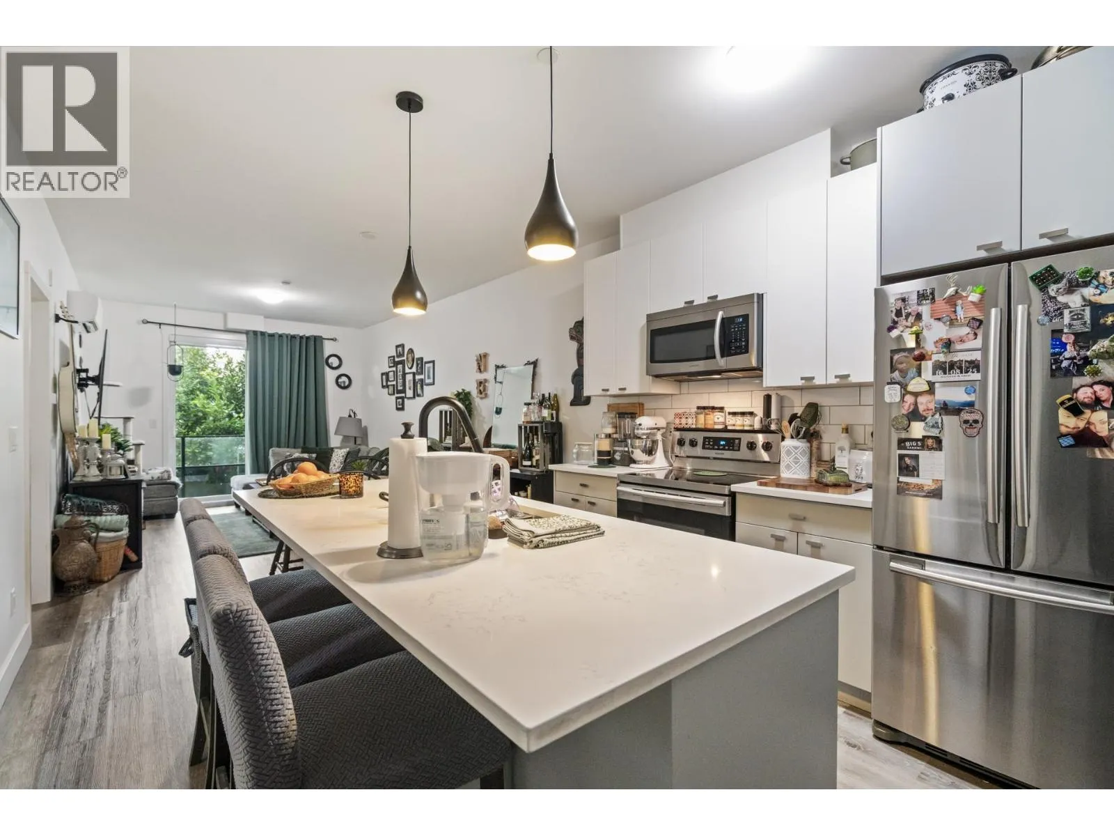 Welcome to The 222 Phase 2. This modern 1 bed + den, 2 bath home offers a bright and functional layout with quality finishes throughout. The contemporary kitchen features a center island, white quartz countertops, two-tone white and grey cabinetry, and full-size stainless steel appliances. Vinyl laminate flooring, LED lighting, and an individually controlled heat pump with air conditioning provide comfort year-round. The spacious den easily works as a second bedroom or home office. The primary bedroom includes a spa-inspired ensuite with an oversized walk-in shower, while the second full bath features a tub. Enjoy eastern exposure with partial mountain views toward Golden Ears from your home. Located in a fully rainscreened building for added peace of mind. Includes 1 parking & 1 storage. (id:27476)