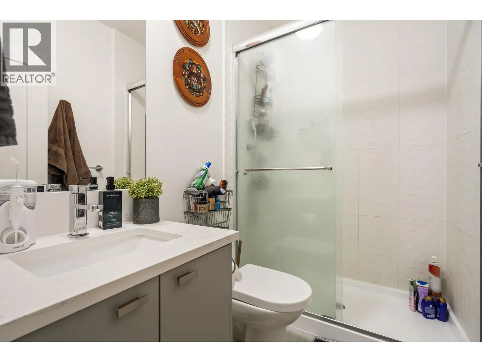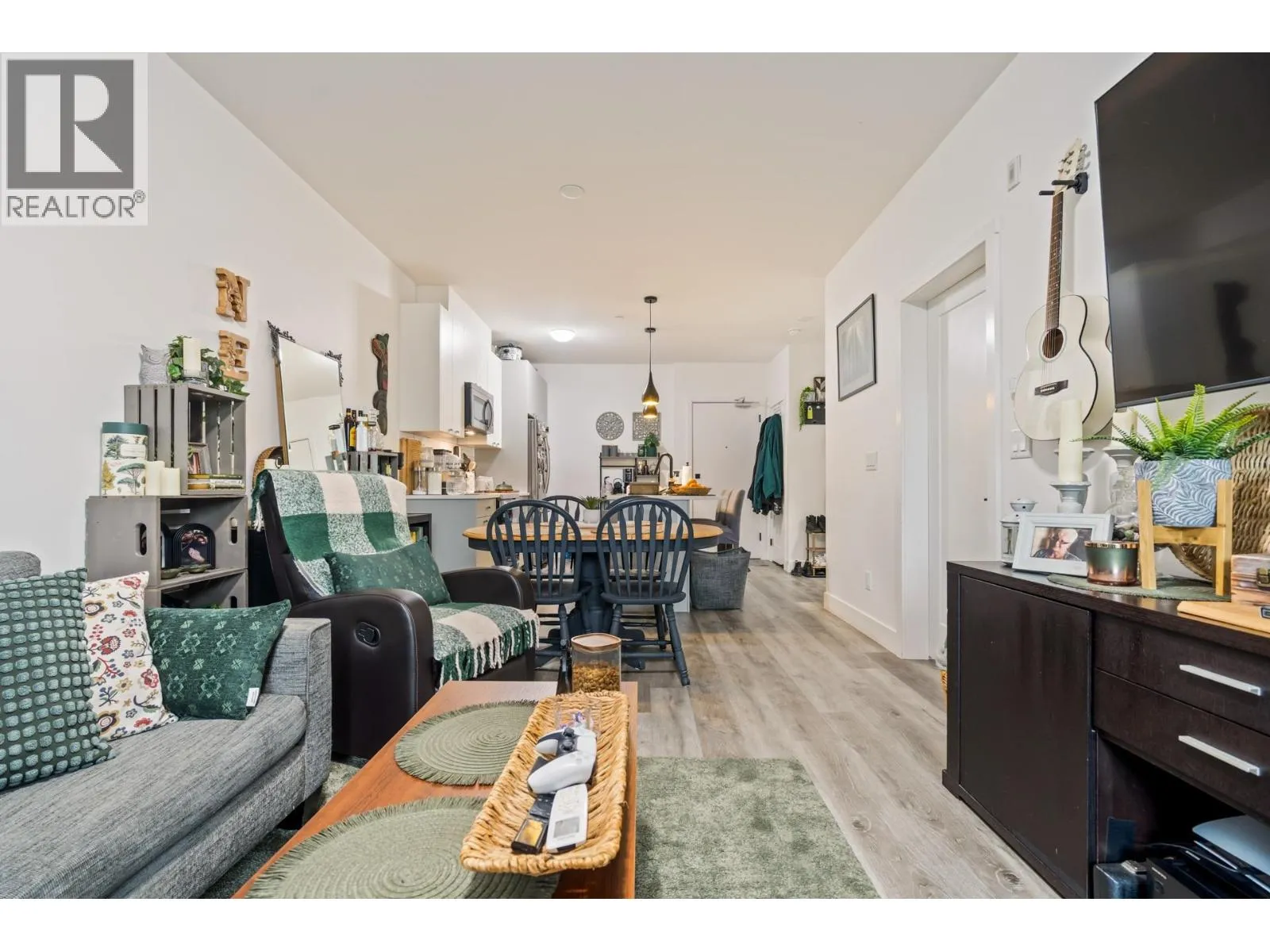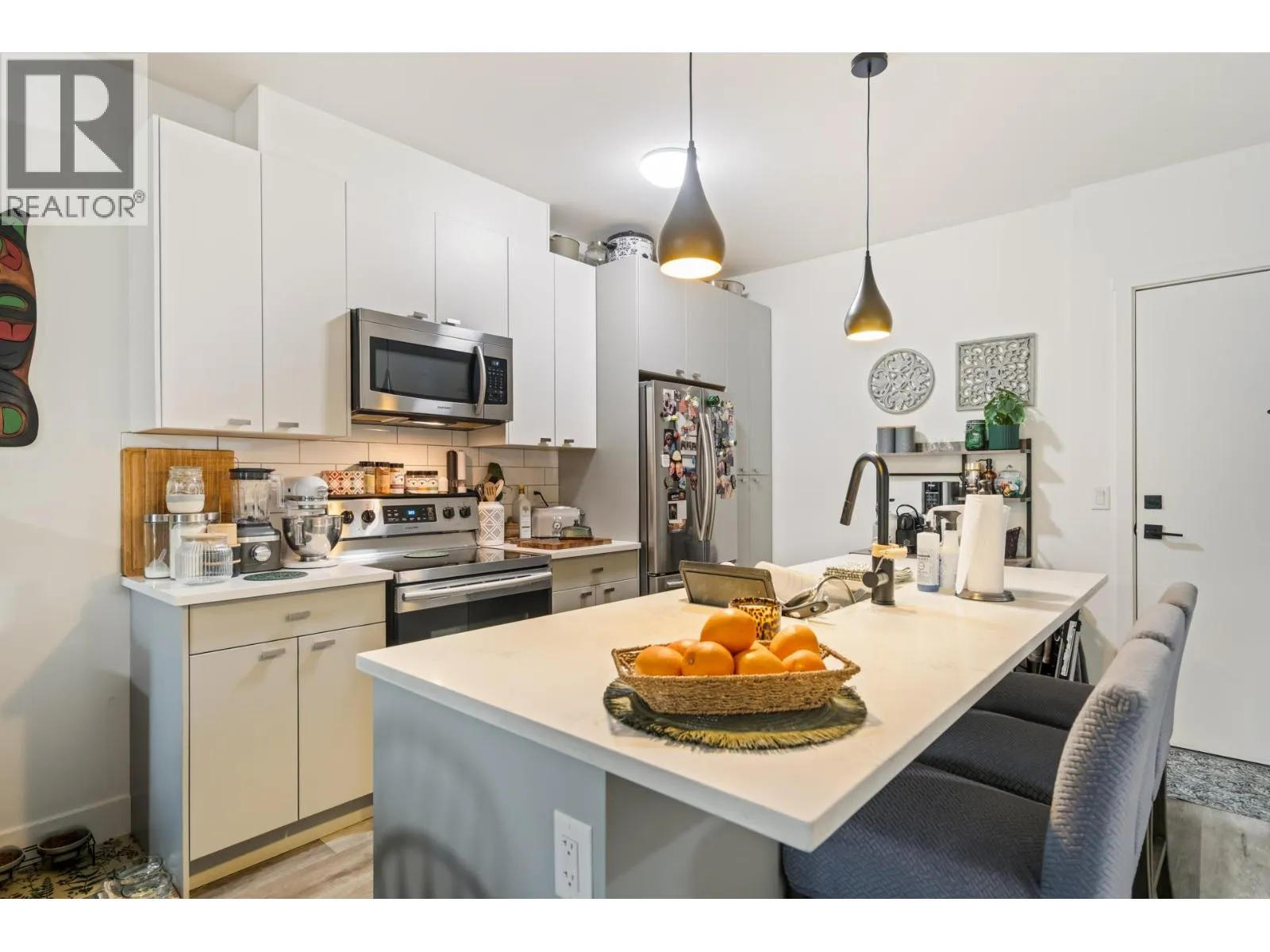 Welcome to The 222 Phase 2. This modern 1 bed + den, 2 bath home offers a bright and functional layout with quality finishes throughout. The contemporary kitchen features a center island, white quartz countertops, two-tone white and grey cabinetry, and full-size stainless steel appliances. Vinyl laminate flooring, LED lighting, and an individually controlled heat pump with air conditioning provide comfort year-round. The spacious den easily works as a second bedroom or home office. The primary bedroom includes a spa-inspired ensuite with an oversized walk-in shower, while the second full bath features a tub. Enjoy eastern exposure with partial mountain views toward Golden Ears from your home. Located in a fully rainscreened building for added peace of mind. Includes 1 parking & 1 storage. (id:27476)