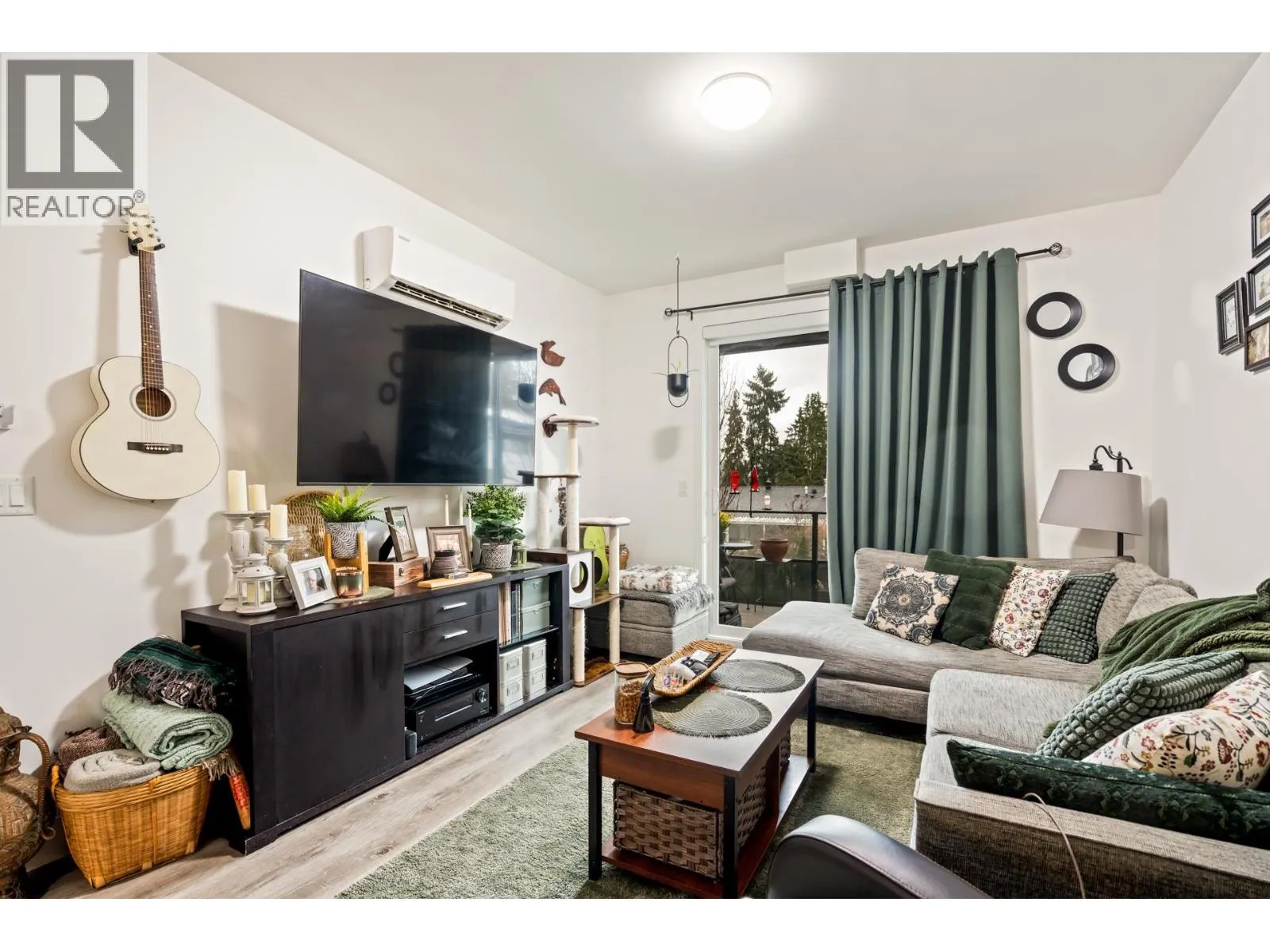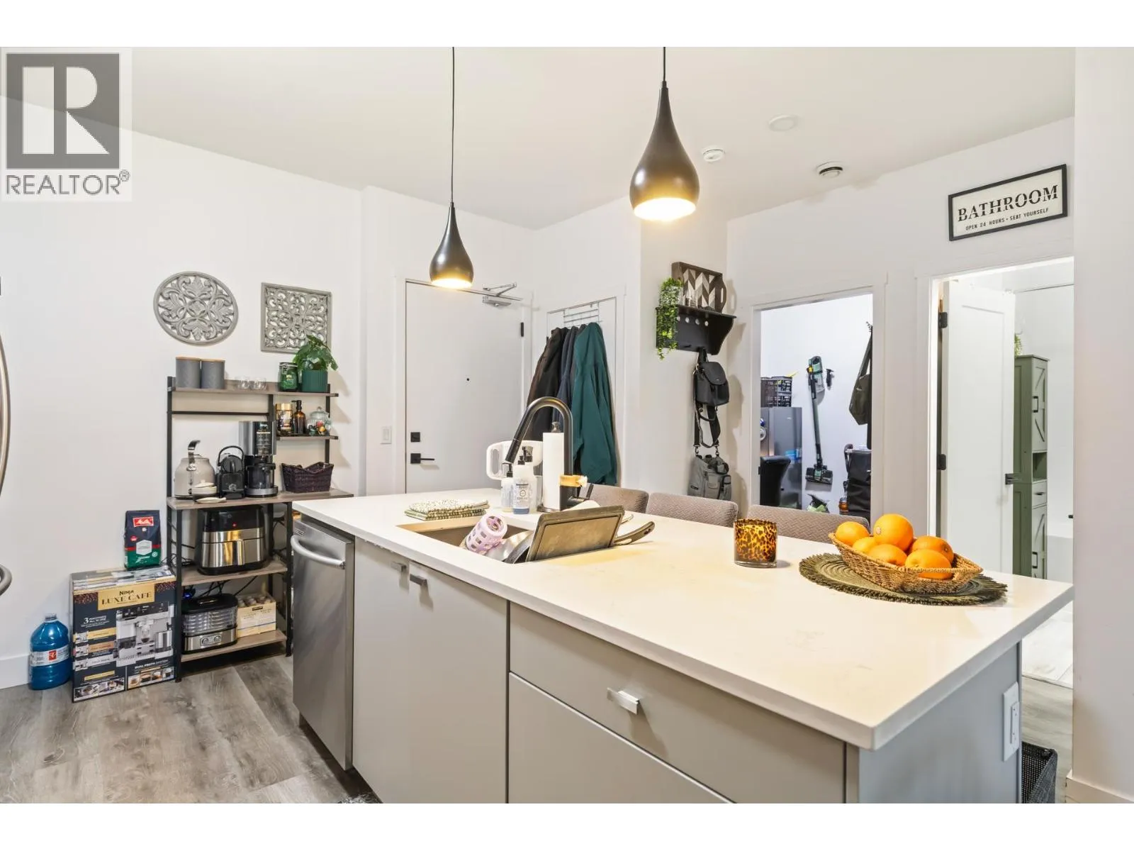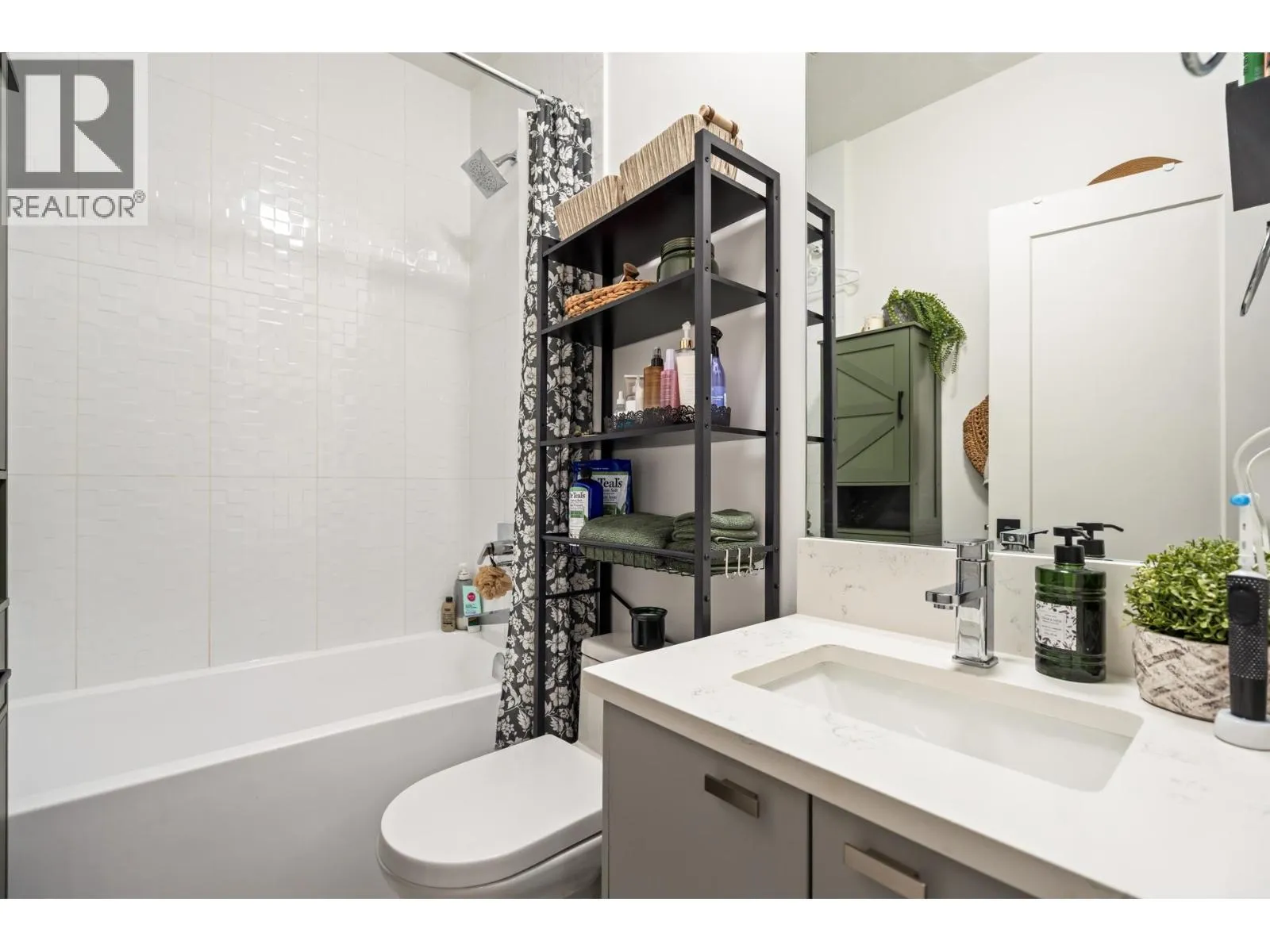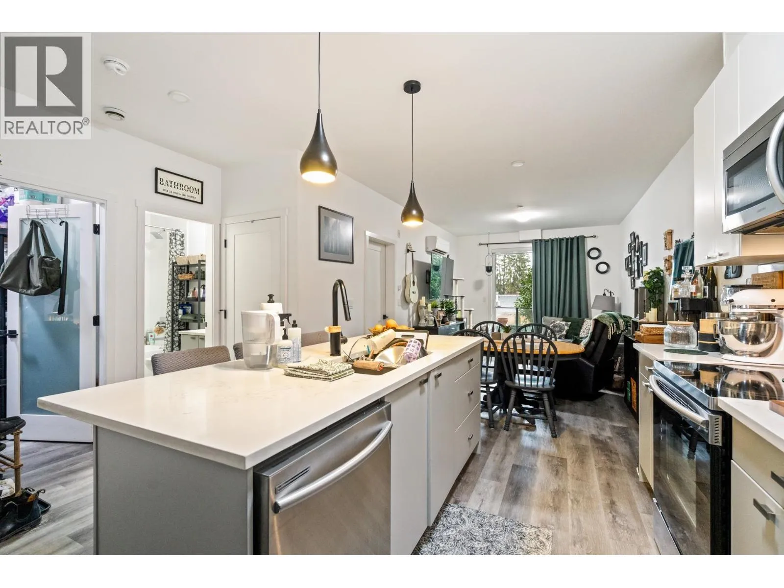 Welcome to The 222 Phase 2. This modern 1 bed + den, 2 bath home offers a bright and functional layout with quality finishes throughout. The contemporary kitchen features a center island, white quartz countertops, two-tone white and grey cabinetry, and full-size stainless steel appliances. Vinyl laminate flooring, LED lighting, and an individually controlled heat pump with air conditioning provide comfort year-round. The spacious den easily works as a second bedroom or home office. The primary bedroom includes a spa-inspired ensuite with an oversized walk-in shower, while the second full bath features a tub. Enjoy eastern exposure with partial mountain views toward Golden Ears from your home. Located in a fully rainscreened building for added peace of mind. Includes 1 parking & 1 storage. (id:27476)
