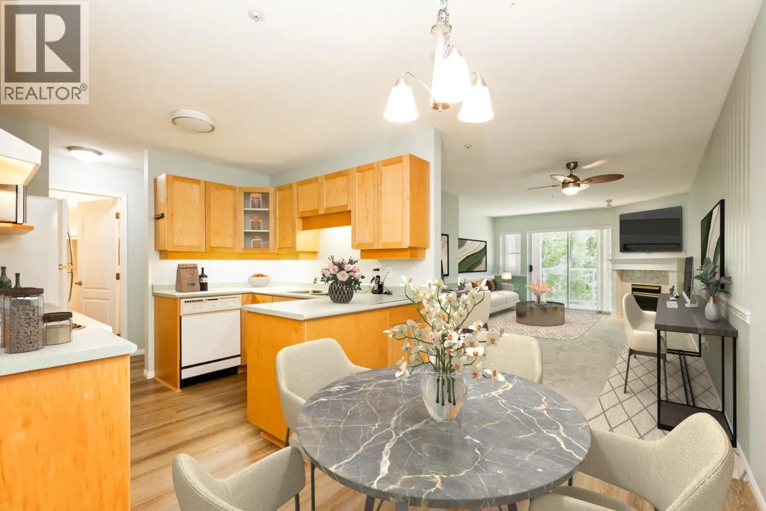 Tucked away in a serene setting, this bright and spacious 1 bed, 1 bath gem is beautifully maintained and move-in ready! You'll love the extra-large primary bedroom, oversized living room with cozy gas fireplace, and the generous deck overlooking a private & protected greenspace. The kitchen features solid maple cabinets and light-toned laminate flooring, perfect for everyday comfort. With tons of in-suite storage plus a separate locker, you´ll have space for everything. Just minutes from transit, shopping, restaurants, and downtown Maple Ridge. 1 parking included. Strata fee covers it ALL-management, insurance, gas, water, sewer, caretaker, garbage and snow removal! Don´t miss this peaceful retreat in a prime location! (id:27476)
