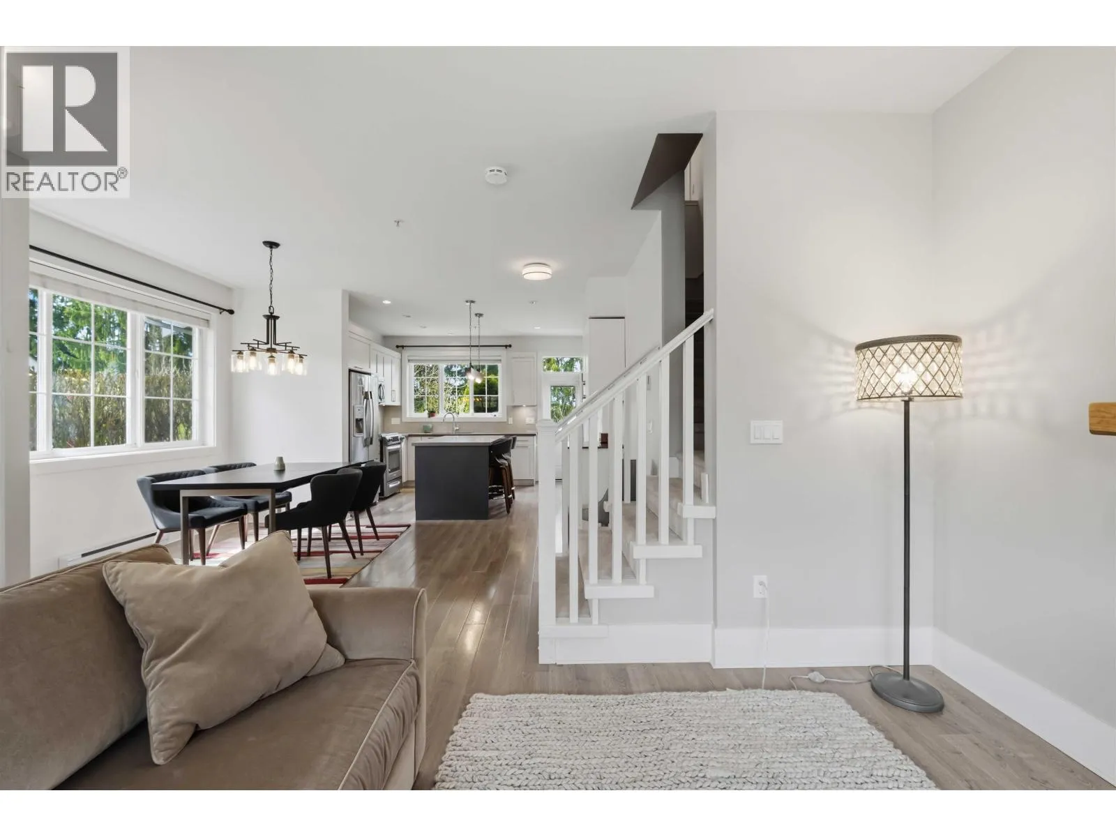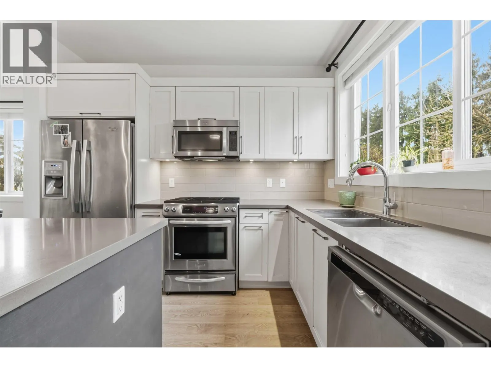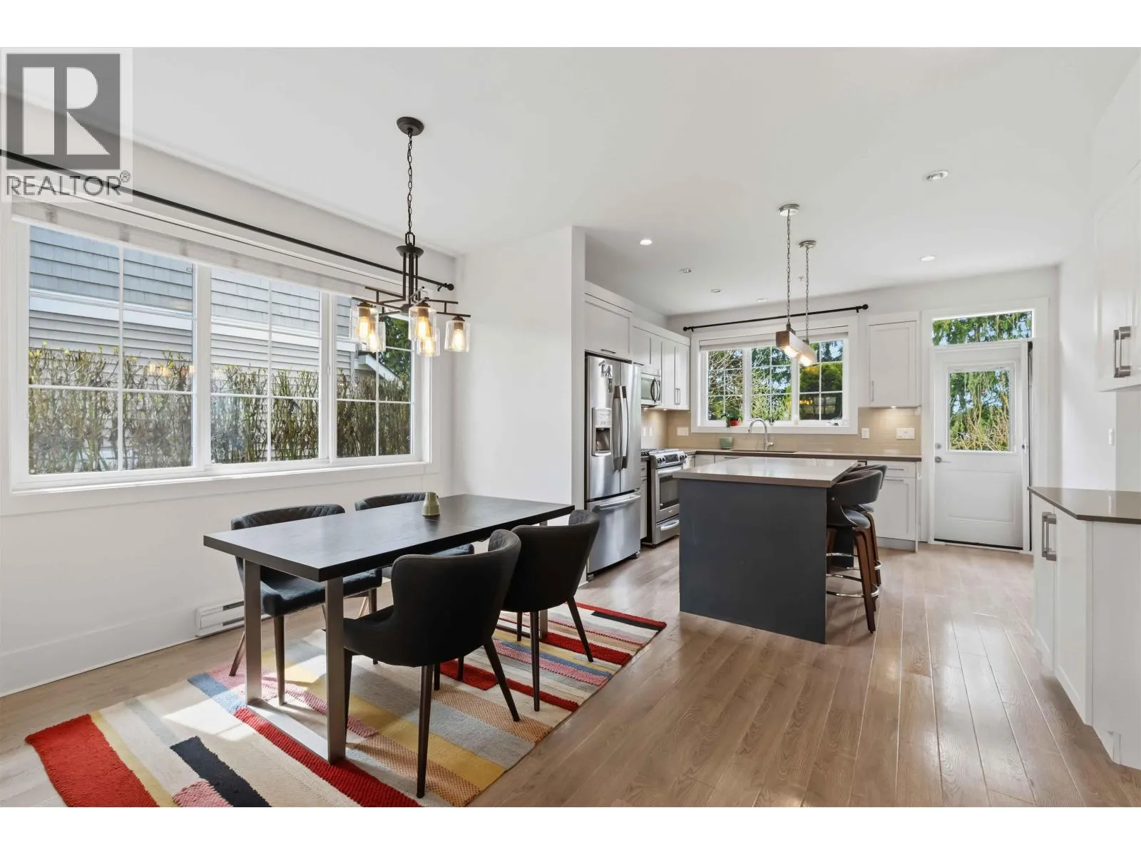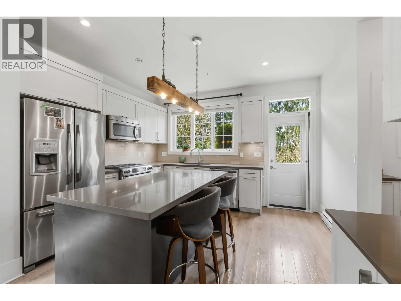 MODERN FINISHINGS, EVERYDAY CONVENIENCE, AND PEACEFUL TRANQUILITY! Gorgeous half duplex-style 3 bedroom, 2.5 bath townhome of approximately 1300 sqft in sought-after Village Green, backing onto treed space and agricultural ALR land. Fantastic main floor layout features a bright, gourmet shaker-style kitchen with ample cabinetry and quartz countertops, complete with island and stainless appliances. Spacious living rm with bonus free-standing gas fireplace for cozy evenings. 3 bdrms up incl spa-inspired primary with large windows and full ensuite. EV TESLA CHARGER INSTALLED! Enjoy treed views from the kitchen or while relaxing in the fenced yard or on the large west-facing patio with gas BBQ hook-up. Single car garage plus driveway. Close to schools, shopping, and transportation! THE COMPLETE PACKAGE (id:27476)