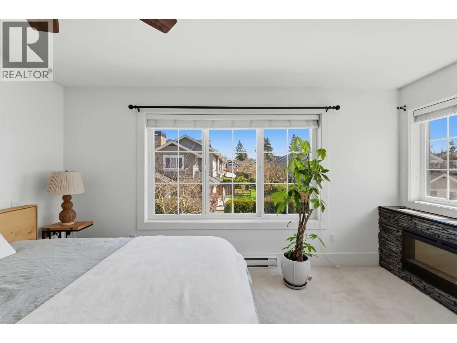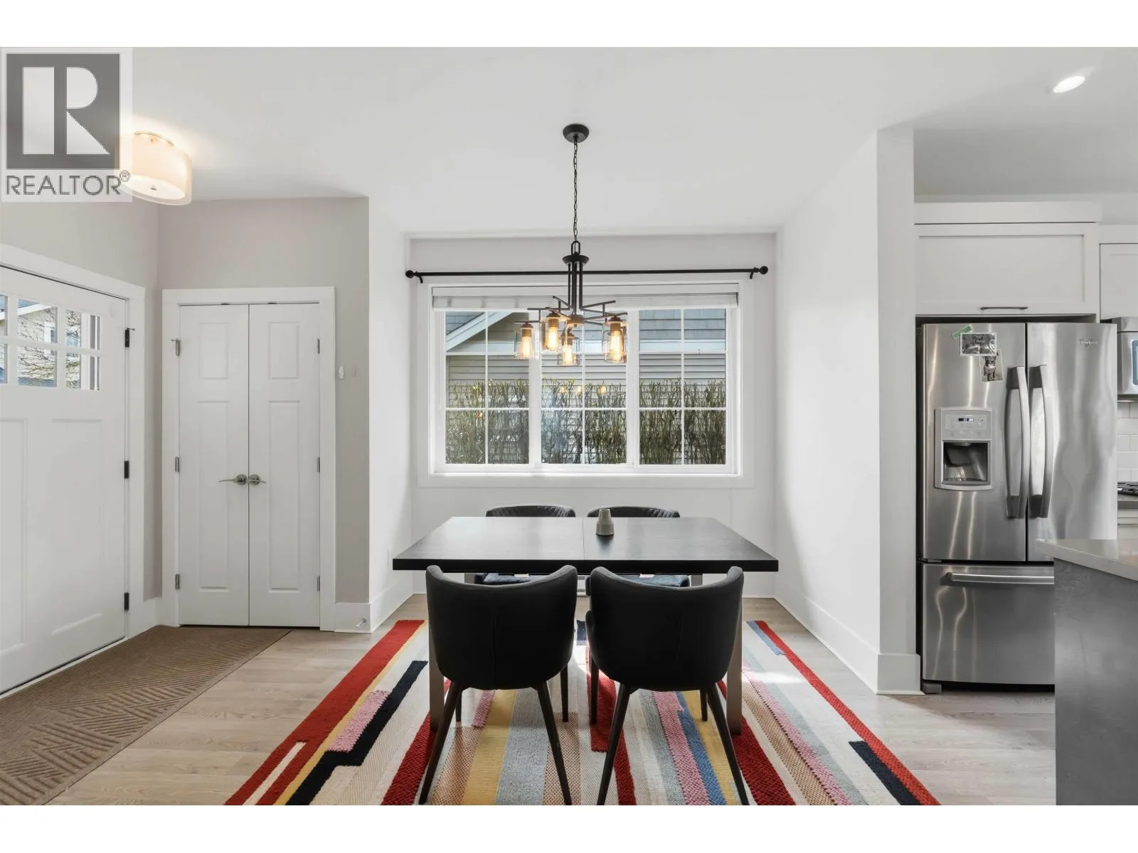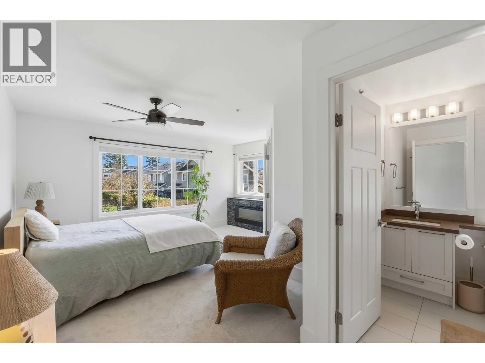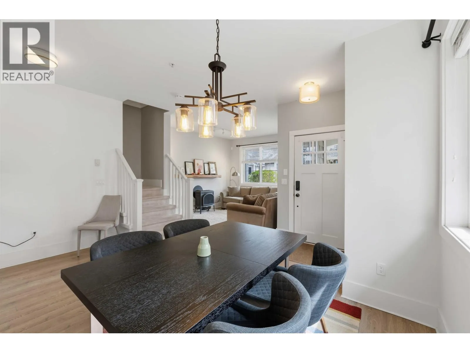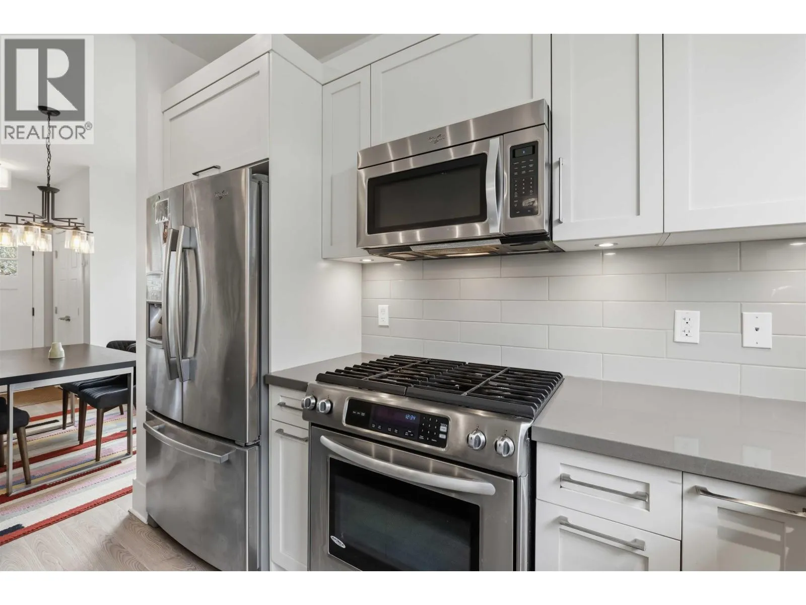 MODERN FINISHINGS, EVERYDAY CONVENIENCE, AND PEACEFUL TRANQUILITY! Gorgeous half duplex-style 3 bedroom, 2.5 bath townhome of approximately 1300 sqft in sought-after Village Green, backing onto treed space and agricultural ALR land. Fantastic main floor layout features a bright, gourmet shaker-style kitchen with ample cabinetry and quartz countertops, complete with island and stainless appliances. Spacious living rm with bonus free-standing gas fireplace for cozy evenings. 3 bdrms up incl spa-inspired primary with large windows and full ensuite. EV TESLA CHARGER INSTALLED! Enjoy treed views from the kitchen or while relaxing in the fenced yard or on the large west-facing patio with gas BBQ hook-up. Single car garage plus driveway. Close to schools, shopping, and transportation! THE COMPLETE PACKAGE (id:27476)