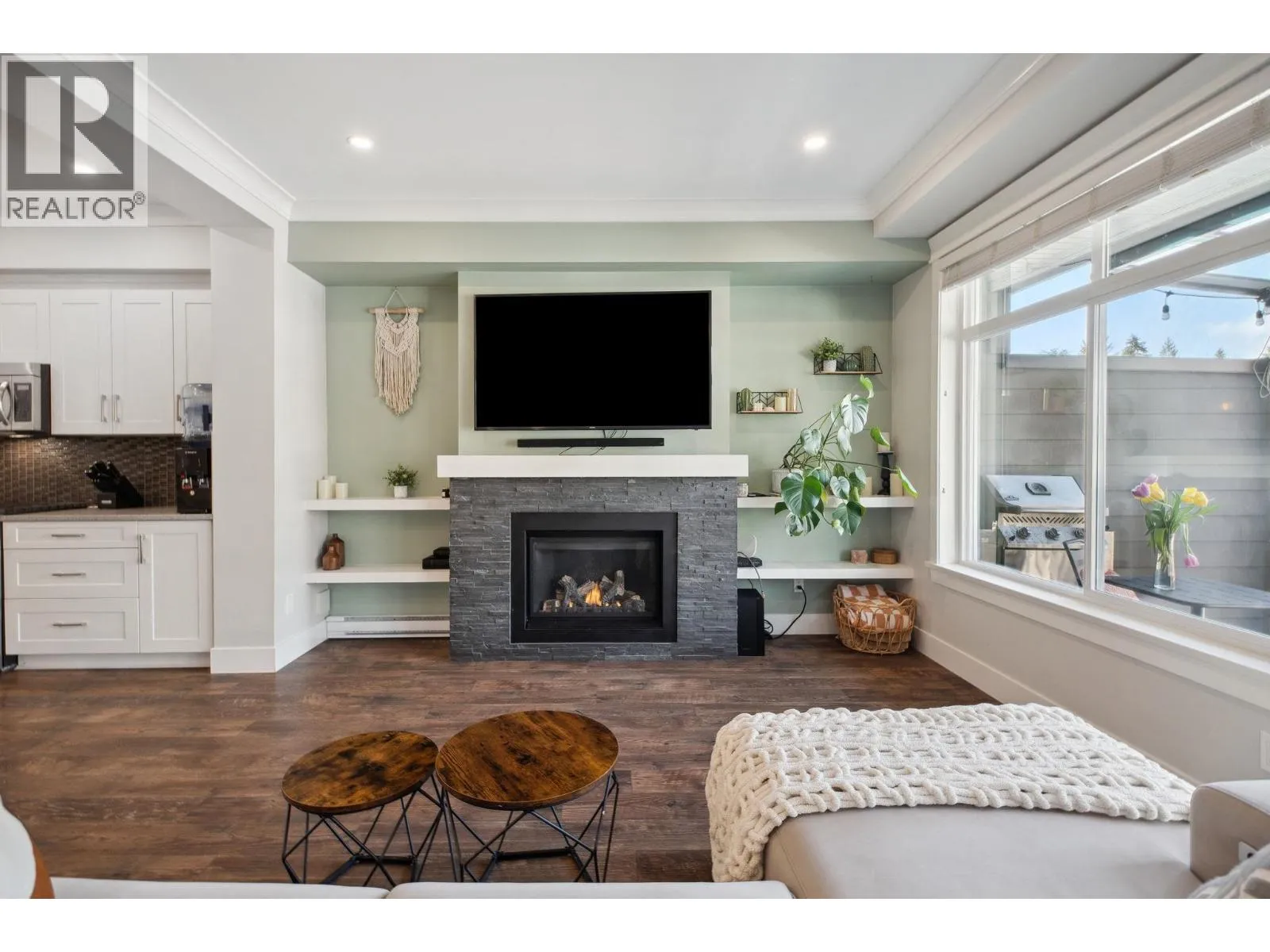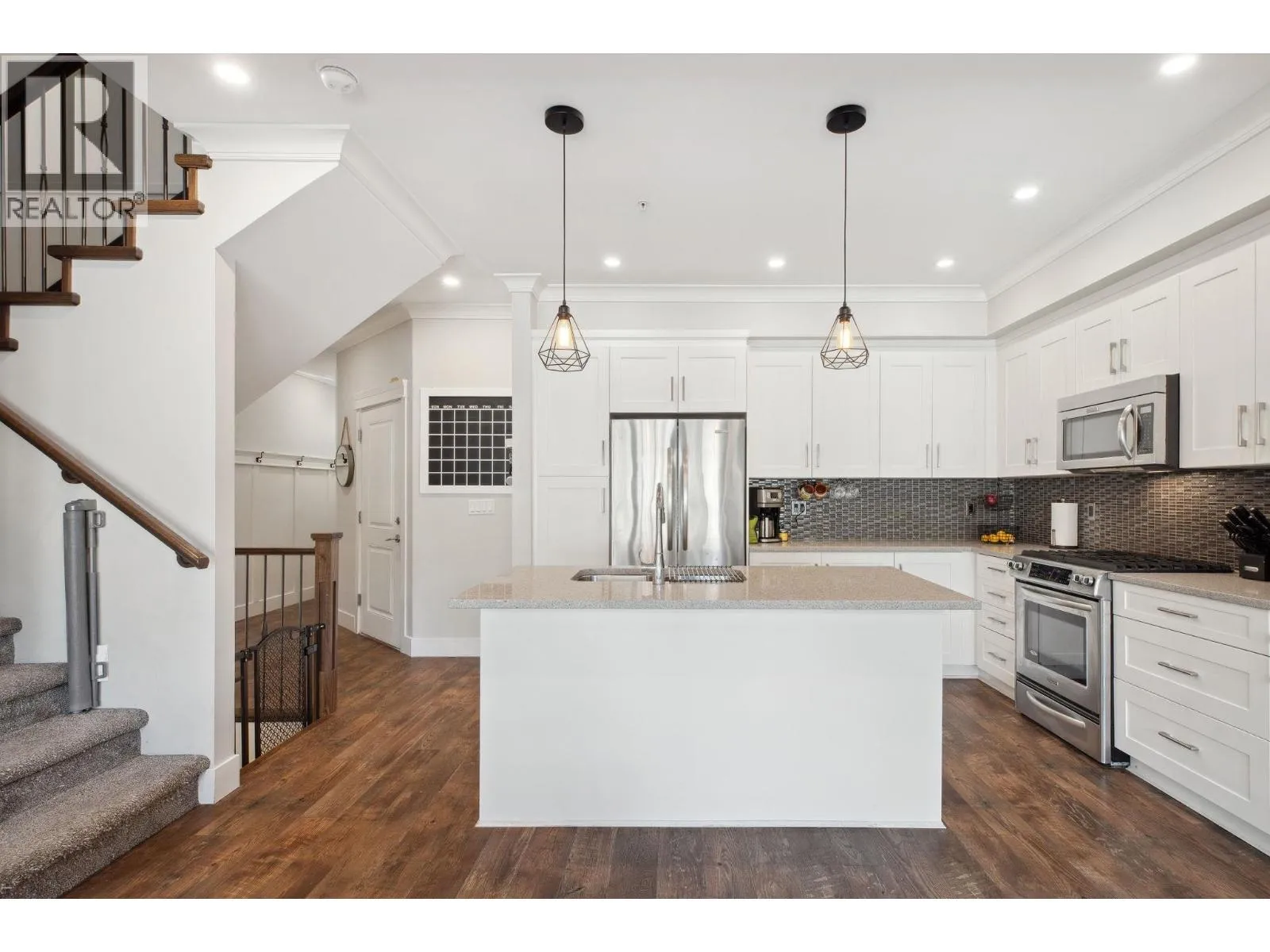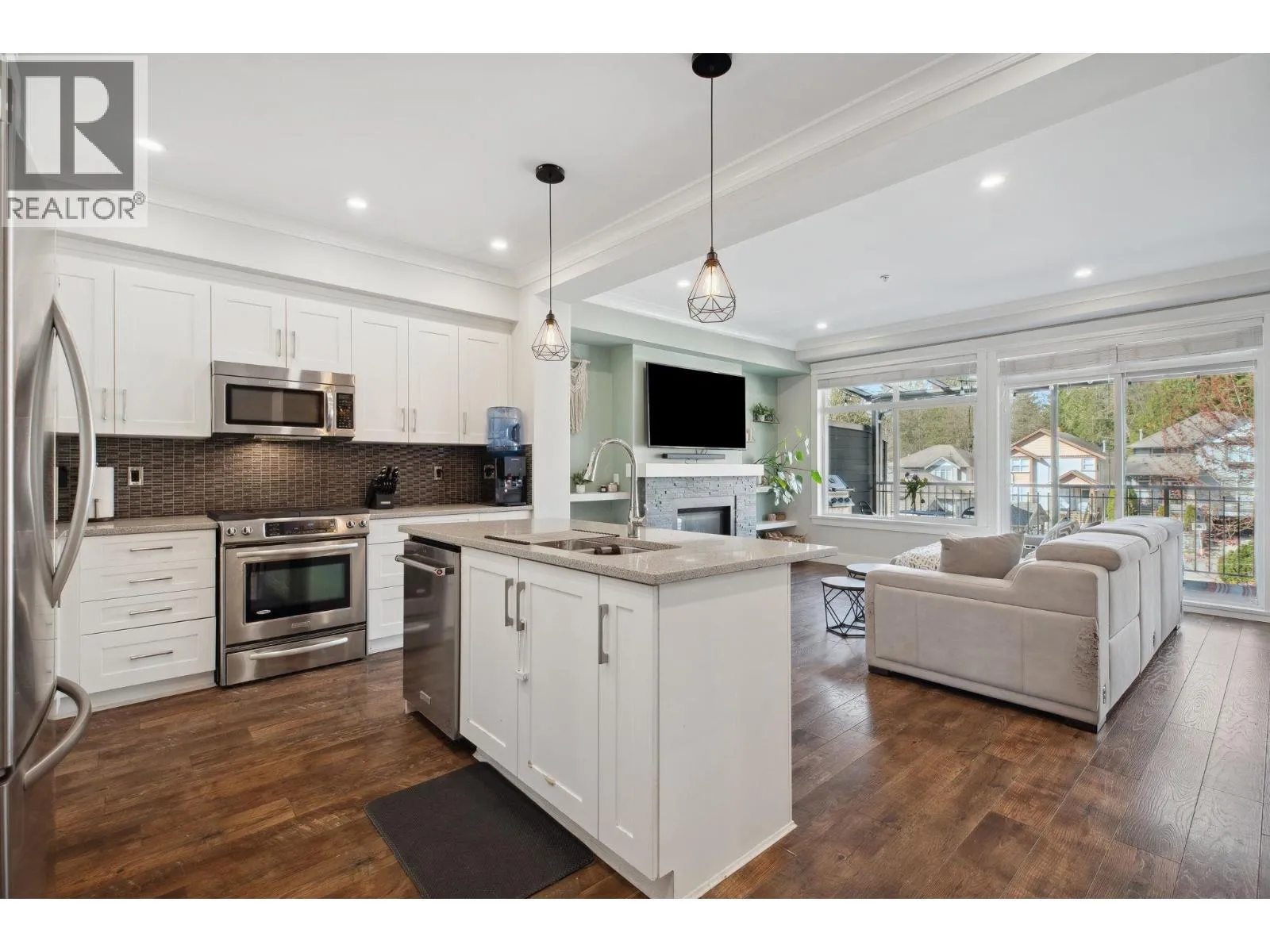 Sought-after Two Birds executive townhome by Wallmark Custom Homes! Over 2,200 square ft with 4 bedrooms and 4 baths. Bright, open main floor with wall-to-wall windows, gas fireplace, and spacious deck. Gourmet kitchen features white custom cabinetry, quartz counters, gas stove, Kitchenaid stainless steel appliances, and island with breakfast bar. Upstairs has 3 bedrooms including a primary with 5-piece ensuite and walk-in closet. Walk-out basement offers family room with custom bar, 4th bedroom, and full bath. High-end laminate flooring throughout. Fenced backyard, side-by-side double garage, and lots of visitor parking. (id:27476)