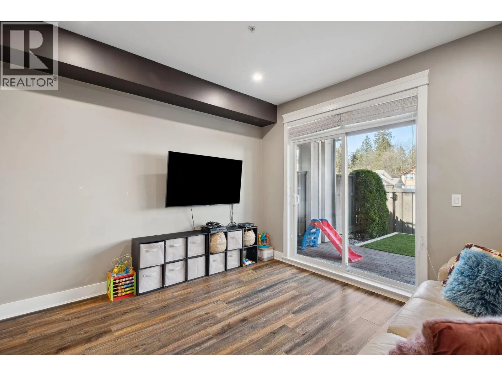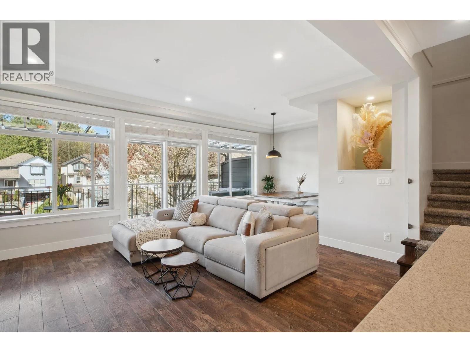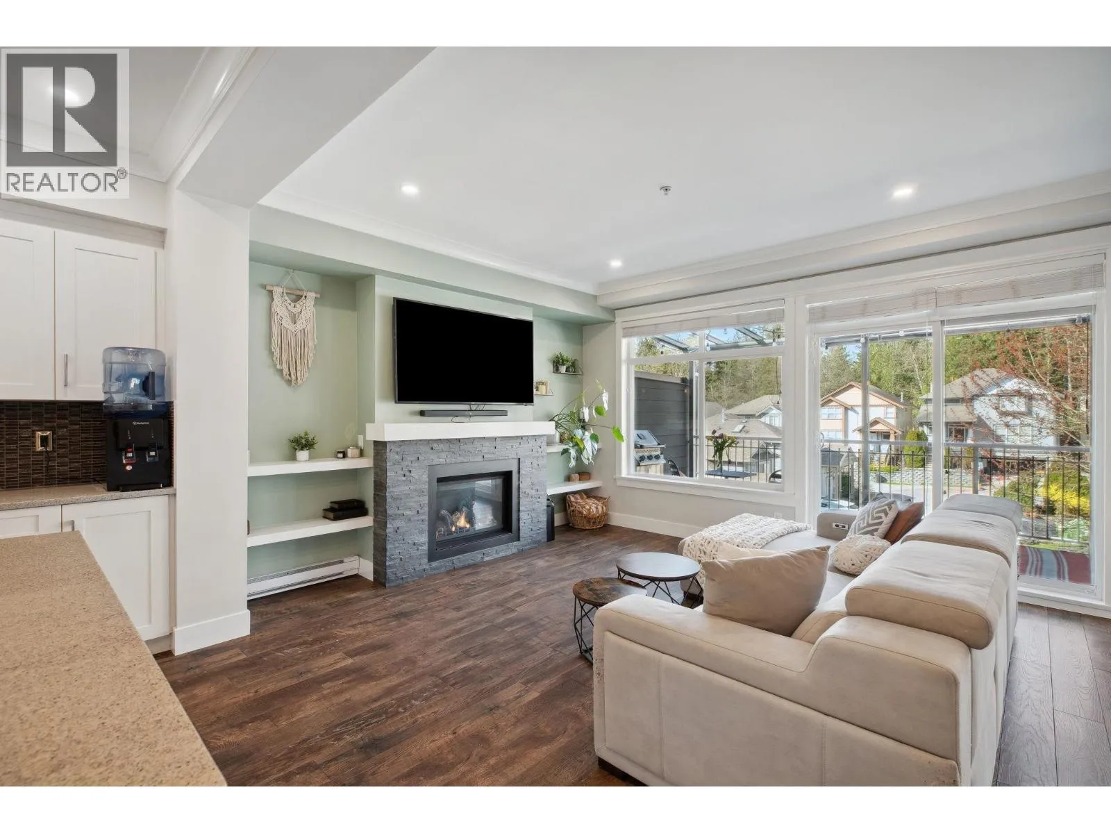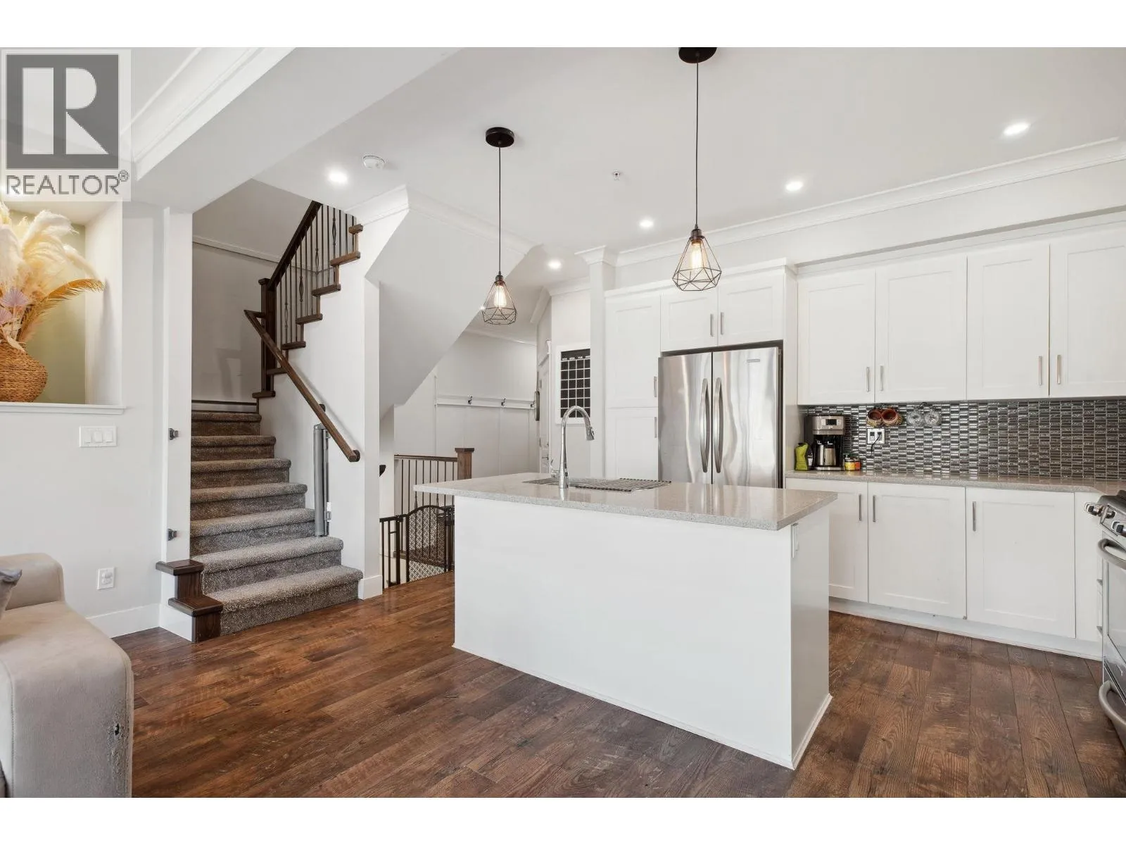 Sought-after Two Birds executive townhome by Wallmark Custom Homes! Over 2,200 square ft with 4 bedrooms and 4 baths. Bright, open main floor with wall-to-wall windows, gas fireplace, and spacious deck. Gourmet kitchen features white custom cabinetry, quartz counters, gas stove, Kitchenaid stainless steel appliances, and island with breakfast bar. Upstairs has 3 bedrooms including a primary with 5-piece ensuite and walk-in closet. Walk-out basement offers family room with custom bar, 4th bedroom, and full bath. High-end laminate flooring throughout. Fenced backyard, side-by-side double garage, and lots of visitor parking. (id:27476)